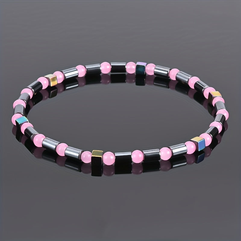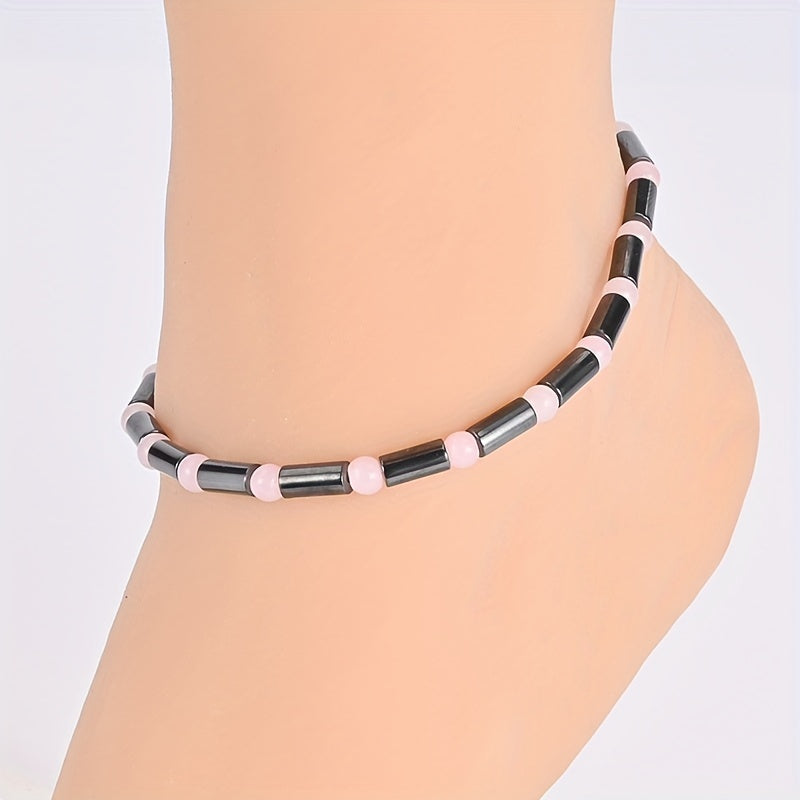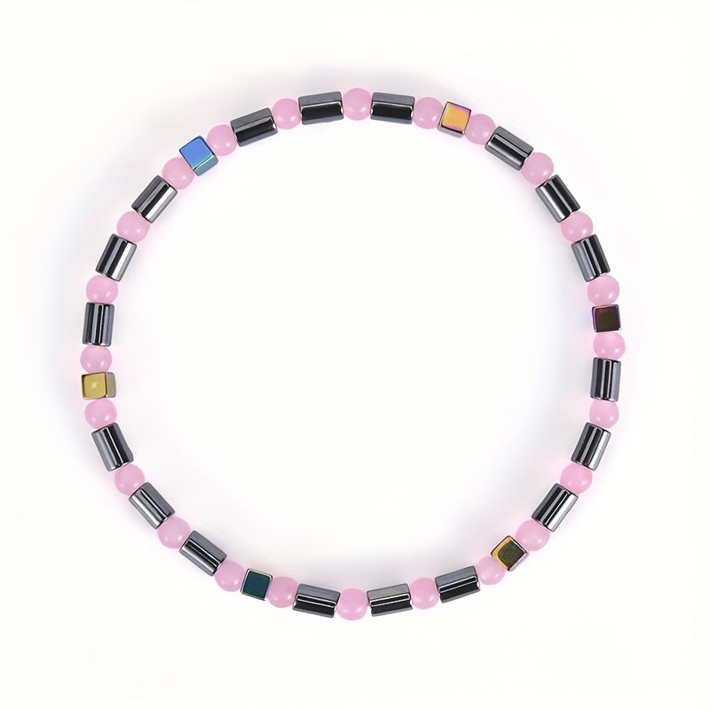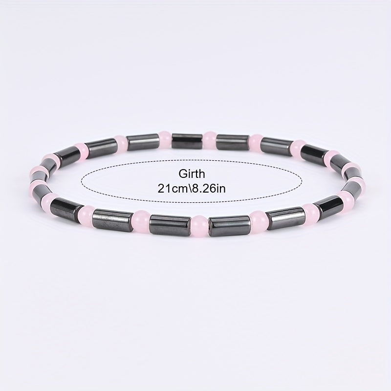 This anklet features pink beads and hematite stones designed to provide pain relief and promote overall well-being.