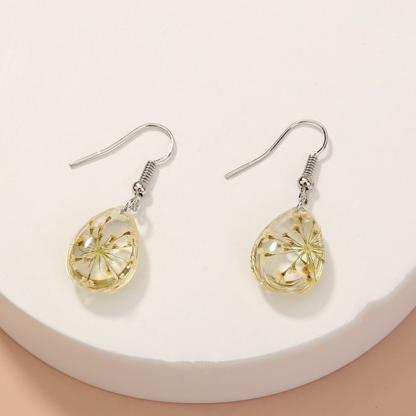Beautiful handmade dangle drop earrings featuring real daisy flowers preserved in resin. They are designed as round circle hooks for a unique and natural look.