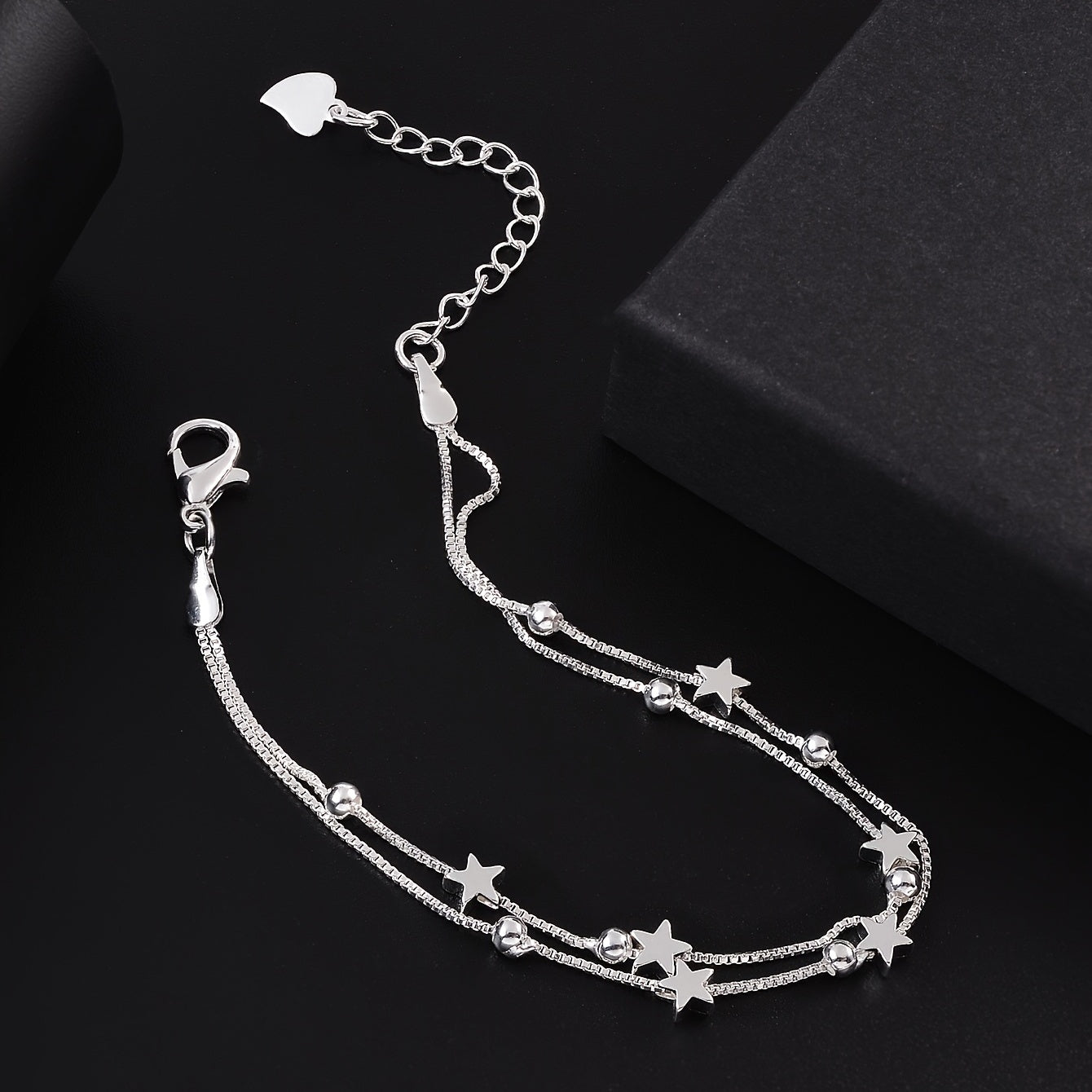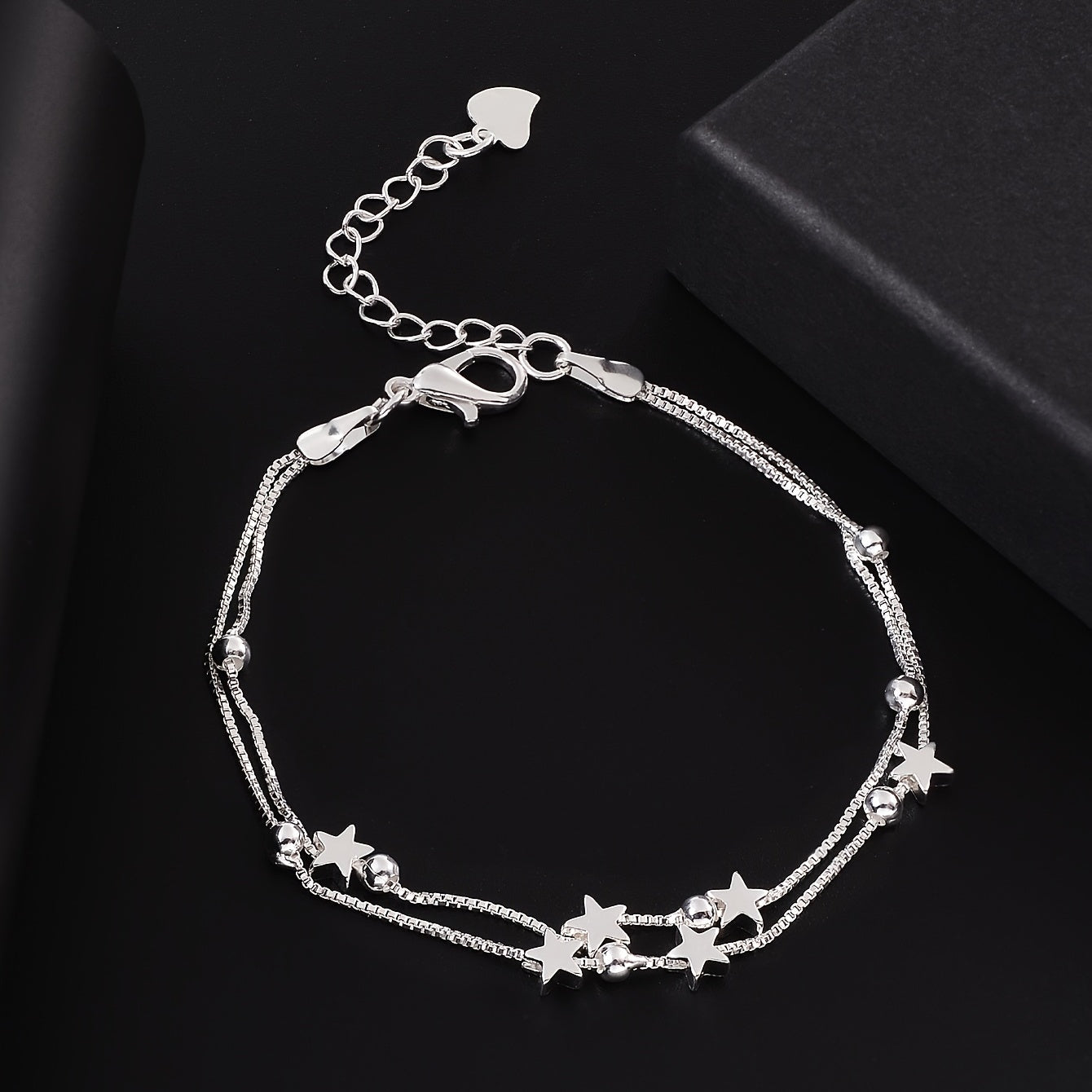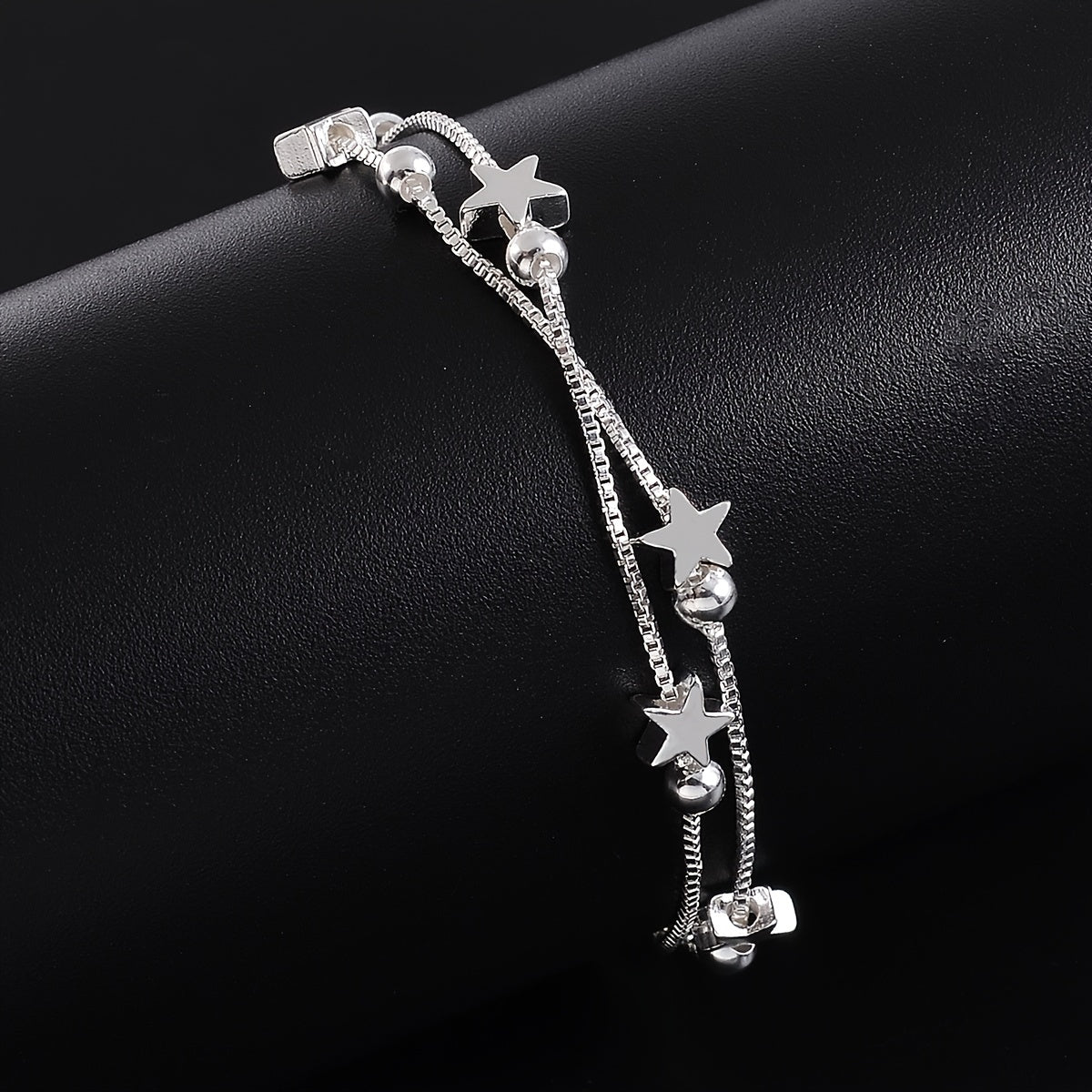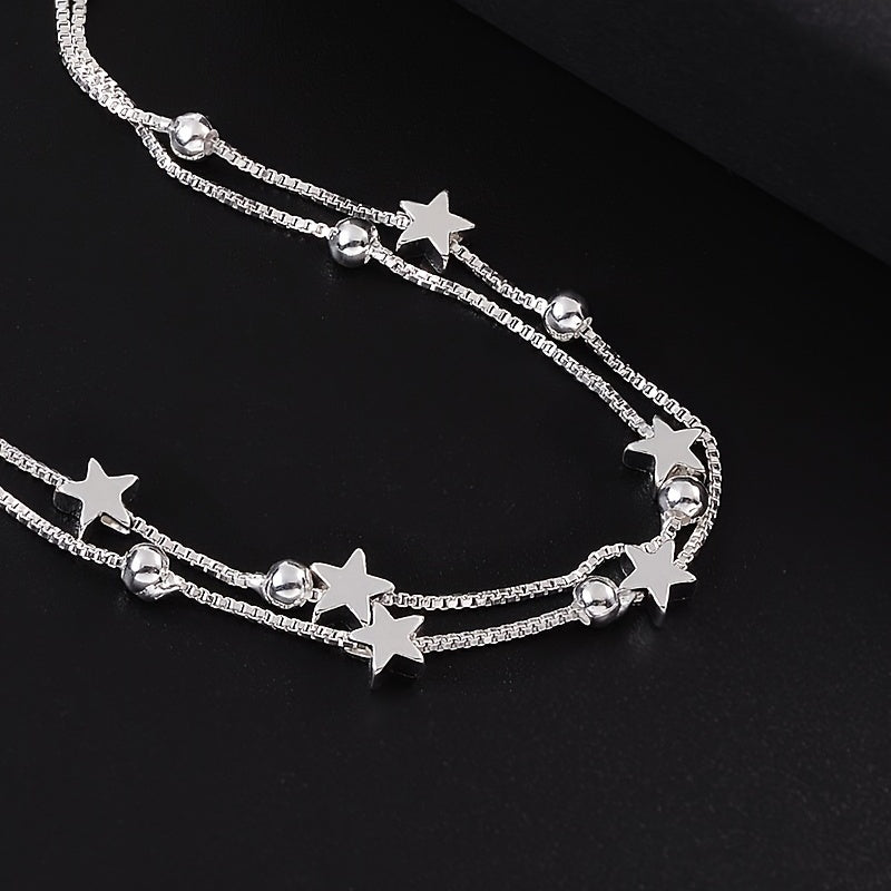 Elevate your style with this double layer bracelet featuring silver plated stars and beads. Perfect for adding a touch of sparkle to your outfit.