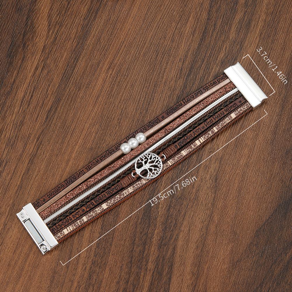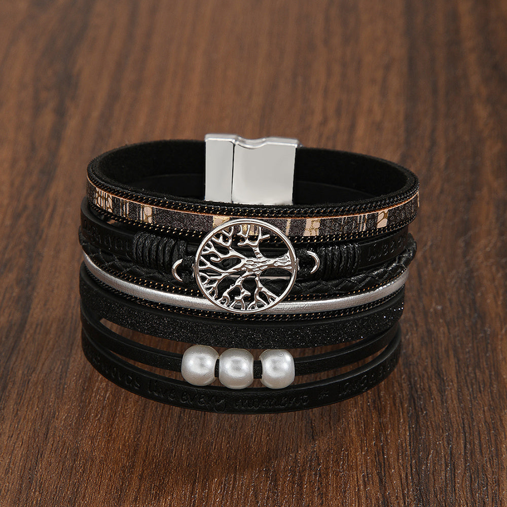 This stylish women's bracelet features a hollow tree of life design with pearl accents. Made from high-quality leather, it's a perfect accessory for any outfit.