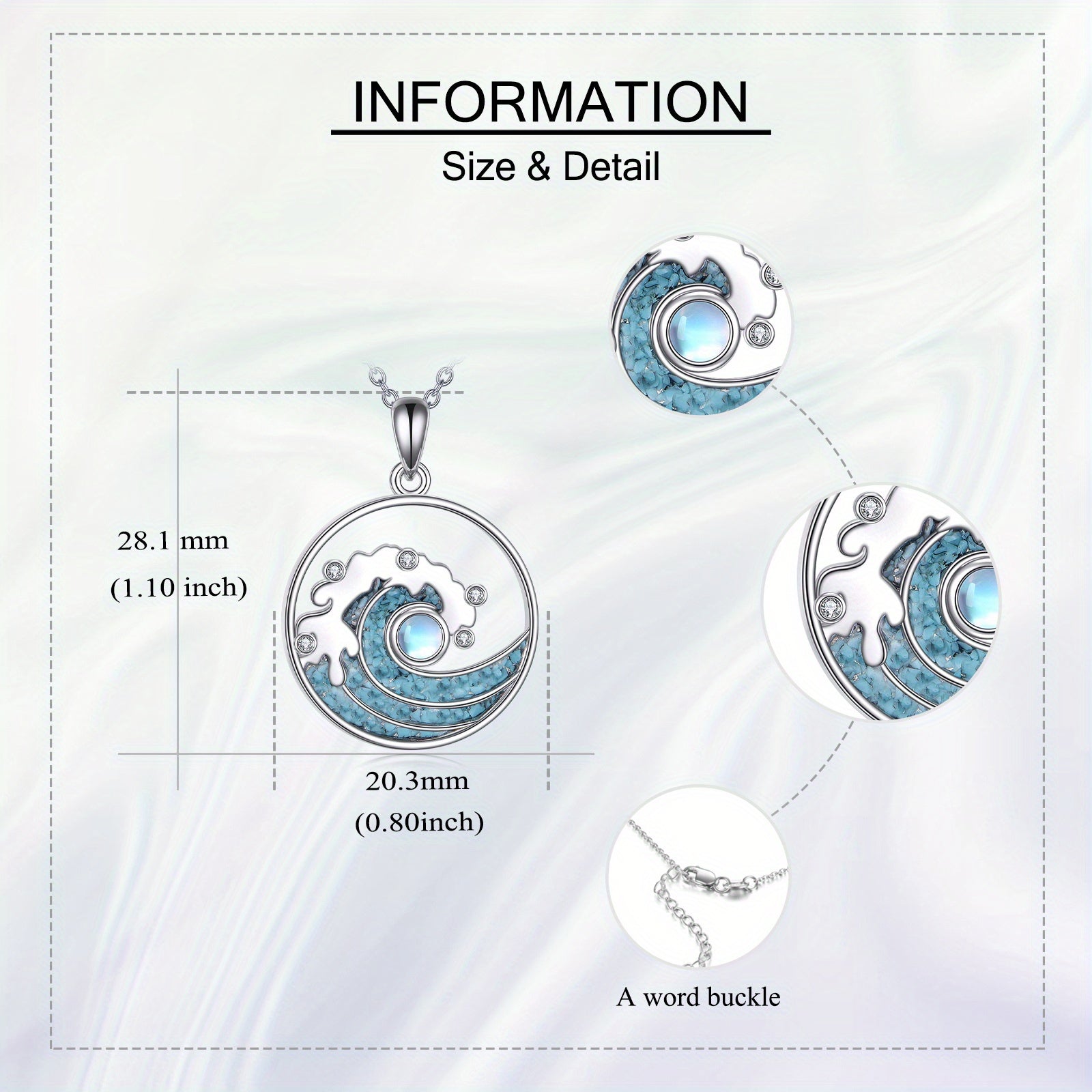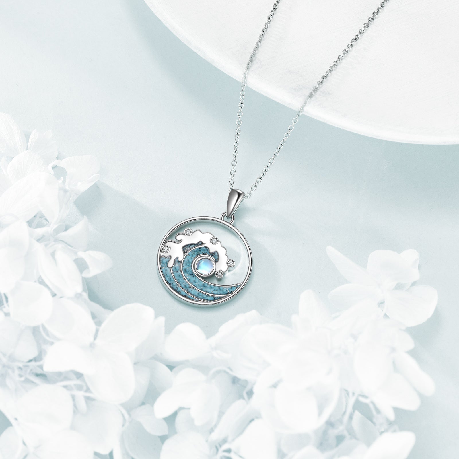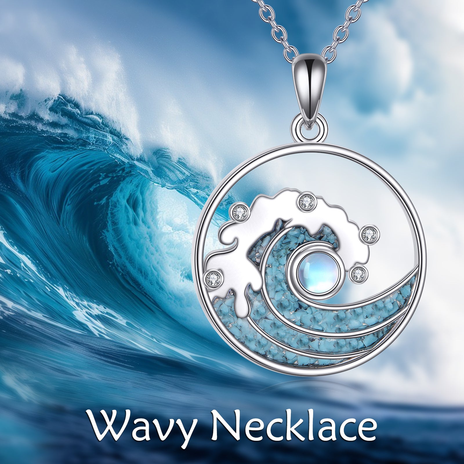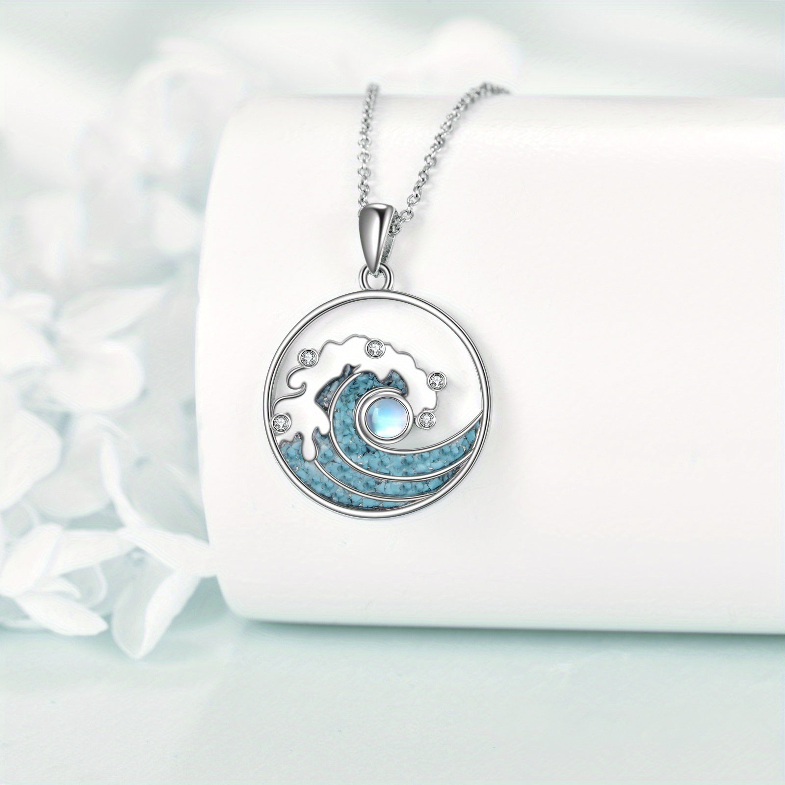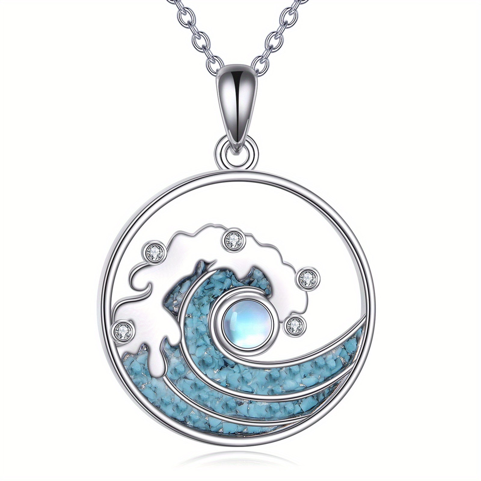 This beautiful necklace features a wave design with a 925 pure silver pendant adorned with synthetic moonstone and turquoise, making it a stunning piece of ocean-inspired jewelry. It is a perfect amulet gift for girls.