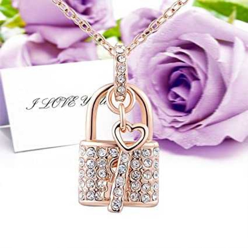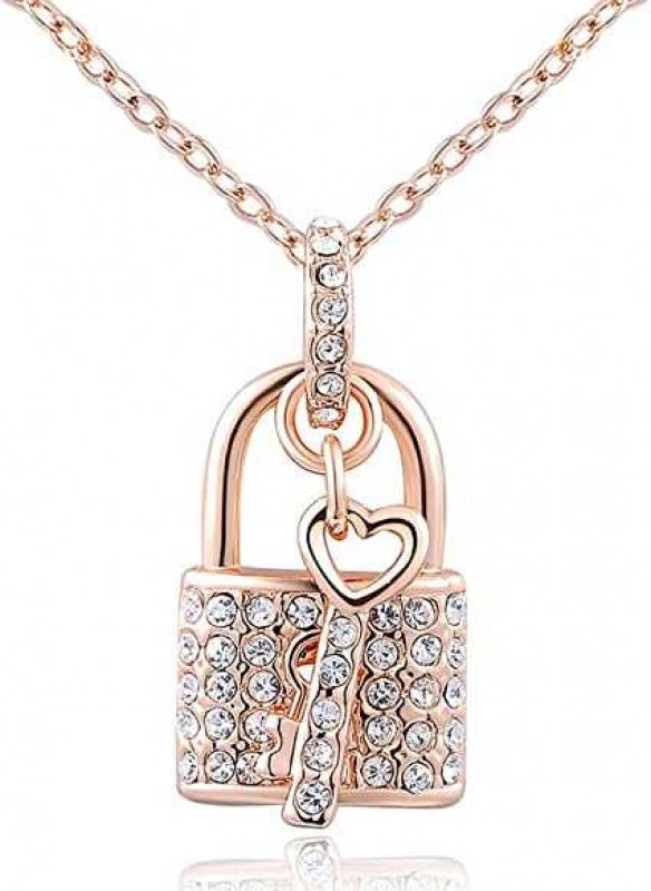 Women's Rose Gold Plated Lock and Key Zirconia Pendant Necklace