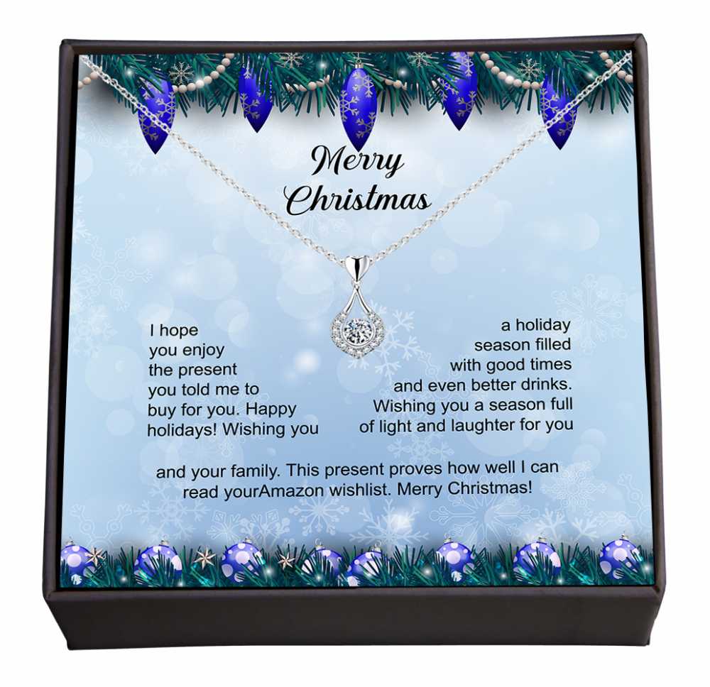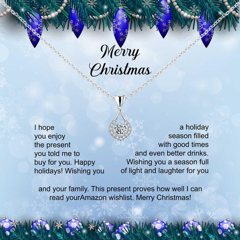 Elegant and refined, this women's silver plated water drop pendant necklace is crafted to capture grace and sophistication. The delicate pendant, shaped like a water drop, symbolizes purity and beauty, making it a perfect addition to any jewelry collection. Paired with a heartfelt message card for christmas wishes, this necklace is ideal for birthdays, anniversaries, or simply to show appreciation. A versatile piece that adds a touch of shimmer to any outfit, it’s a gift designed to be cherished. A graceful gift they’ll keep close to their heart and cherish for years to come.