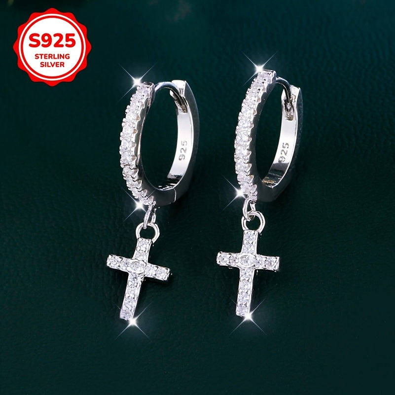 925 Silver Cross Hoop Earrings with Zirconia Inlay
