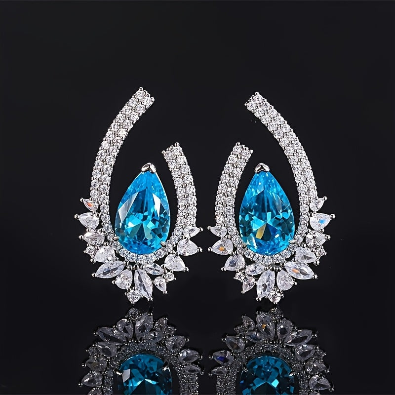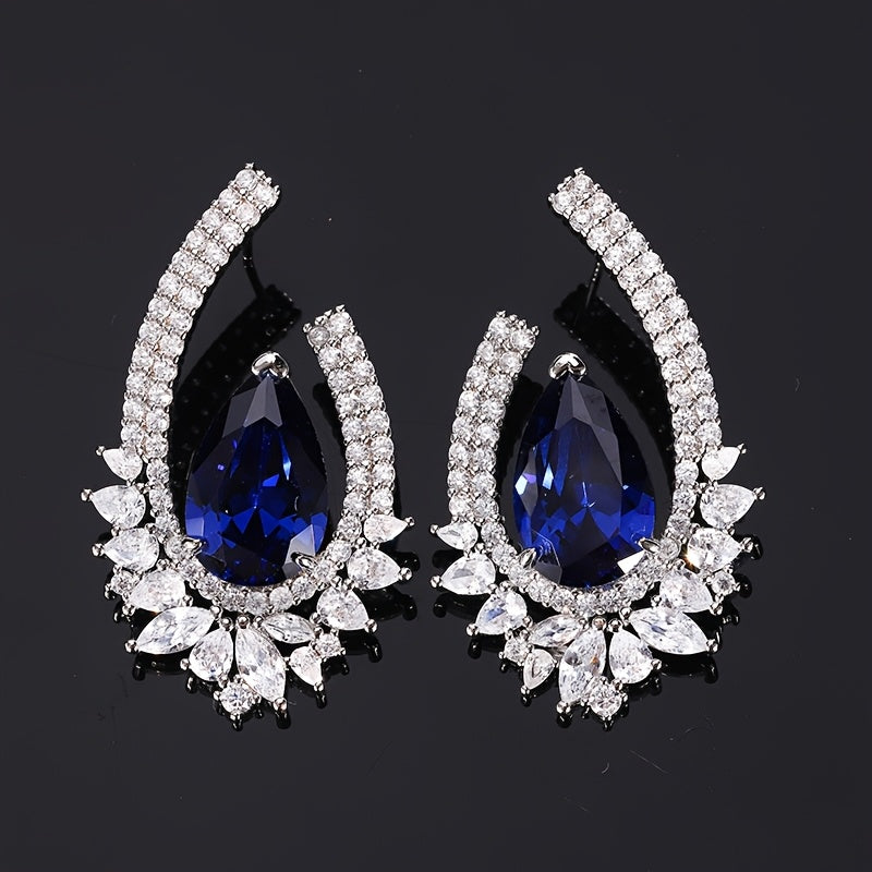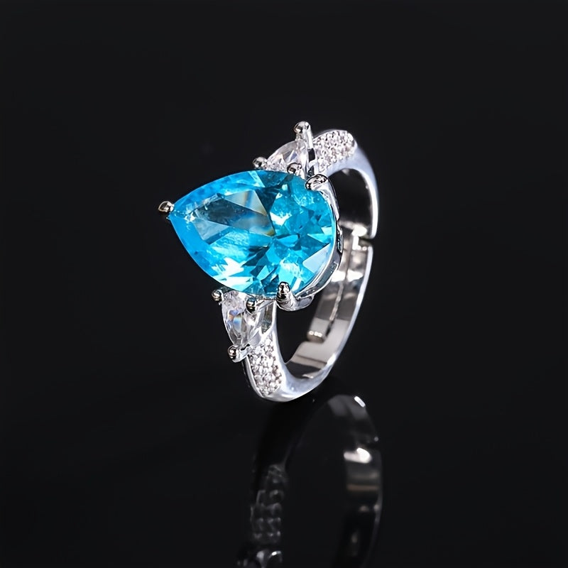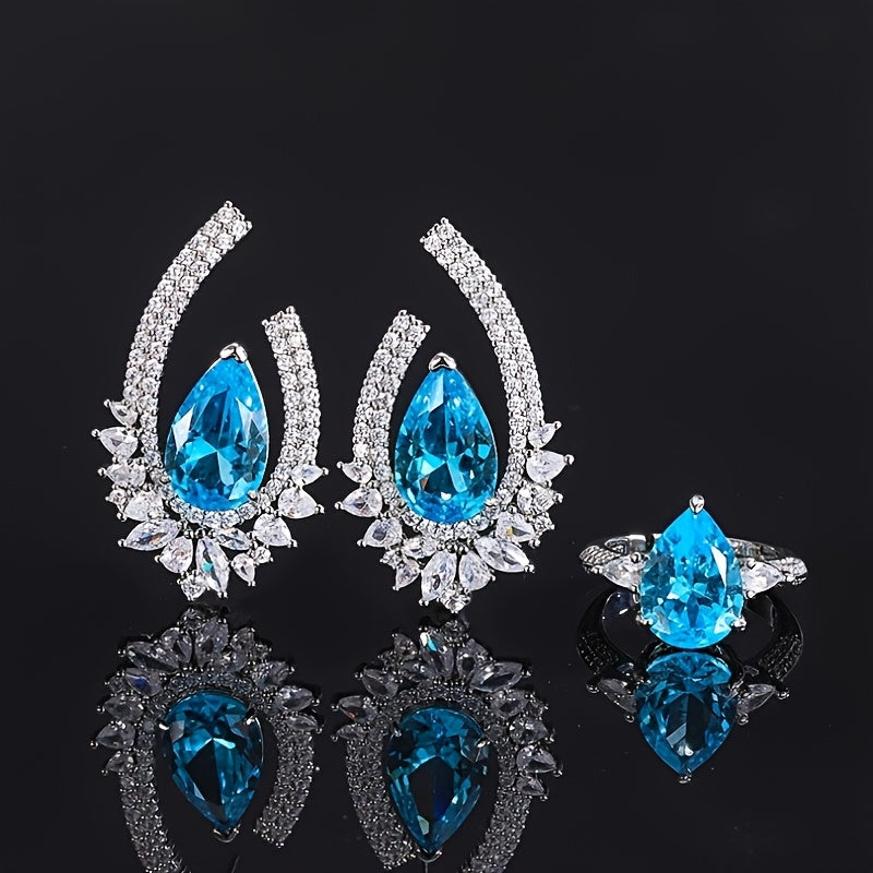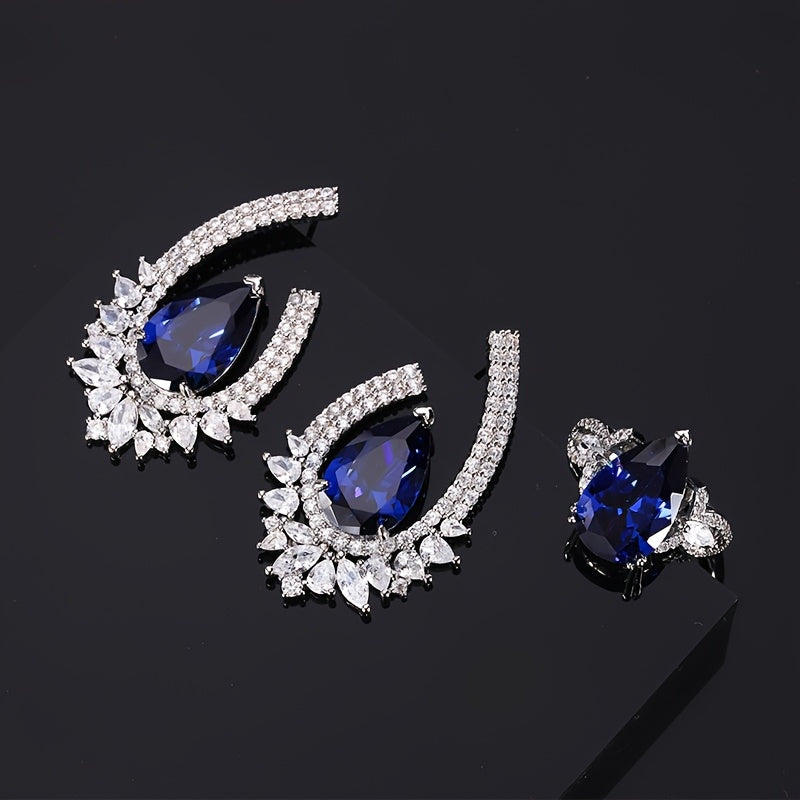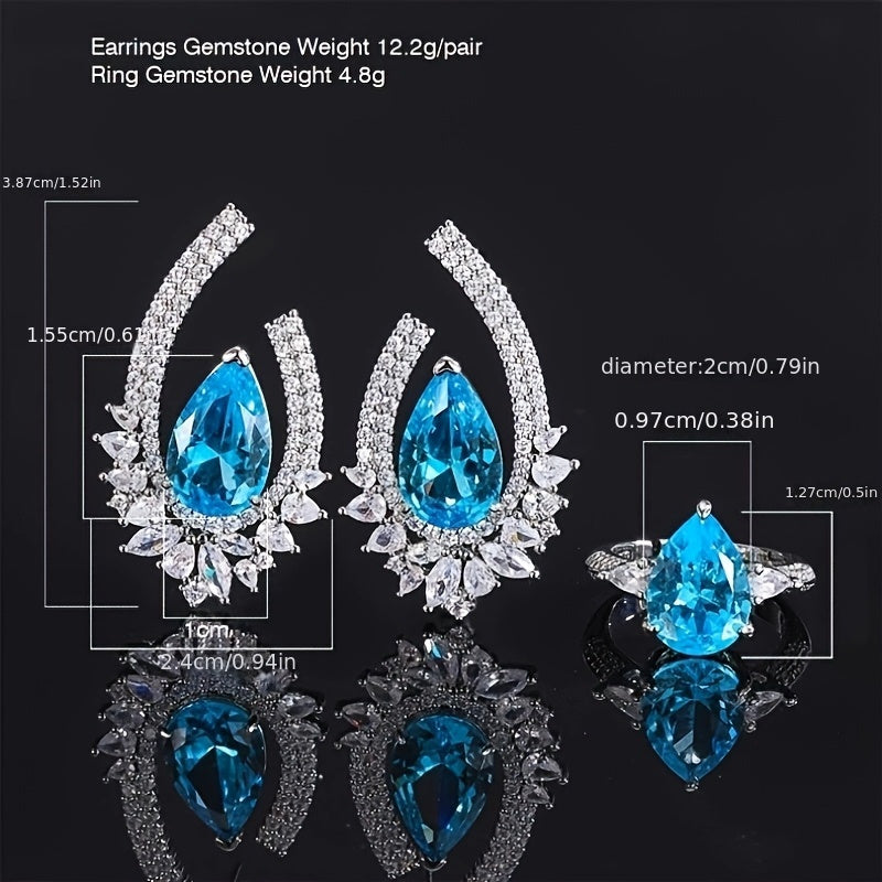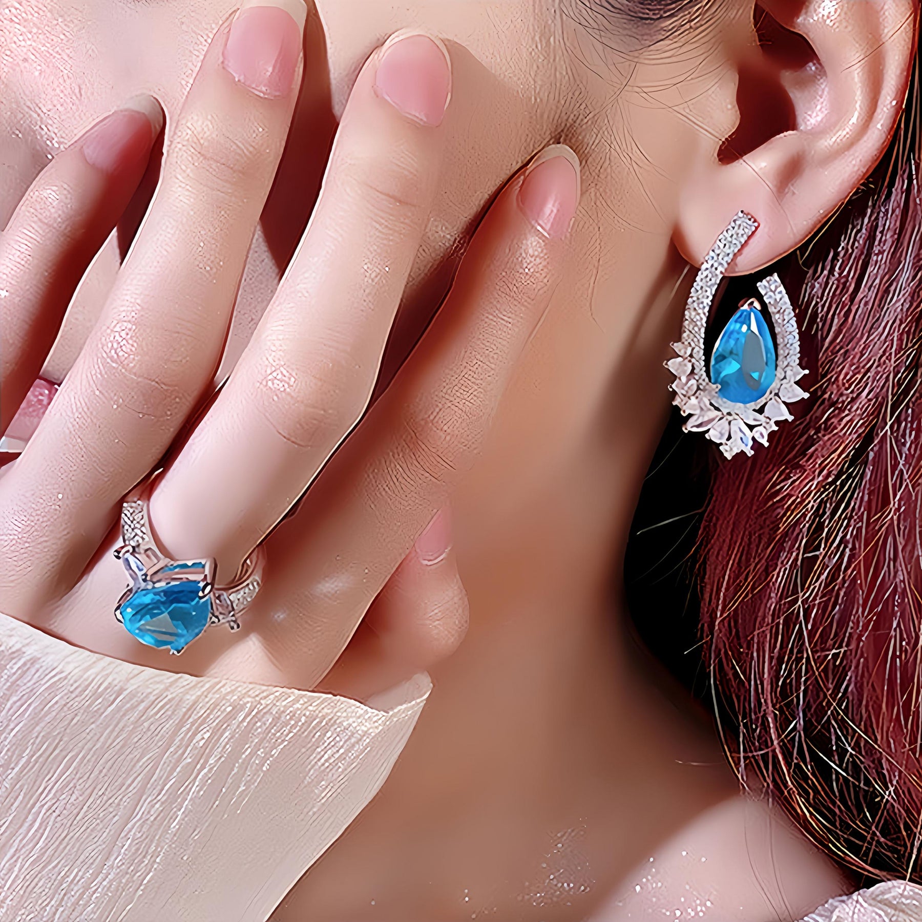 Beautiful set of jewelry for senior women featuring 925 silver earrings and adjustable ring with water drop shaped synthetic zirconia. Perfect gift for Mother's Valentine.