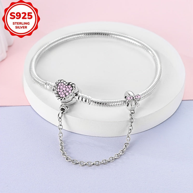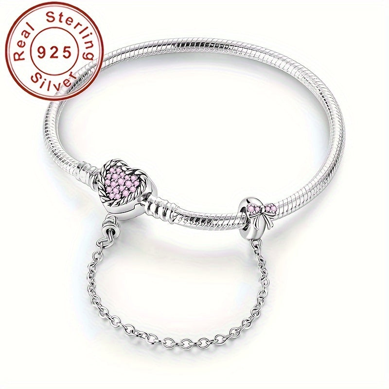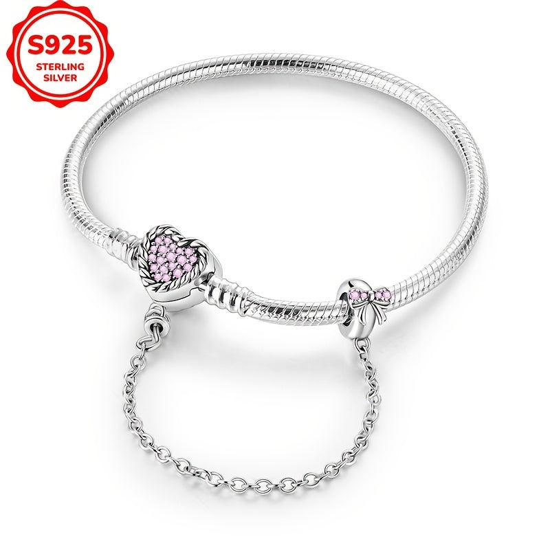 Elegant 925 silver snake bone bracelet featuring sparkling love and bow design. Perfect for daily wear and DIY charm beads. Ideal gift for women.