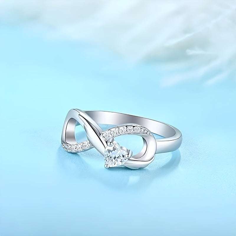 This stunning 925 sterling silver ring features an infinity design with paved shining zirconia stones. Perfect for engagements, weddings, or as a promise ring.