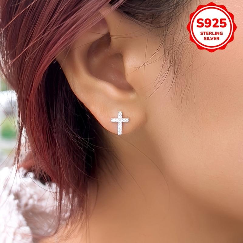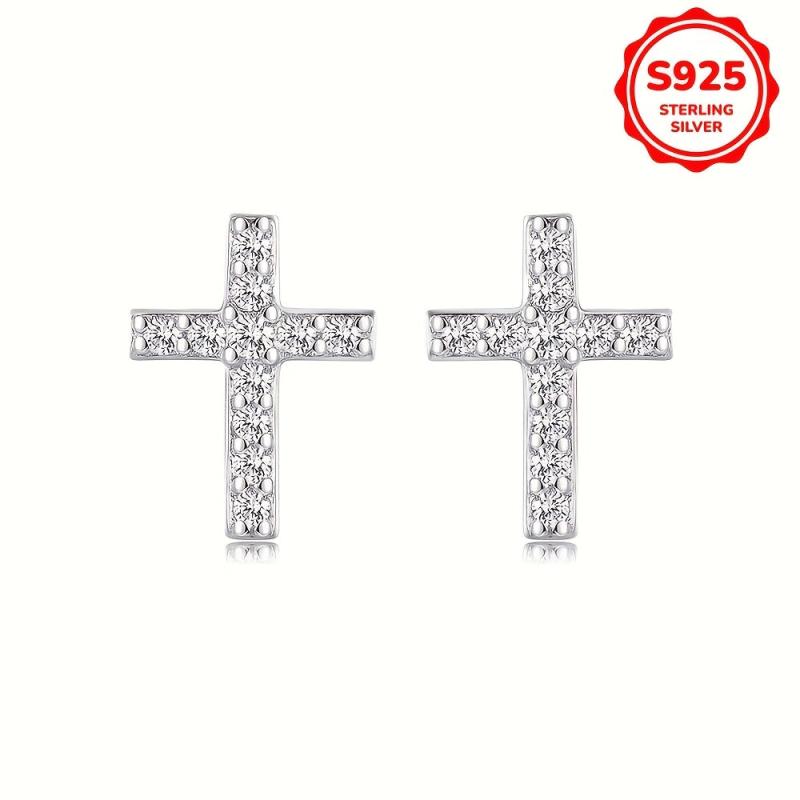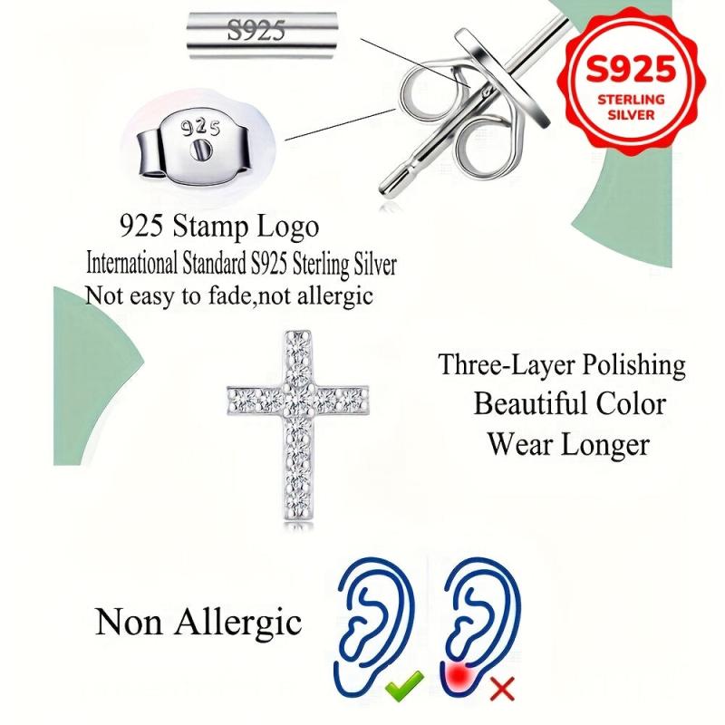 These minimalist stud earrings feature a sparkling cross shape with zirconia inlay. Made of 925 sterling silver, these hypoallergenic earrings are small and perfect for girls, men, and women.