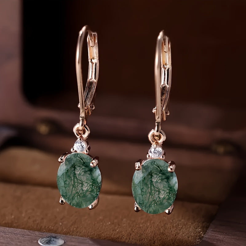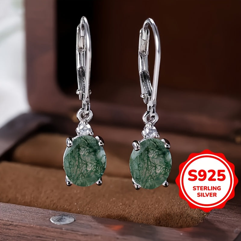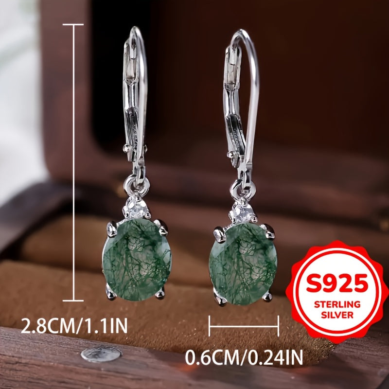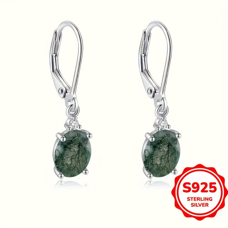Elegant pair of 925 silvery earrings with water grass agate in egg shape. Suitable for daily wear and party decoration. High quality jewelry.