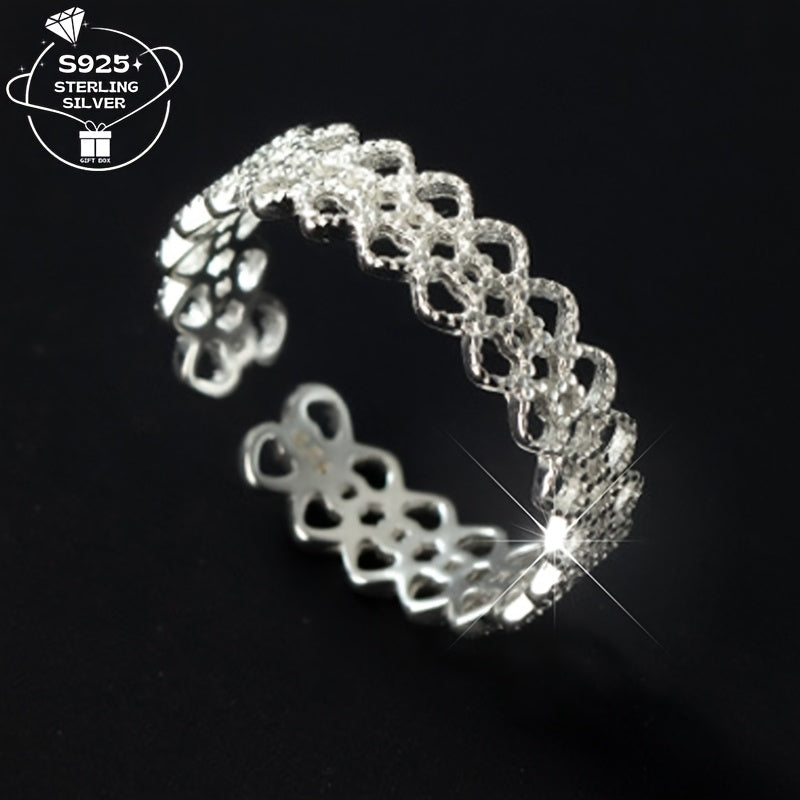 This 925 sterling silver ring features an elegant lace edge design, perfect for daily wear or parties. It is adjustable to fit most finger sizes. Weighs 1g.