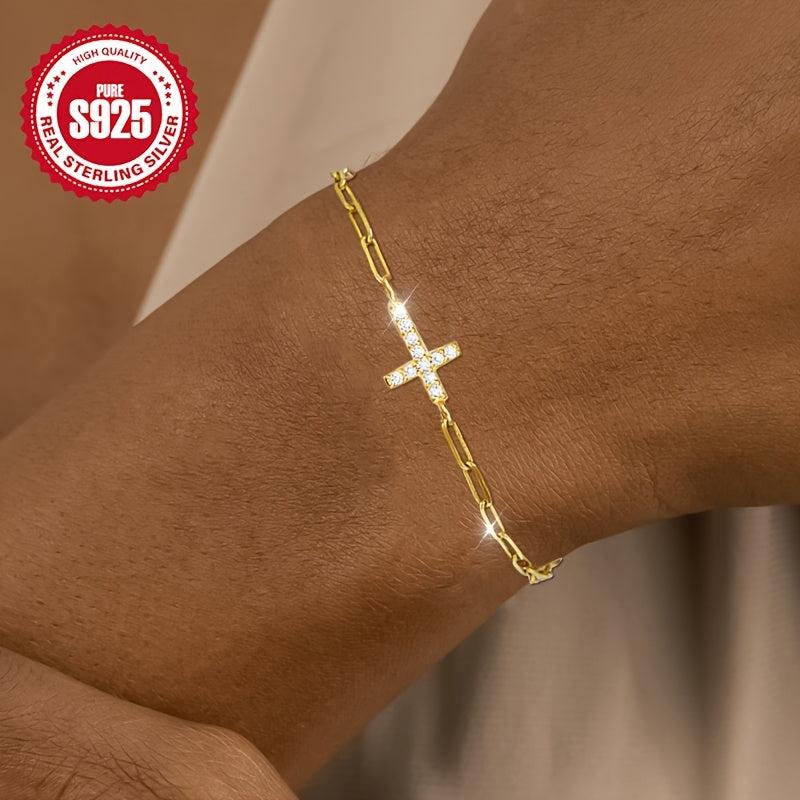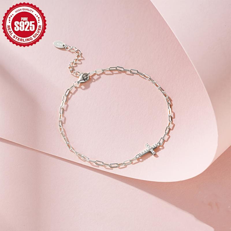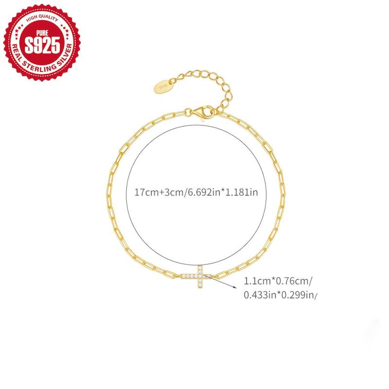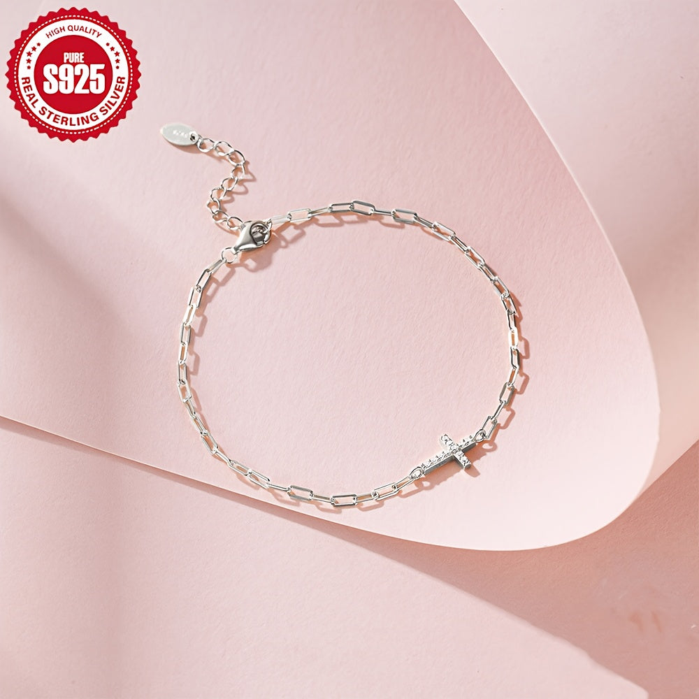 This sterling silver s925 bracelet features a cross design with synthetic zirconia for a glittery effect. It is silver plated, hypoallergenic, and lightweight at 1.92g, making it a perfect gift for women to wear daily.