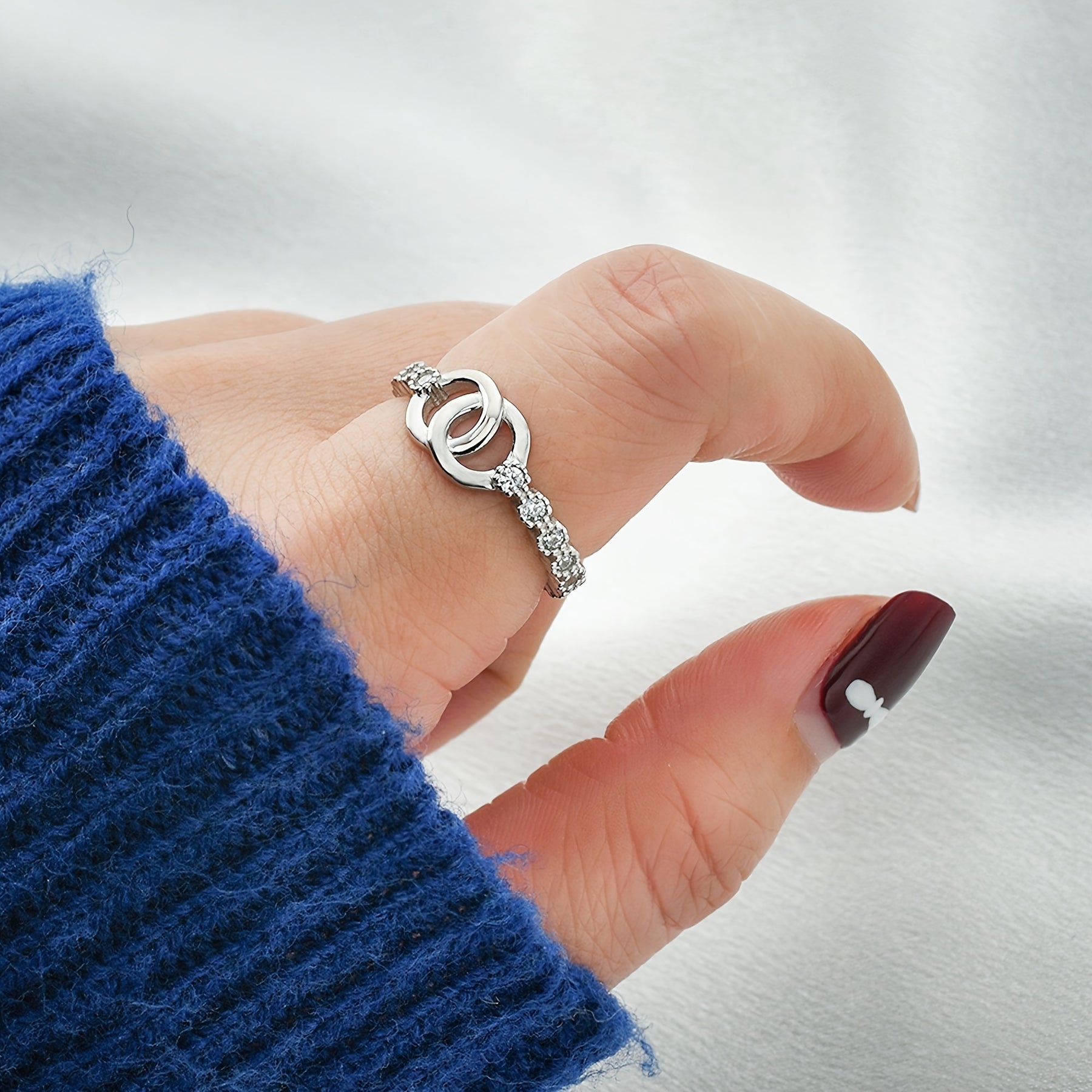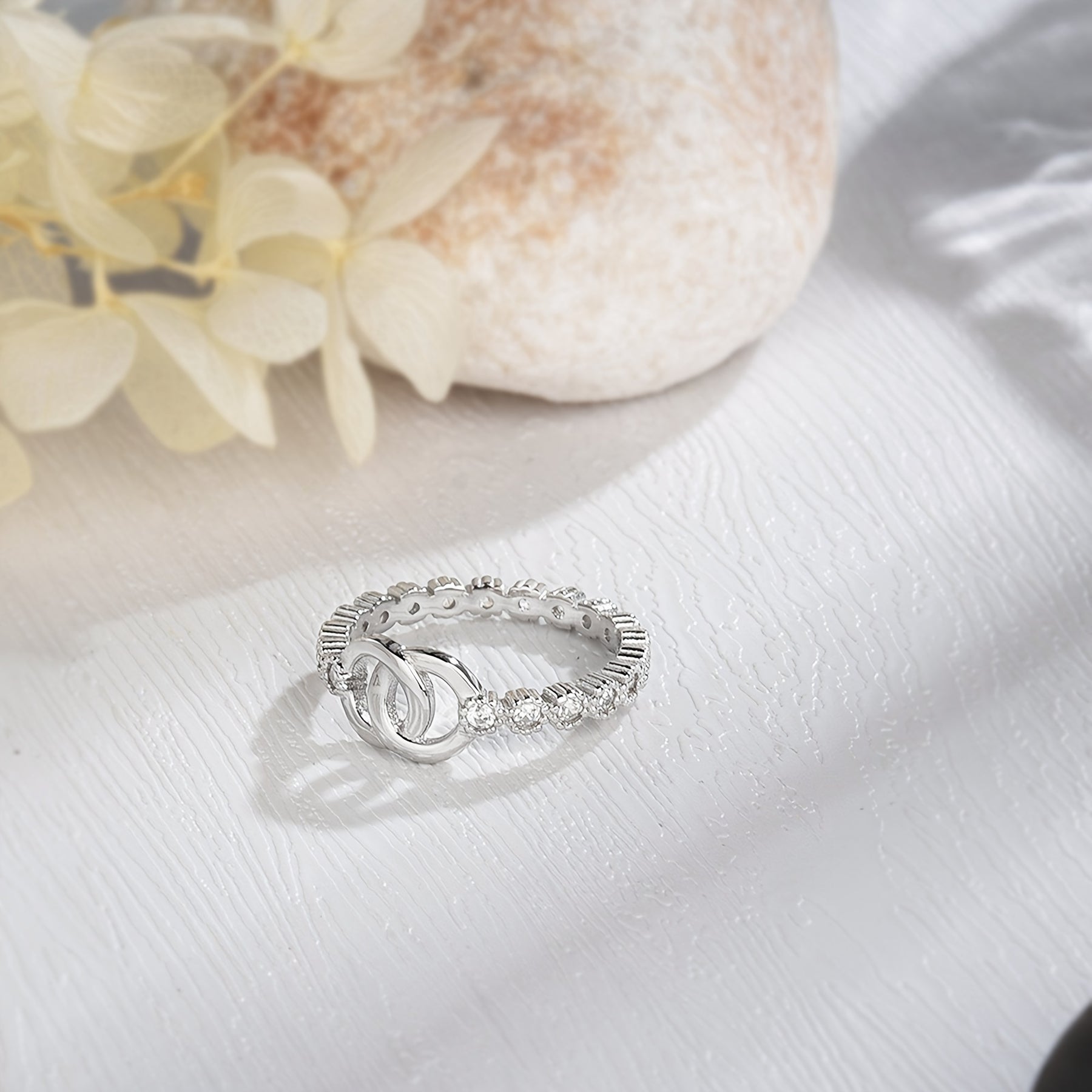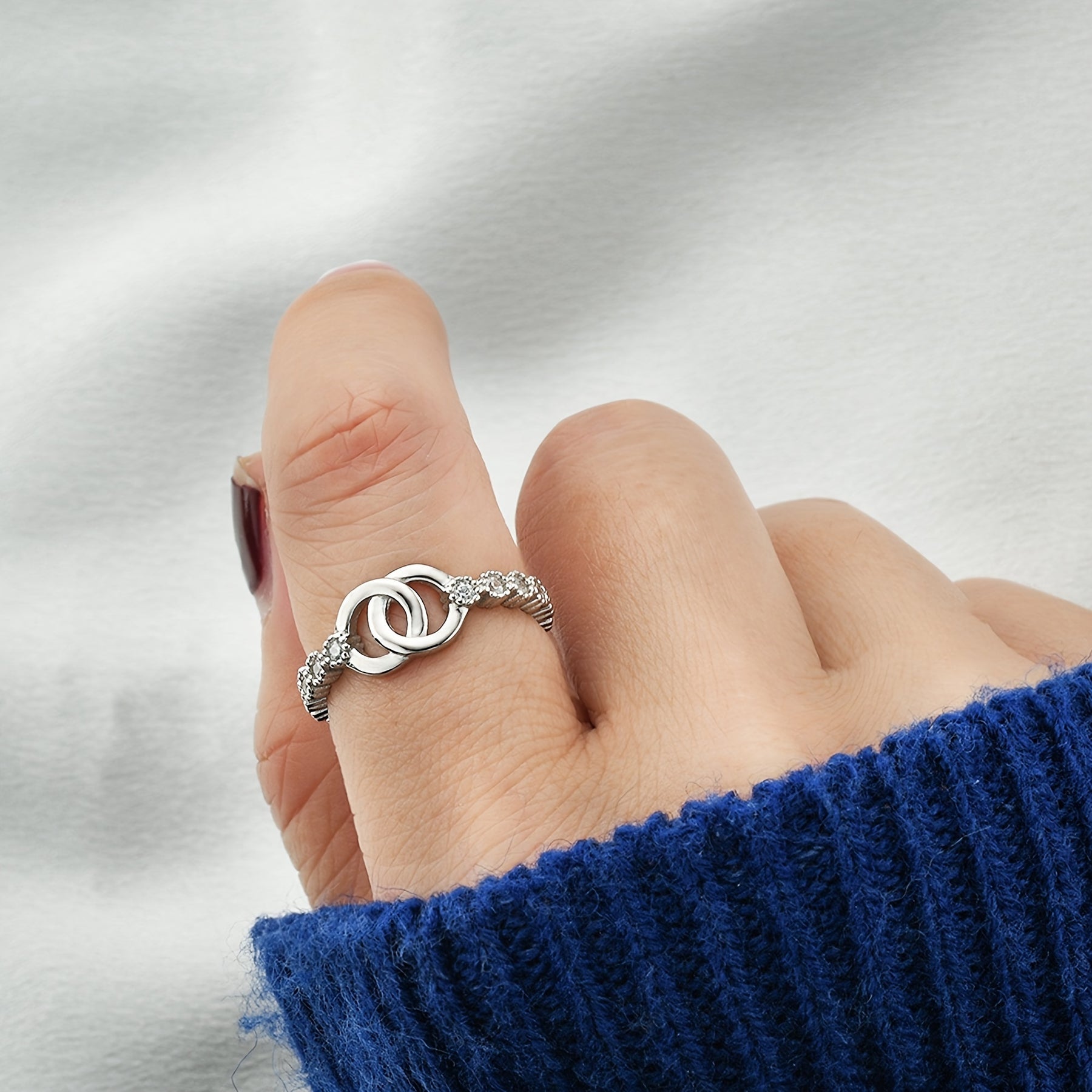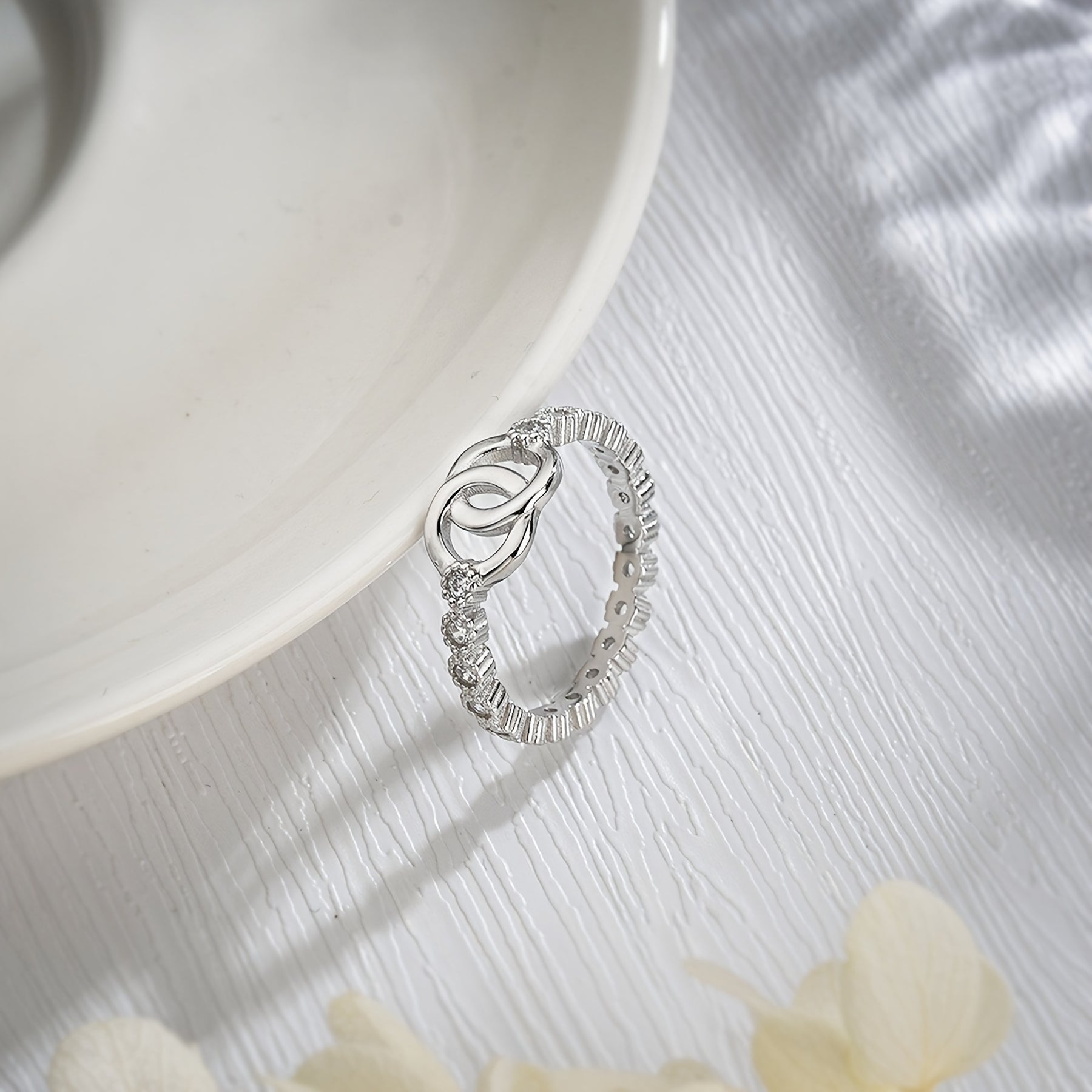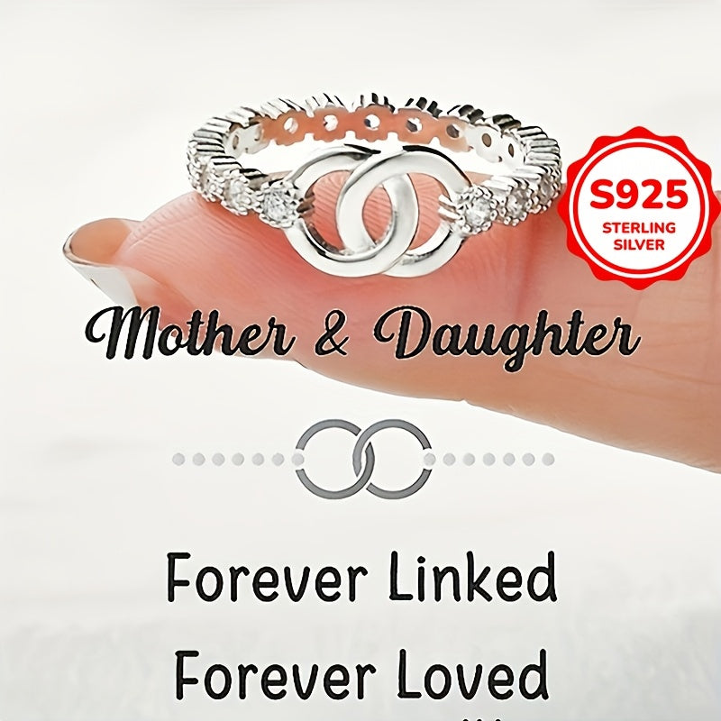 This beautiful ring features an interlocking design symbolizing the eternal bond between a mother and daughter. Made of sterling silver with sparkling pave accents, it makes a perfect gift for birthdays, Christmas, or weddings.