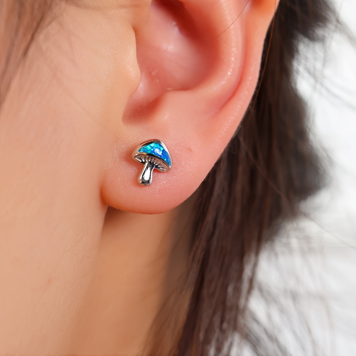 Elevate your style with these stunning opal inlaid mushroom stud earrings crafted from hypoallergenic 925 sterling silver, perfect for sensitive skin and a unique persona.