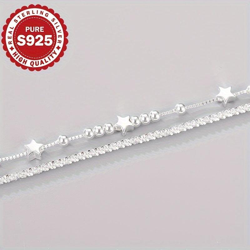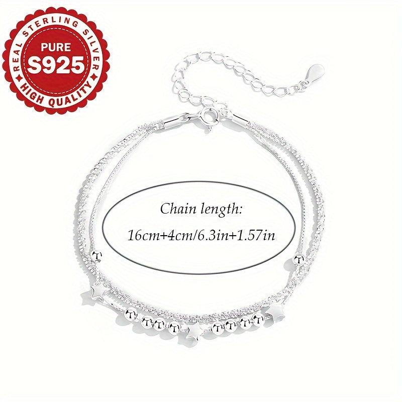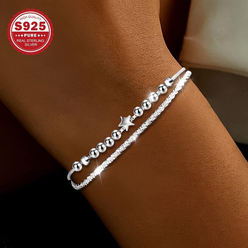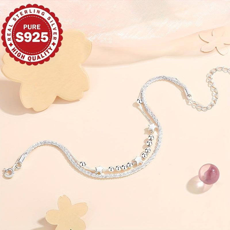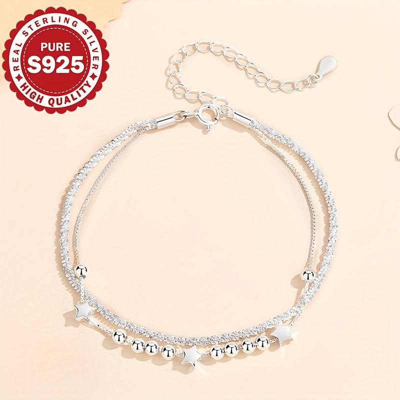 This S925 sterling silver double layered bracelet features star and bead accents, making it a trendy and stylish addition to any outfit. It is hypoallergenic and lightweight at 5g, perfect for daily wear or as a gift. Embrace urban style with this versatile piece.