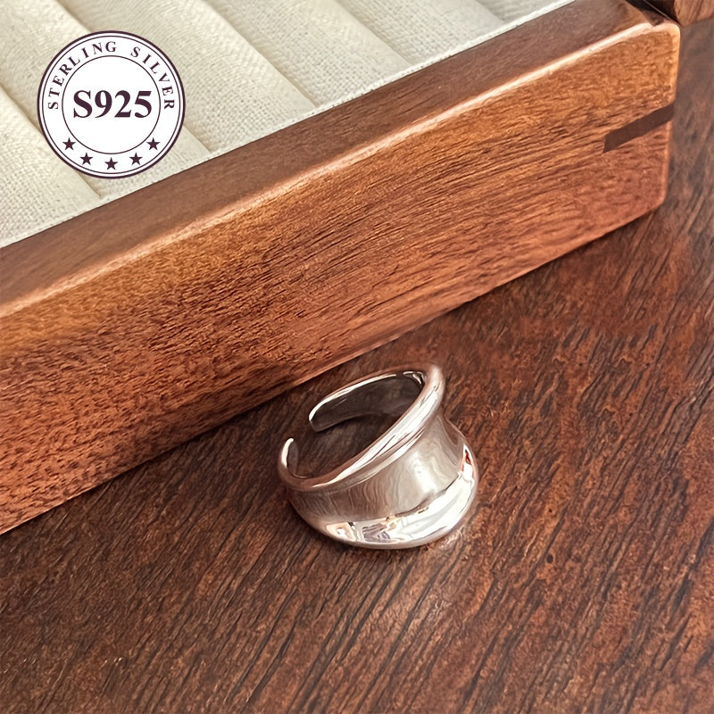 This S925 ring features a geometric minimalist design with a curved glossy finish. It is a wide open ring with an adjustable opening, suitable for daily wear and versatile styling for both men and women.
