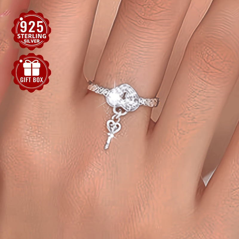 This S925 Pure Silvery Women's Ring features a key, lock, heart-shaped lock design with zirconia inlay. Weighs about 2-3g.