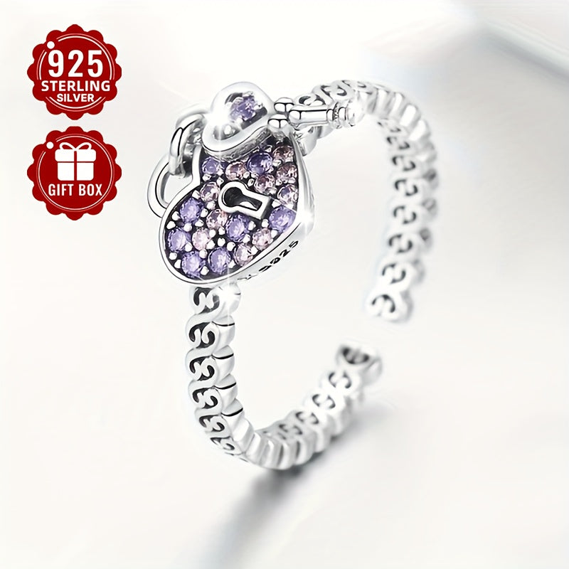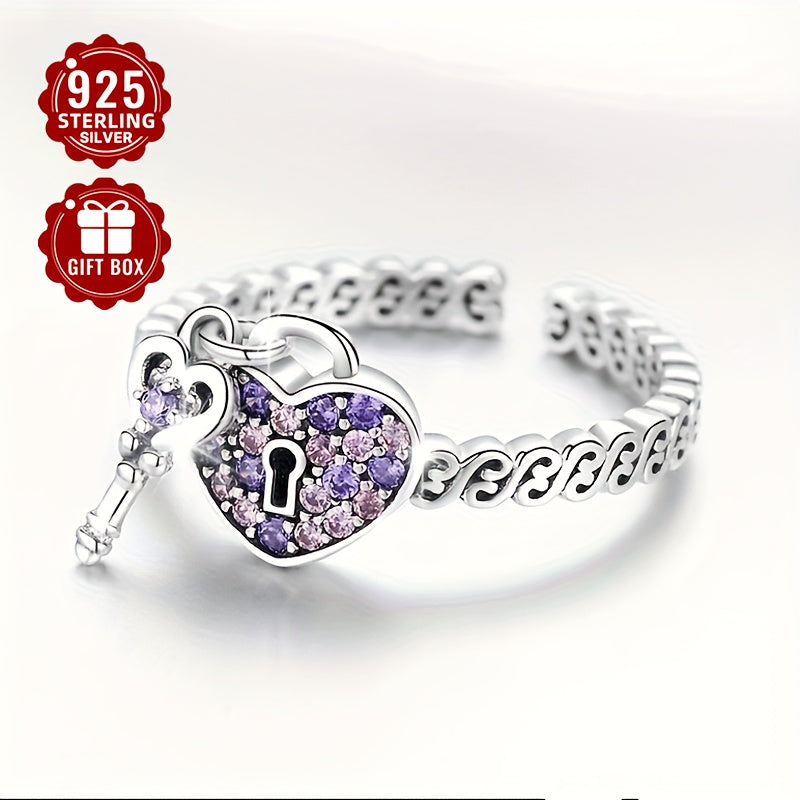 S925 Pure Silvery Women's Open Ring Key Lock Heart Lock Zirconia Inlaid