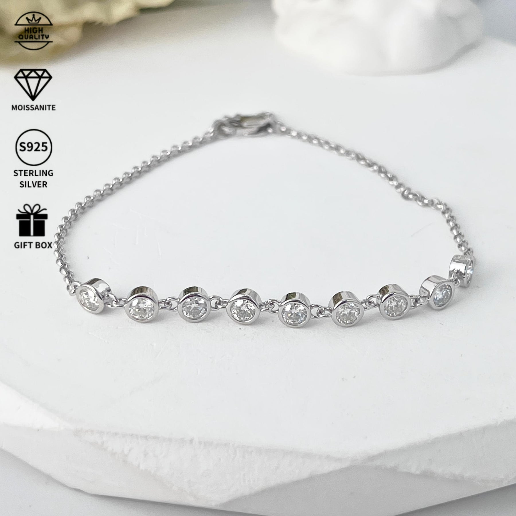 This elegant S925 silver bracelet features a 0.9ct moissanite stone. Perfect for daily wear, vacations, beach outings, and as a birthday gift for friends.