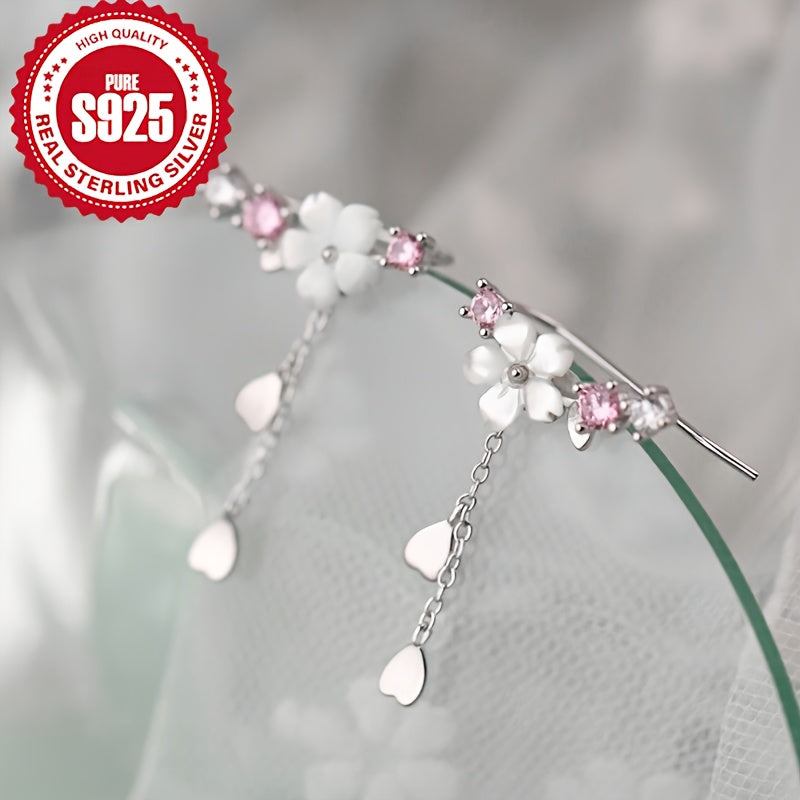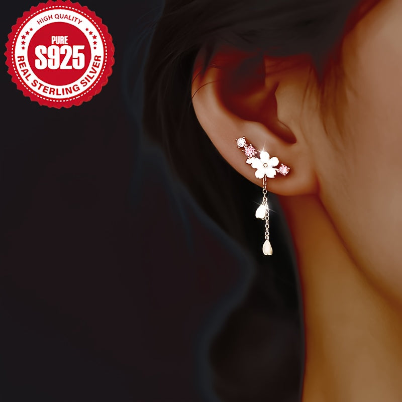 These S925 silver earrings feature a pink flower design with a crystal at the center. They are low allergy and versatile for daily wear, perfect for all seasons.