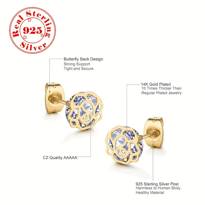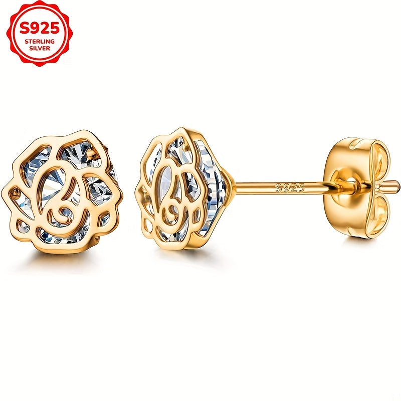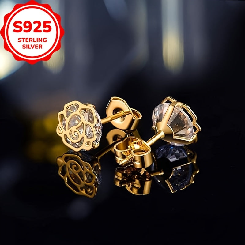 S925 Silvery Earrings with Golden Zirconia Rose Flower