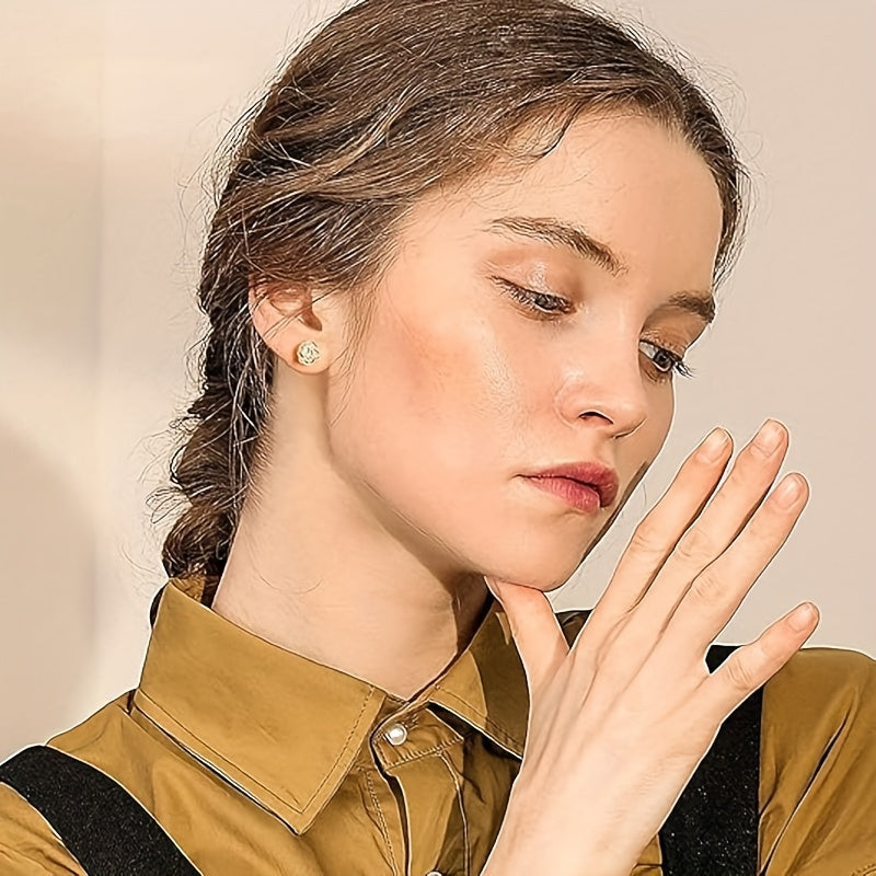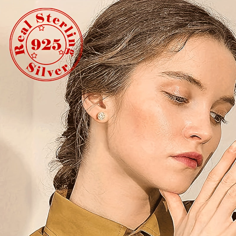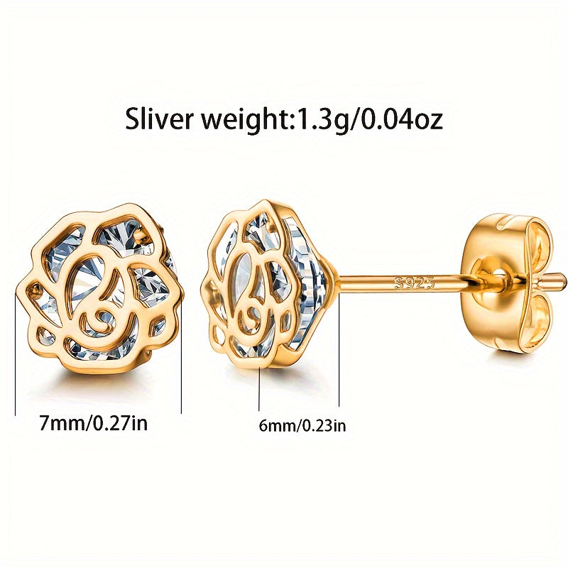 Elegant pair of S925 pure silvery earrings with a beautiful golden zirconia rose flower design. Perfect for daily wear or as a gift. Low allergy silvery material weighing 1.3g.