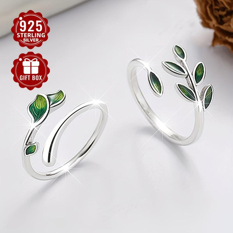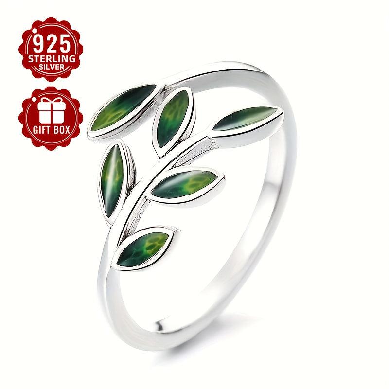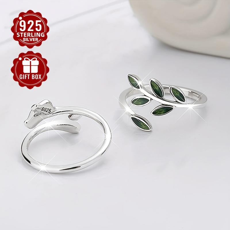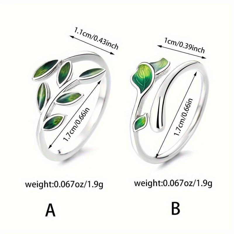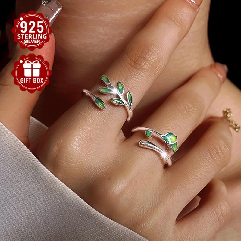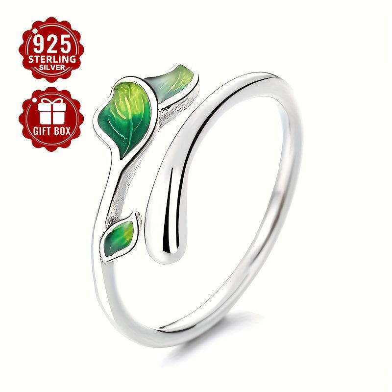S925 Silvery Green Drop Glue Leaf Open Ring Heart Sweet Style
