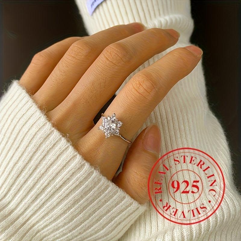 Add a touch of elegance to your outfit with this stunning snowflake flower ring made of 925 sterling silver and zirconia. Perfect for weddings, holidays, and special occasions.