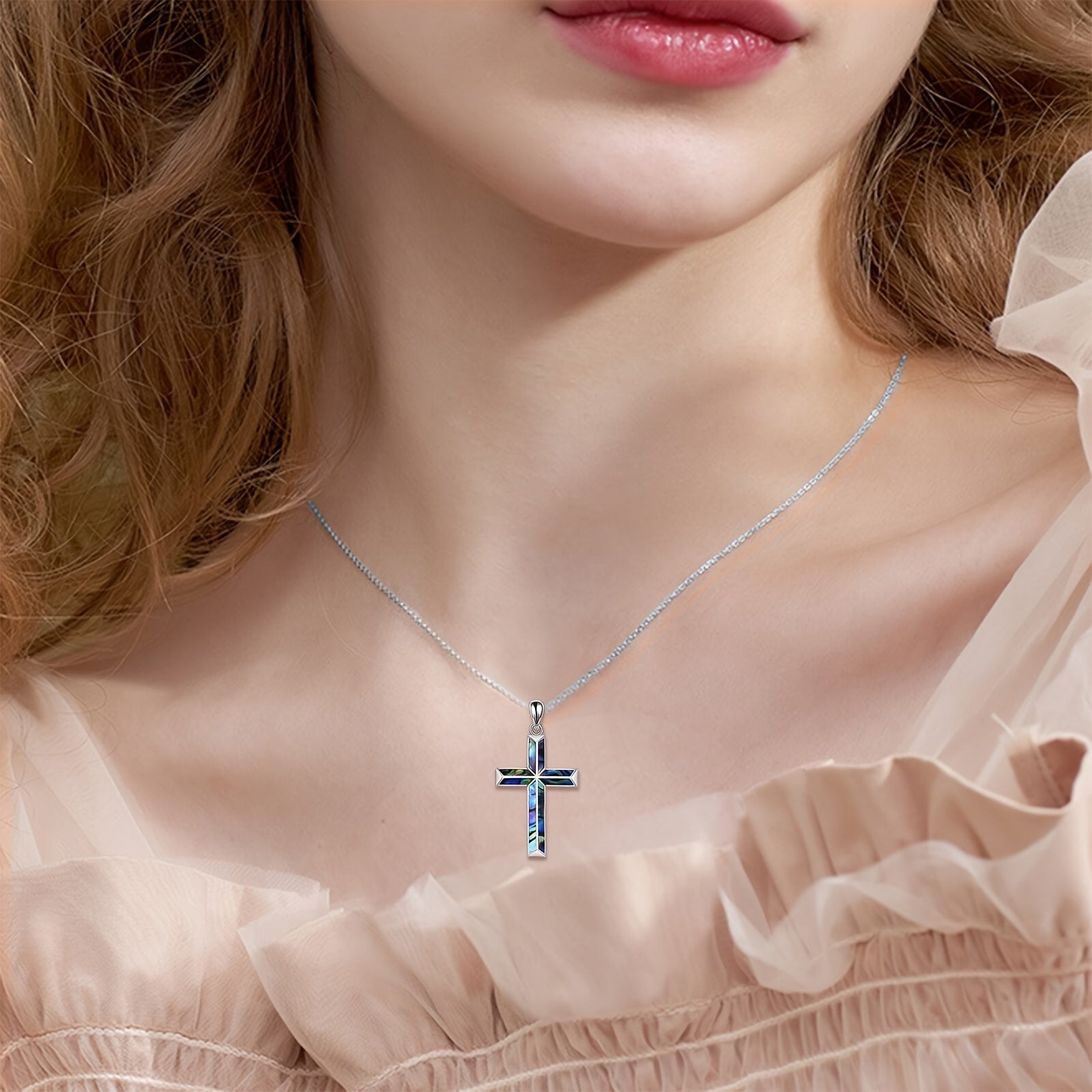 Elegant cross pendant necklace made of 925 sterling silver with abalone shell, perfect for women's religious jewelry collection.