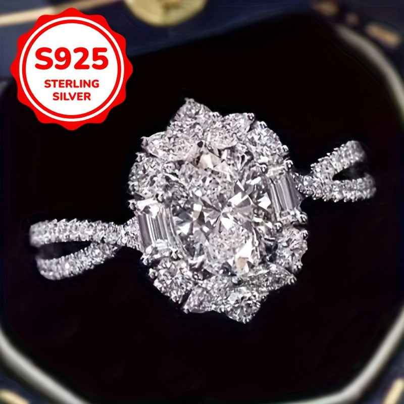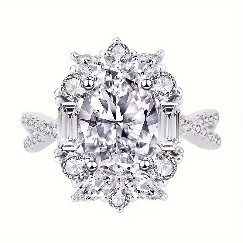 This elegant ring features an oval zirconia stone with a pigeon egg cut, perfect for weddings and engagements.