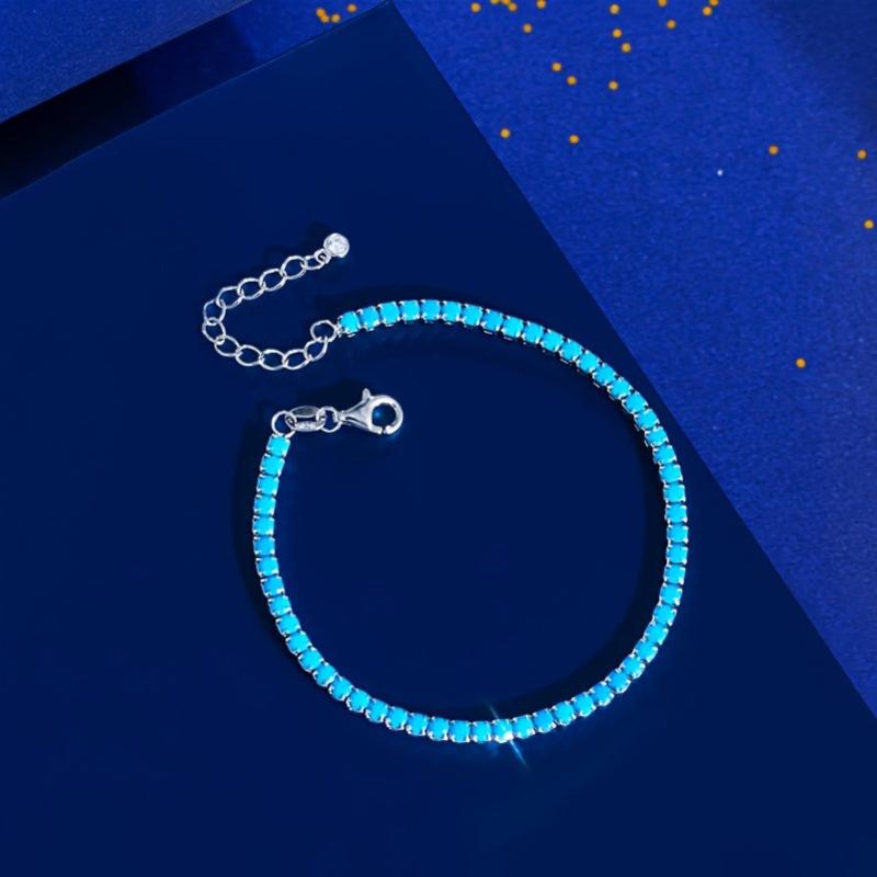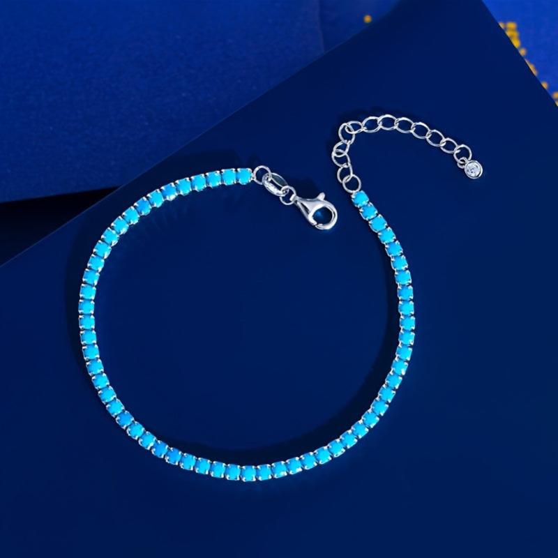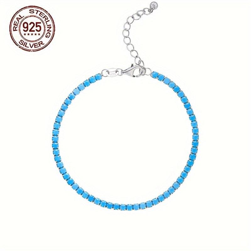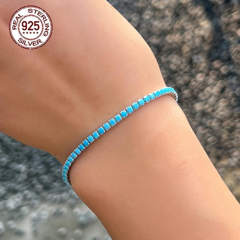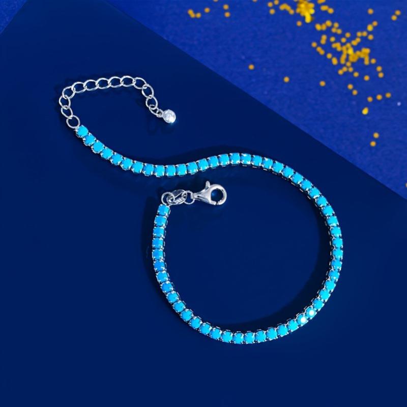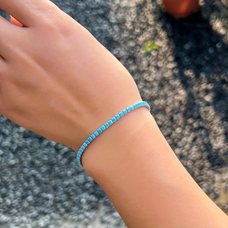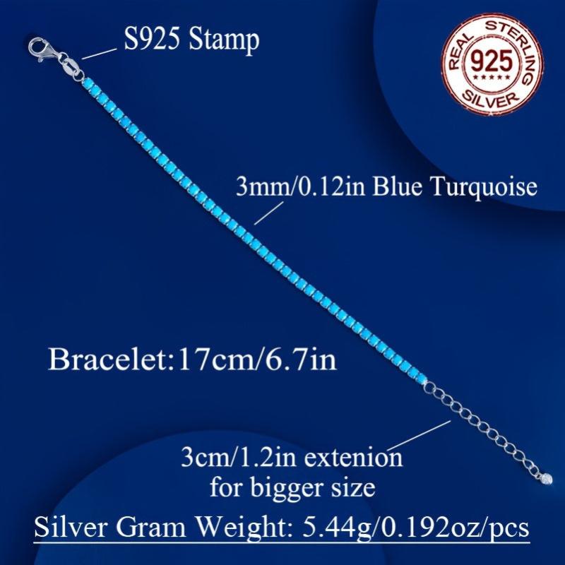 This stunning bracelet features a dainty turquoise stone set in 925 silver. It weighs 0.192oz and has a 3mm round synthetic tennis chain design.