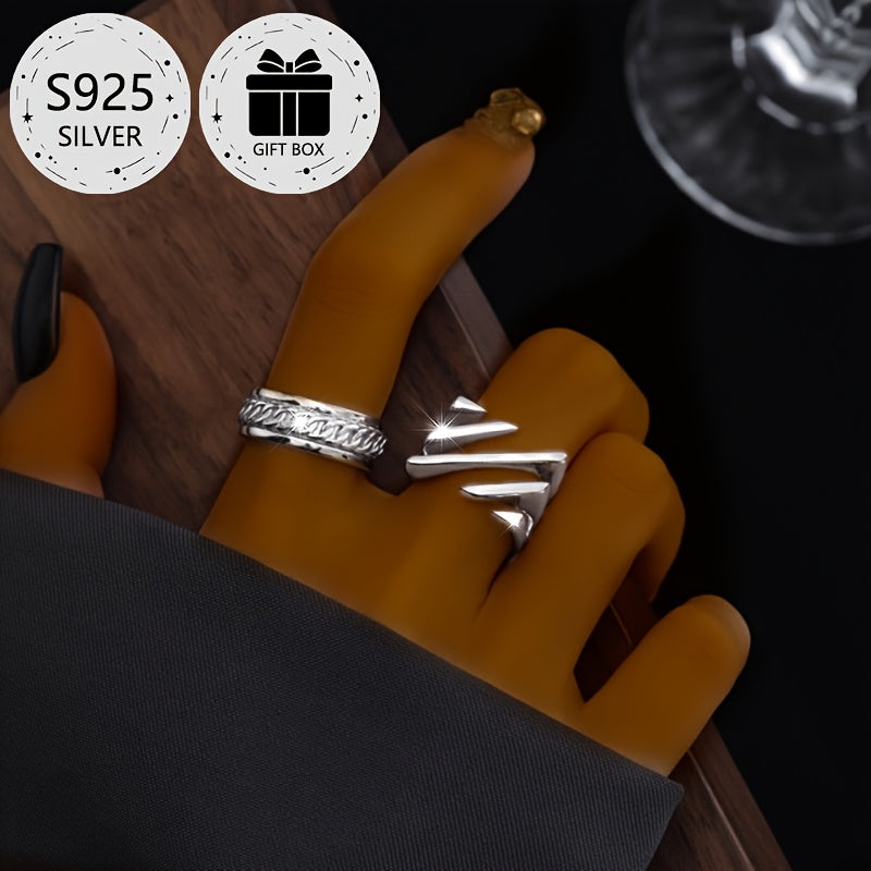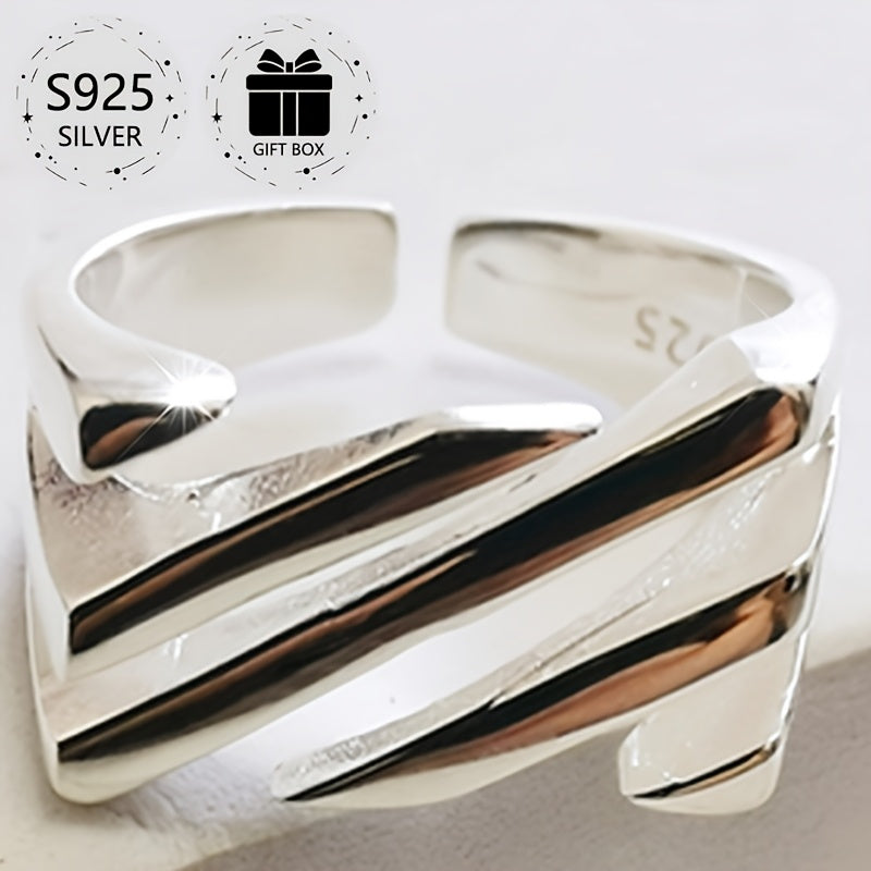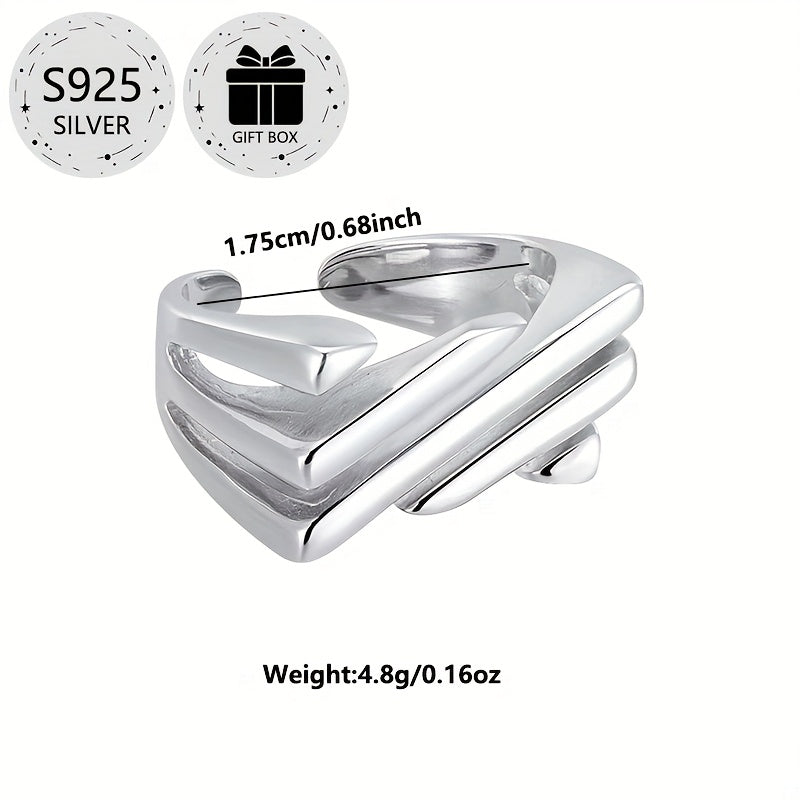This open ring features a classic square hollow design with a twill layer, made of 925 silver. It is adjustable to fit different finger sizes and weighs approximately 4.8 grams. The ring comes packaged as a perfect gift for any occasion.