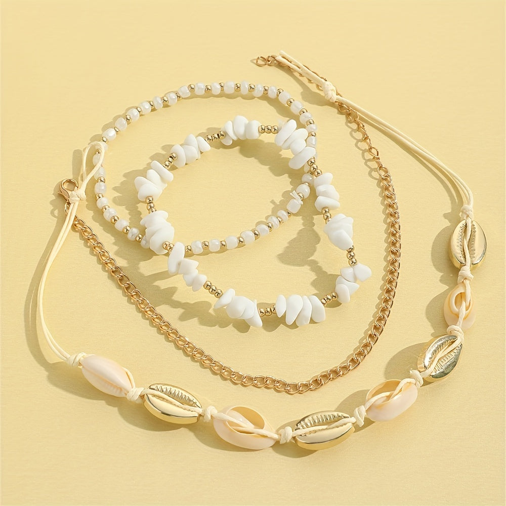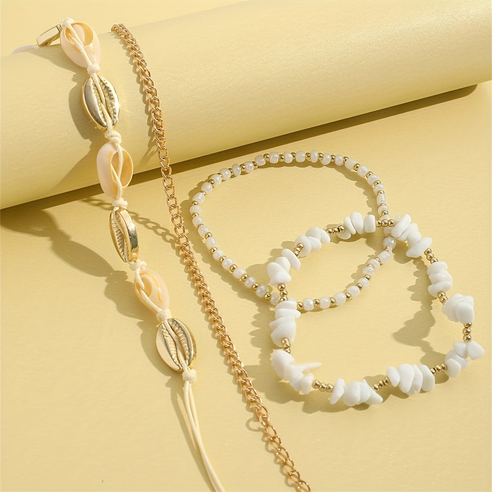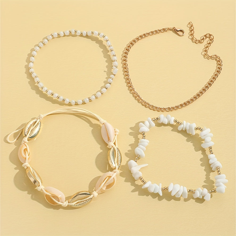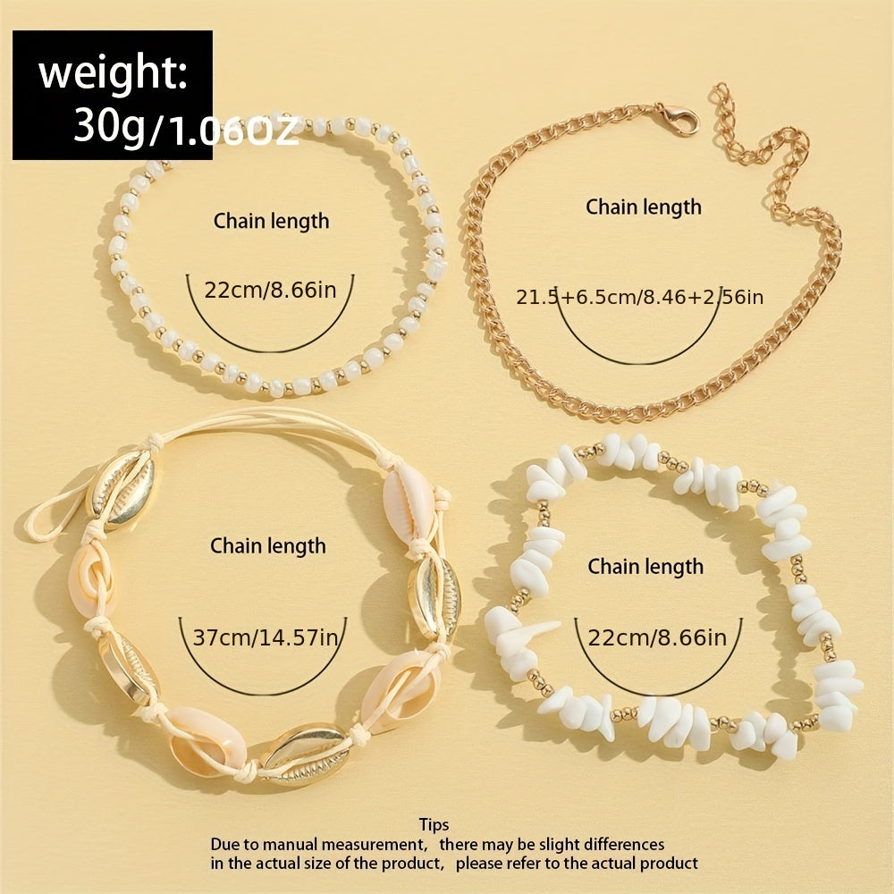 Elevate your ankle game with this 4-piece anklet set featuring shell-shaped beads and natural chip stone beads. Perfect for stacking or wearing individually.