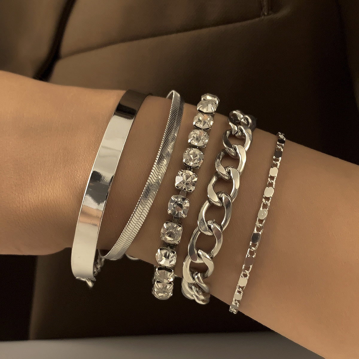 Add a touch of elegance with this set of 5 women's bracelets featuring gorgeous faux diamond embellishments and geometric cutout designs.