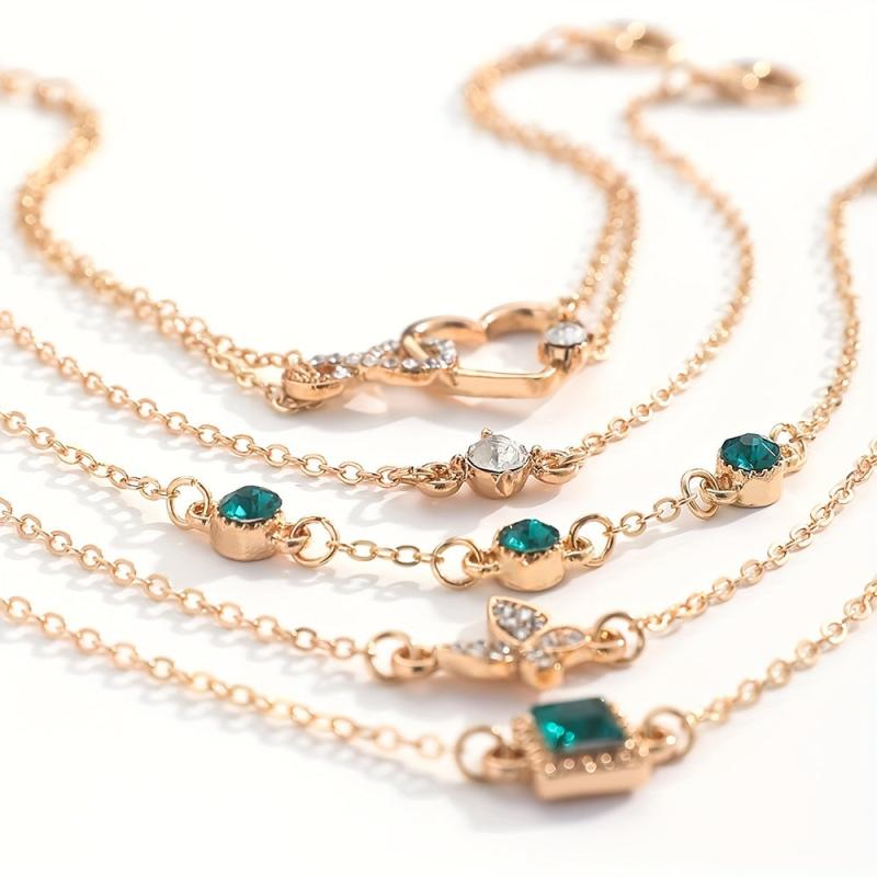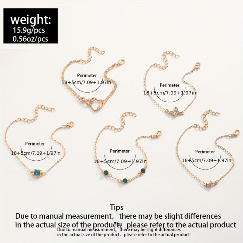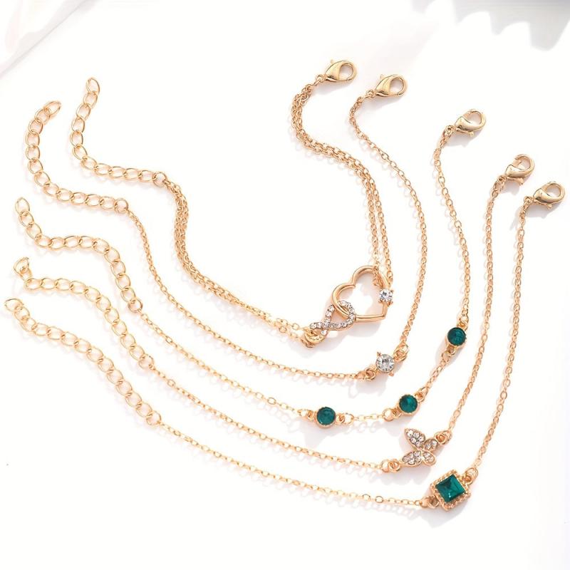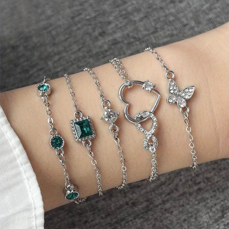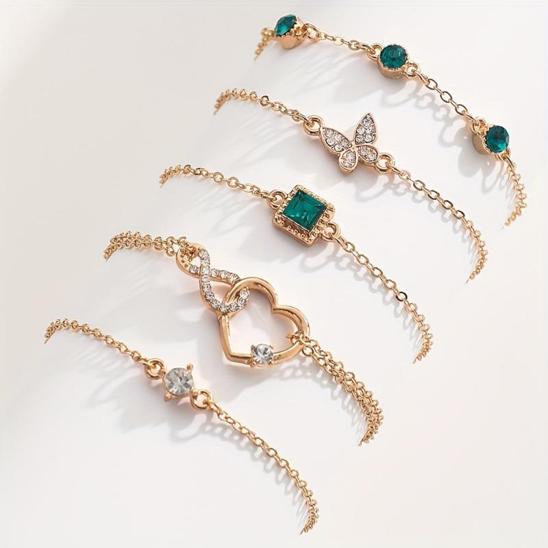This 5-piece set of retro style bracelets features spinning rhinestones and an infinity symbol design. The bracelets are eco-friendly and adorned with geometric green rhinestones for a unique look.