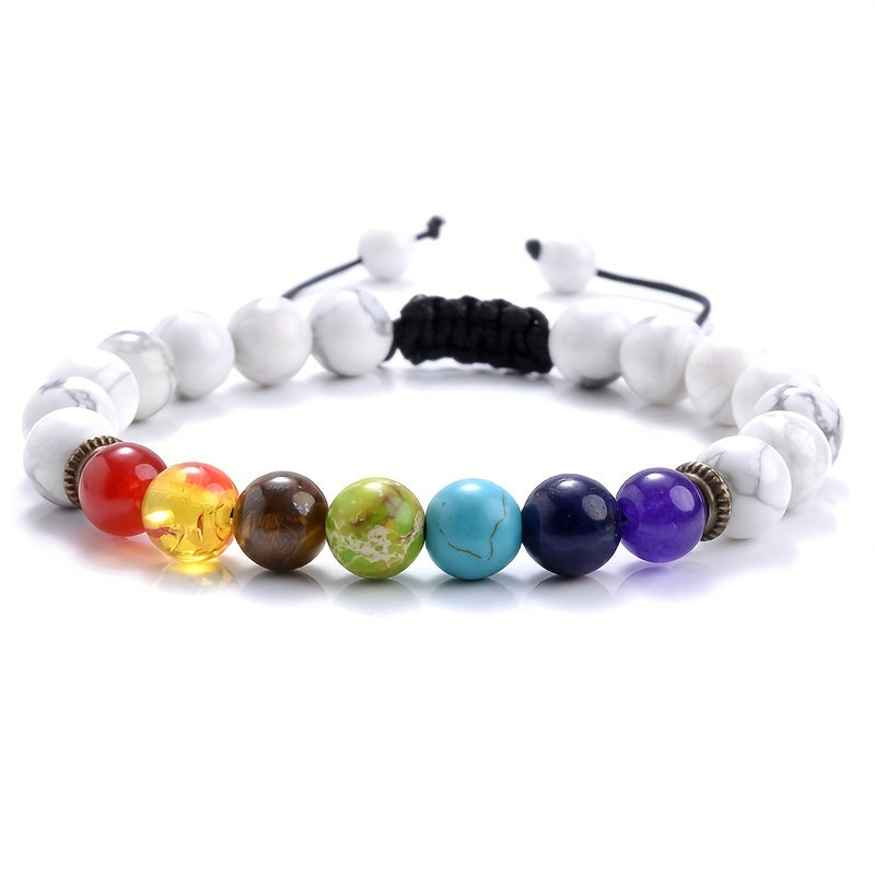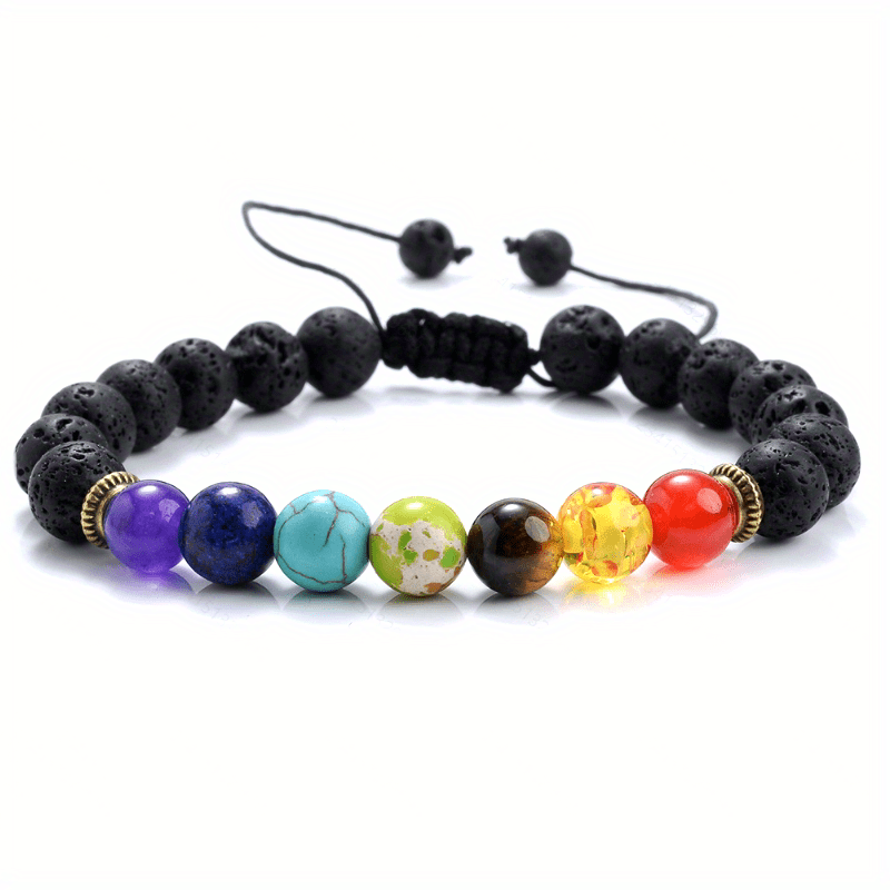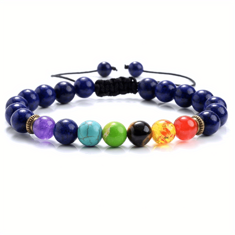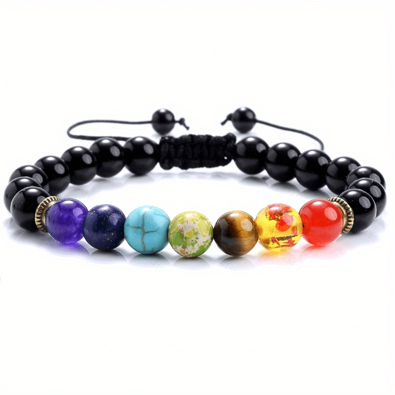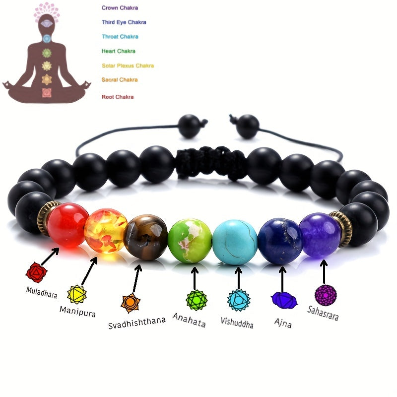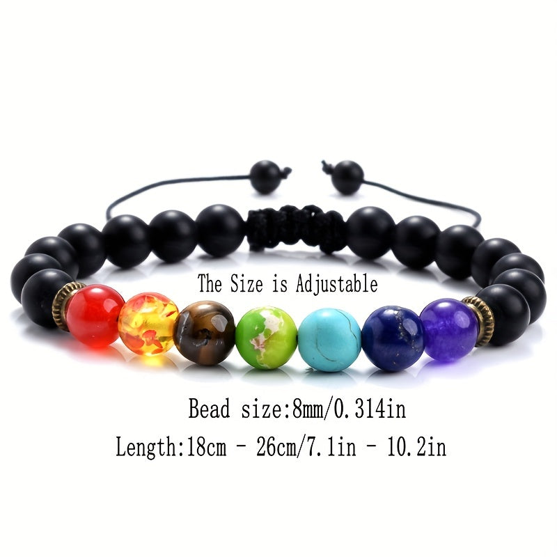 This men's bracelet features 7 chakras made of natural crystals for healing and anxiety relief. It is braided and beaded, with an adjustable design.