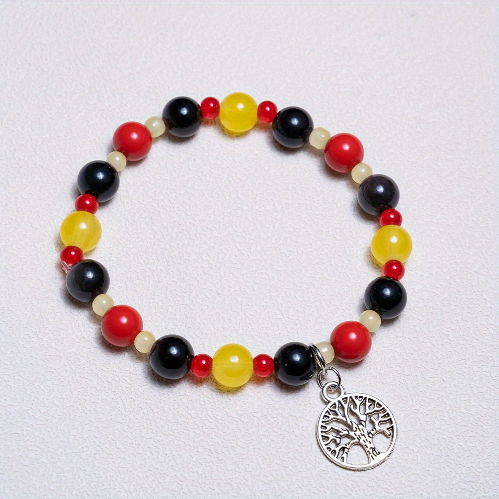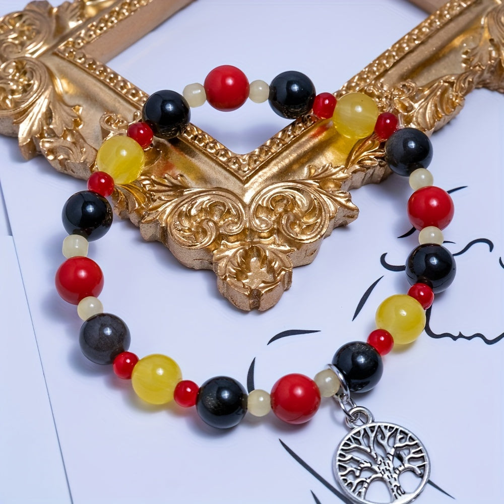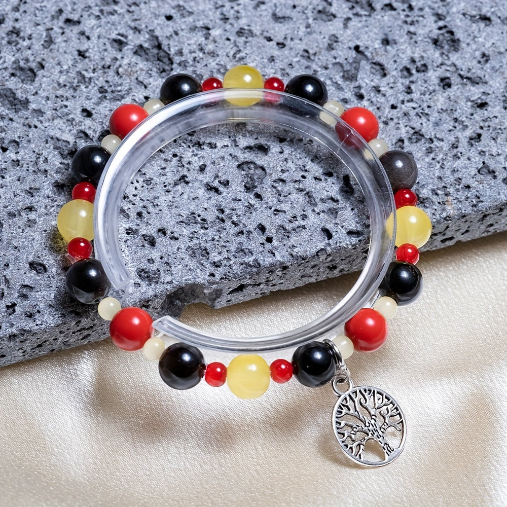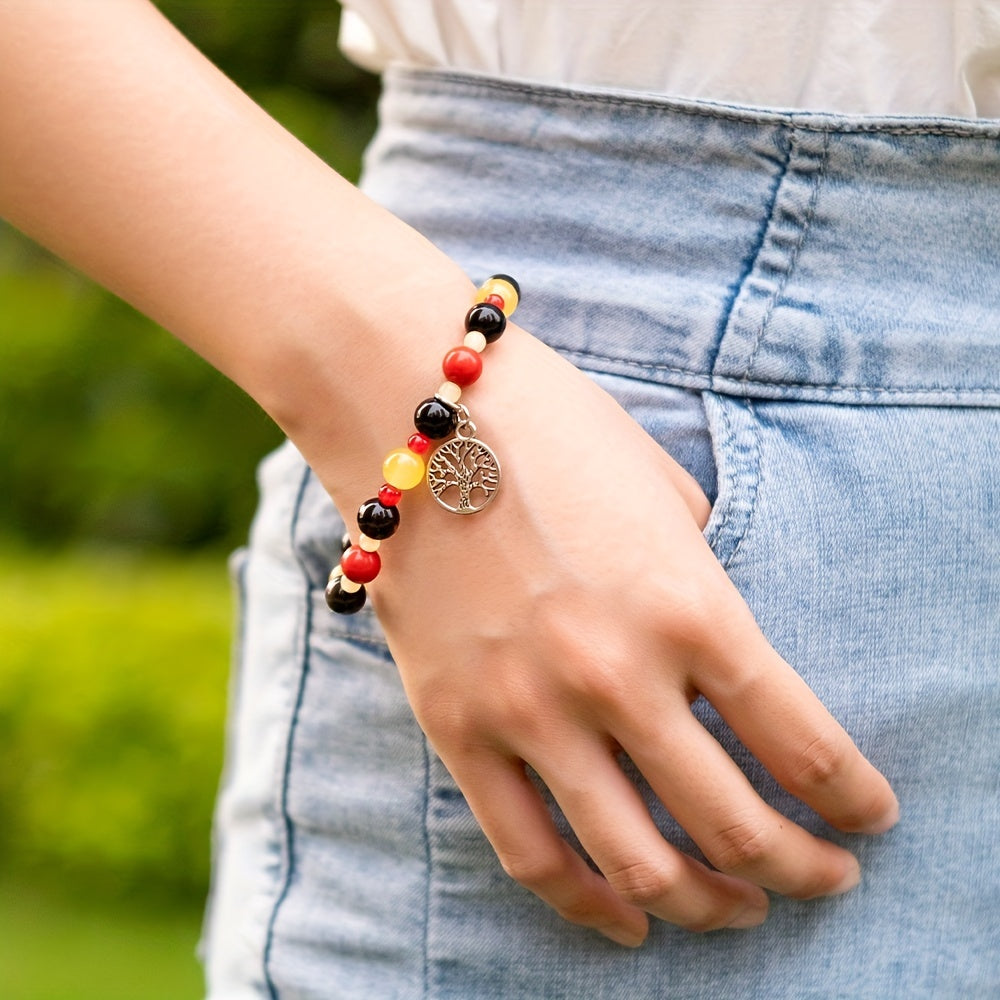 This stylish bracelet features natural stones in a variety of colors, with a unique World Tree charm. The adjustable design ensures a perfect fit for any wrist size.