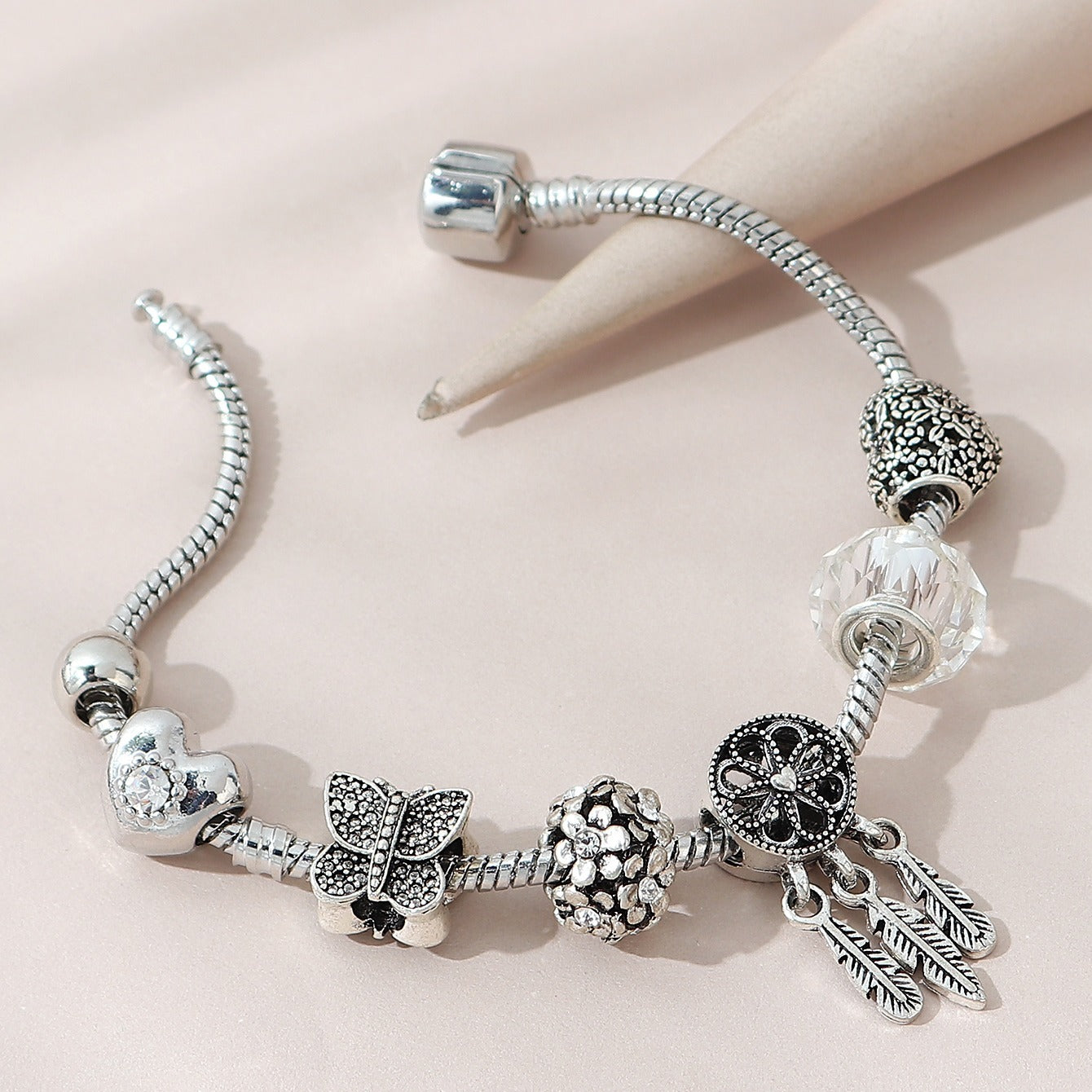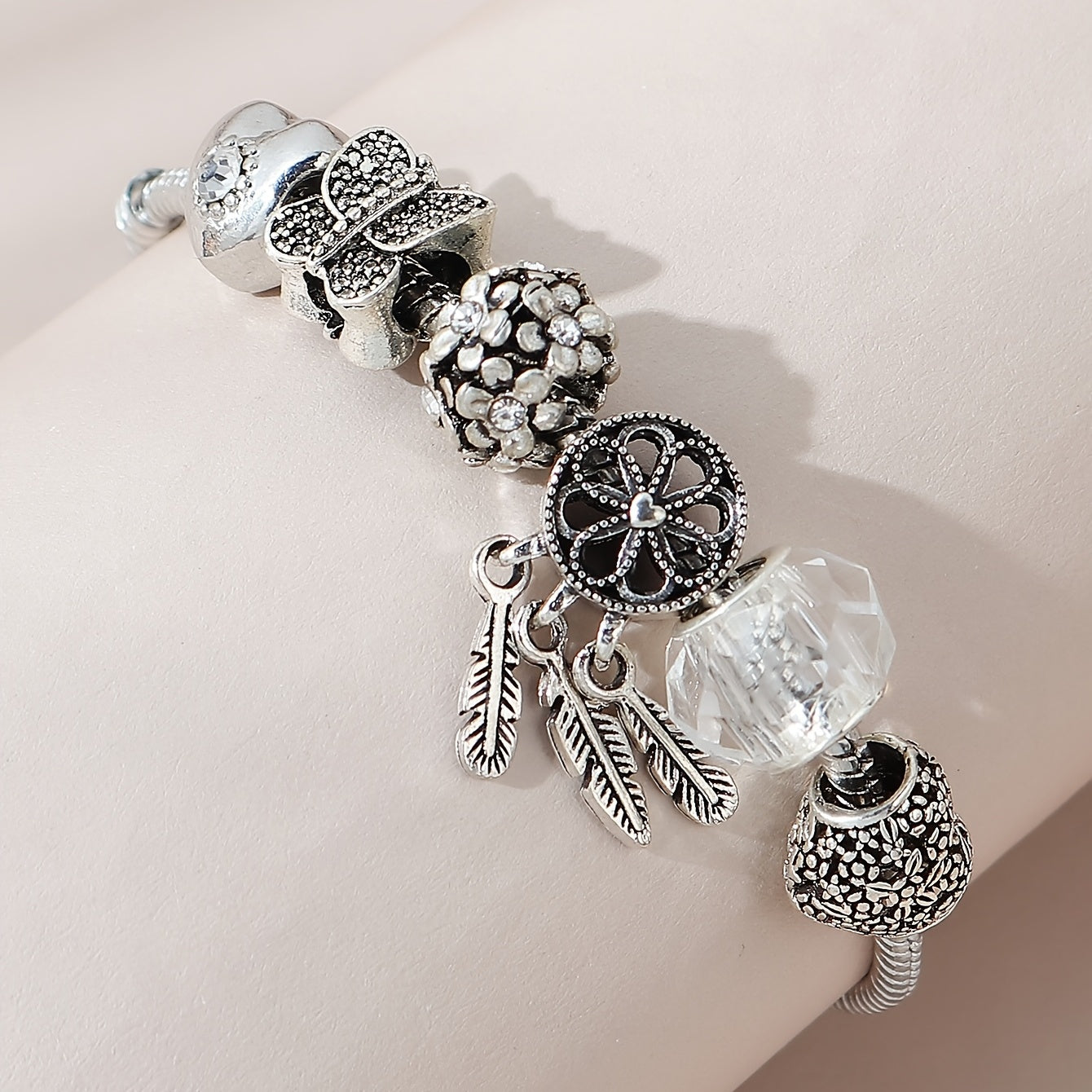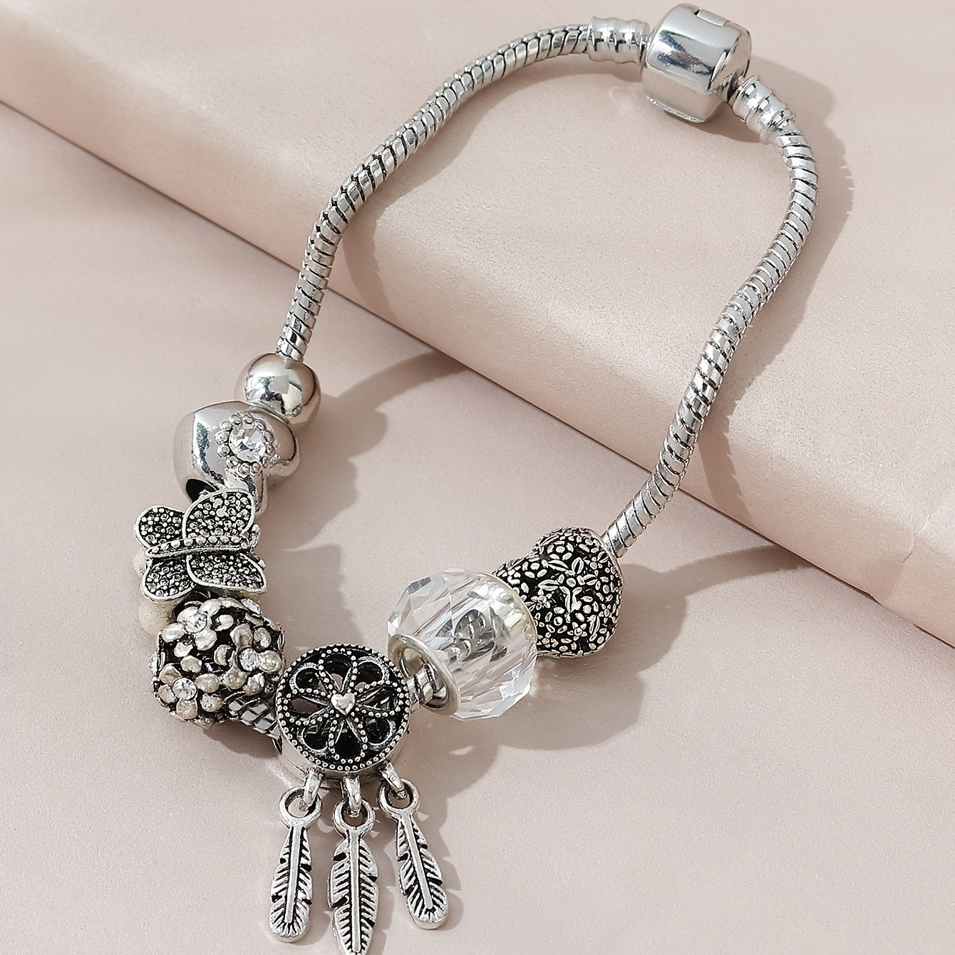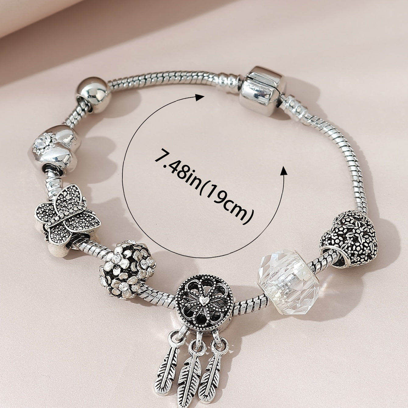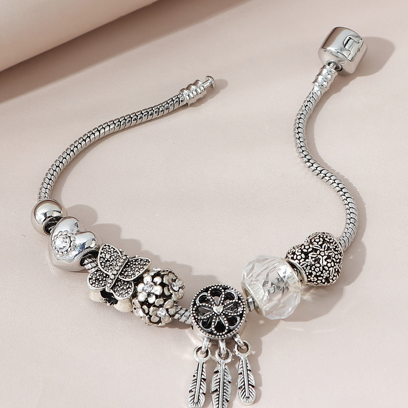 Adorn your wrist with this elegant charm bracelet featuring a matching feather tassel pendant. The bracelet is accented with flower and butterfly hollow out beads on a snake chain bangle, making it perfect for Christmas stocking gifts.
