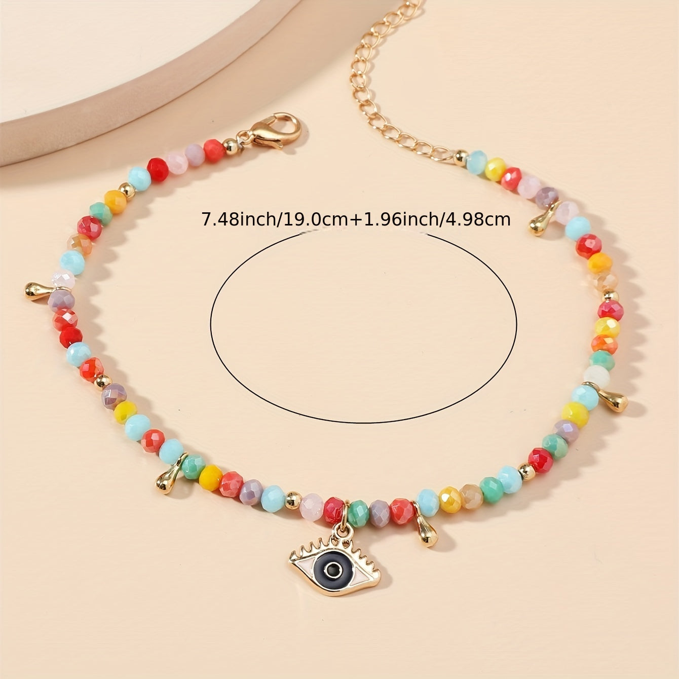This delicate bracelet features red multicolor crystal evil eyes for a gothic look.