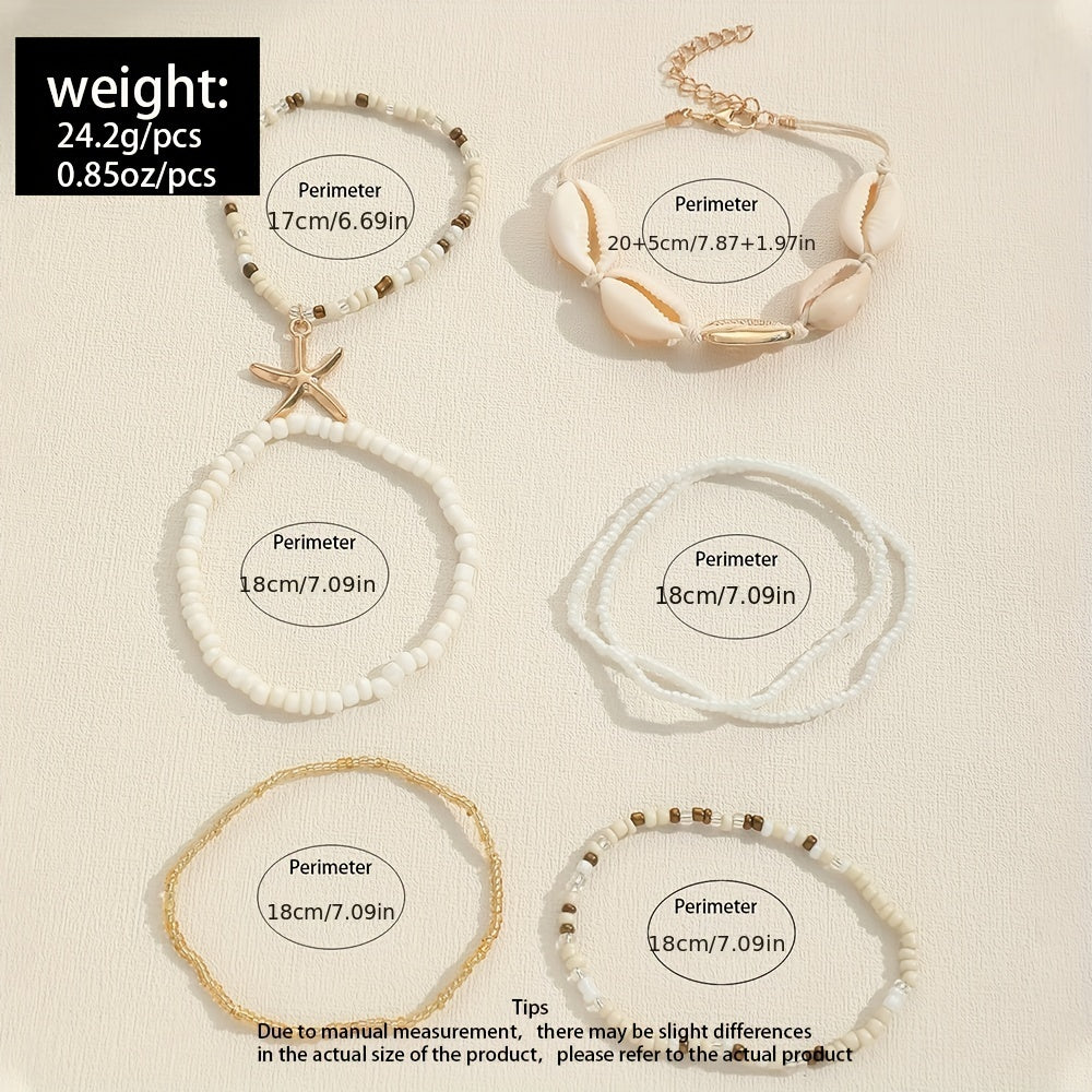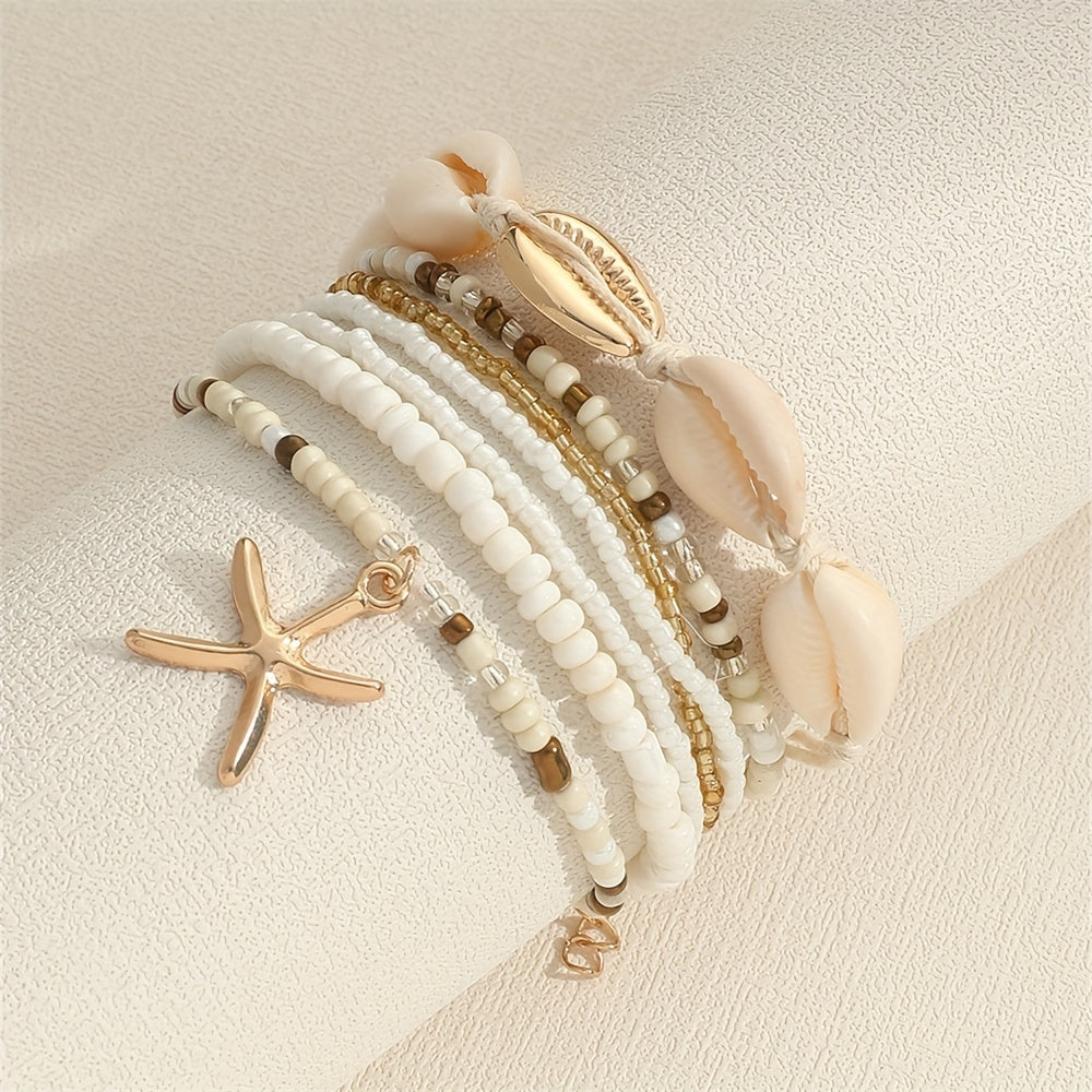 Embrace a bohemian vibe with this 7pcs bracelet set featuring beads, rice beads, shell, and starfish pendants. Perfect holiday vacation ornament.