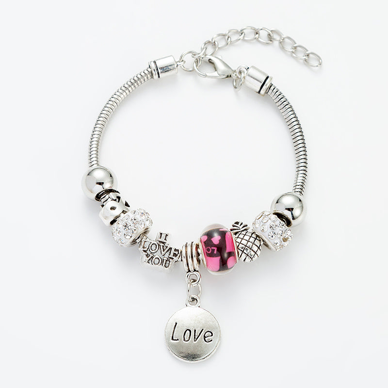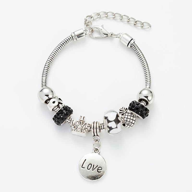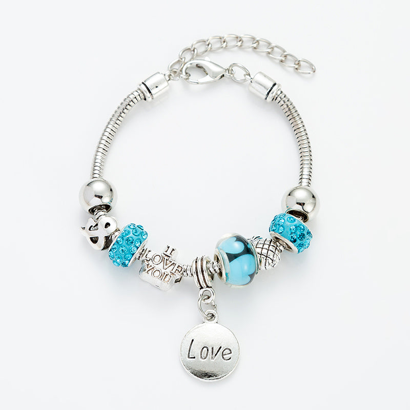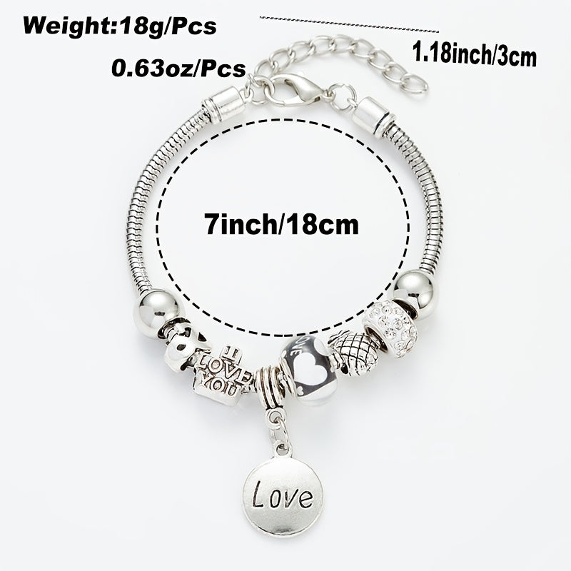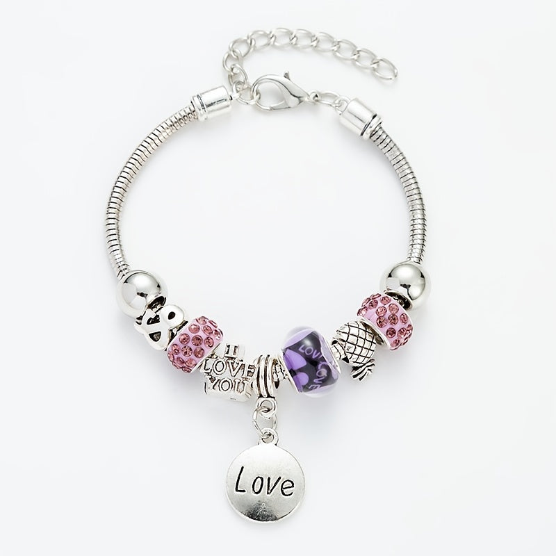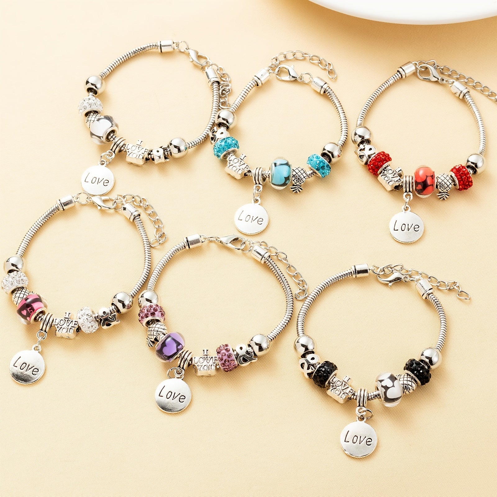 This boho beaded charm bracelet features rhinestones and glass in a pattern of LOVE alphabet. It is adjustable to fit any wrist size.