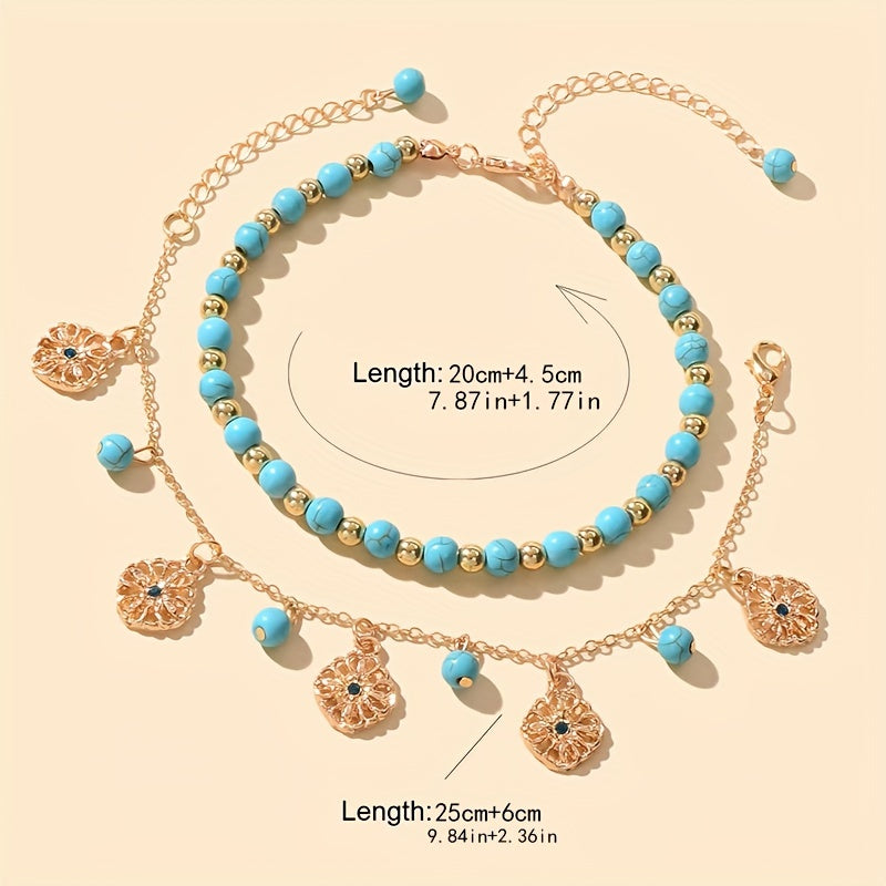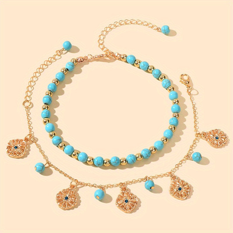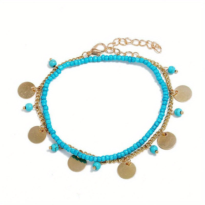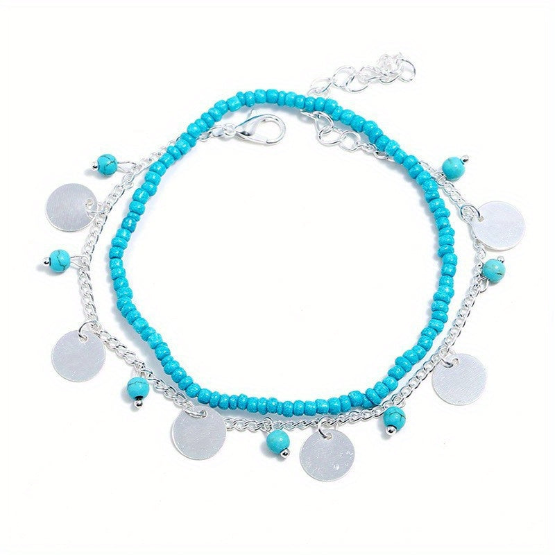 This beach style ankle bracelet features two layers of turquoise beads in a boho style design. Perfect for women and girls looking to add a touch of the beach to their outfit.