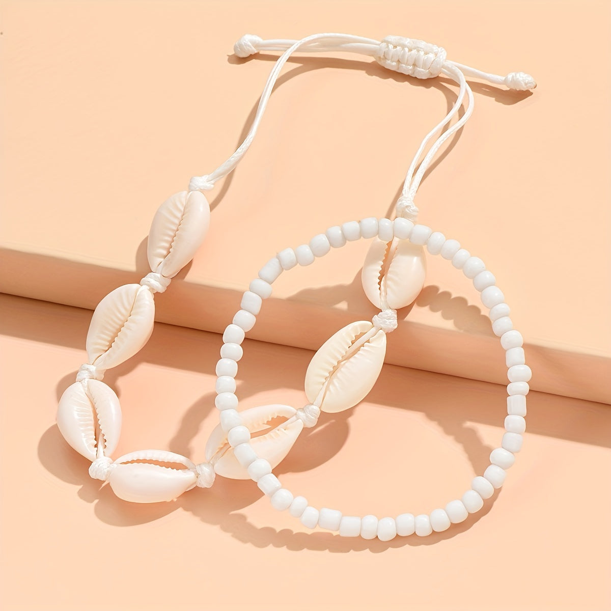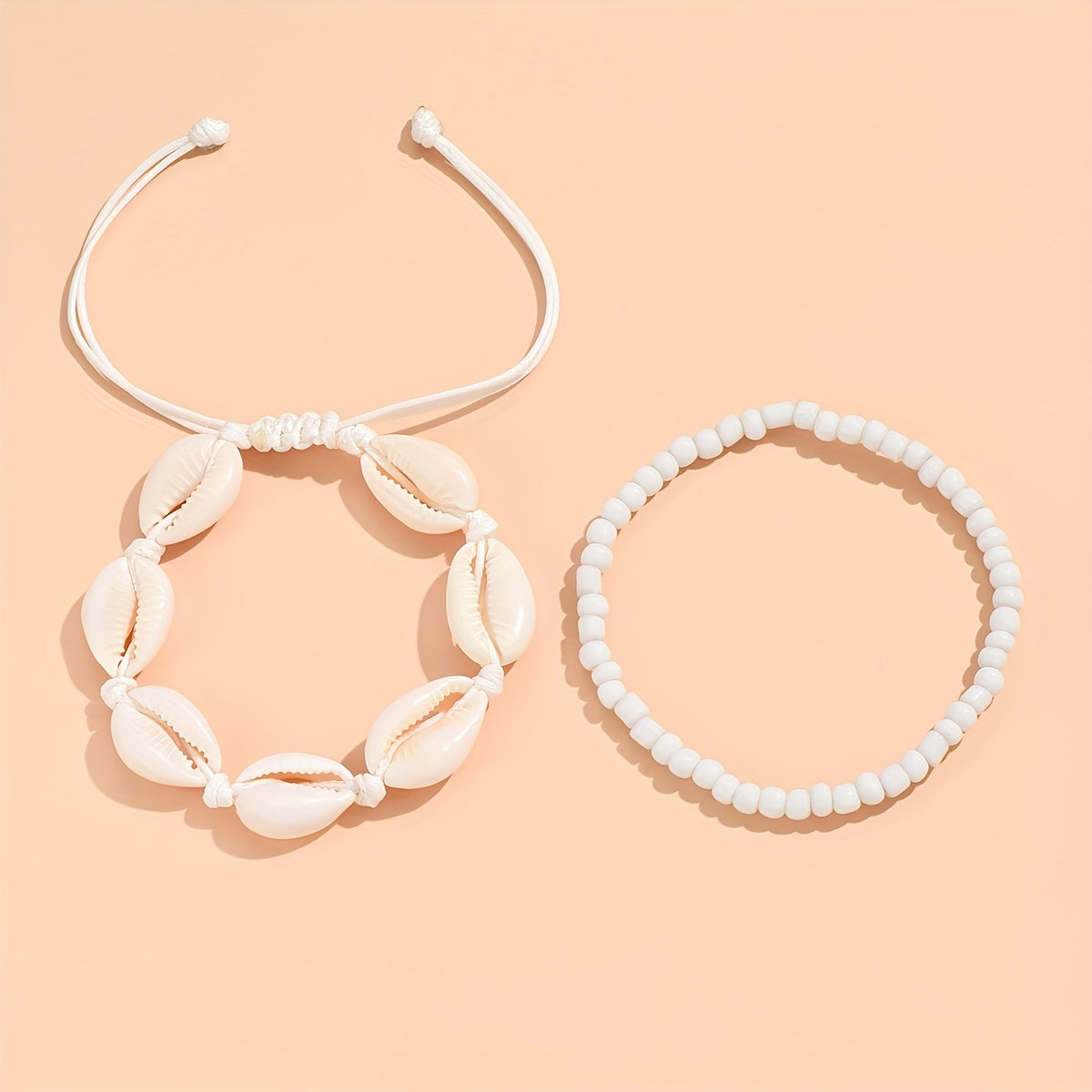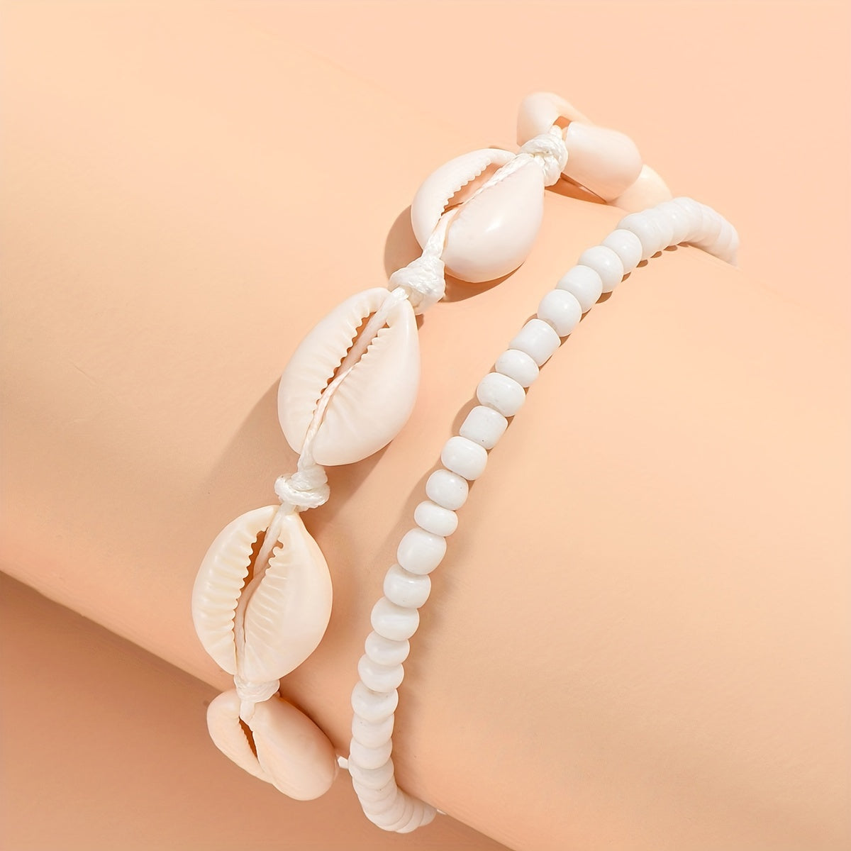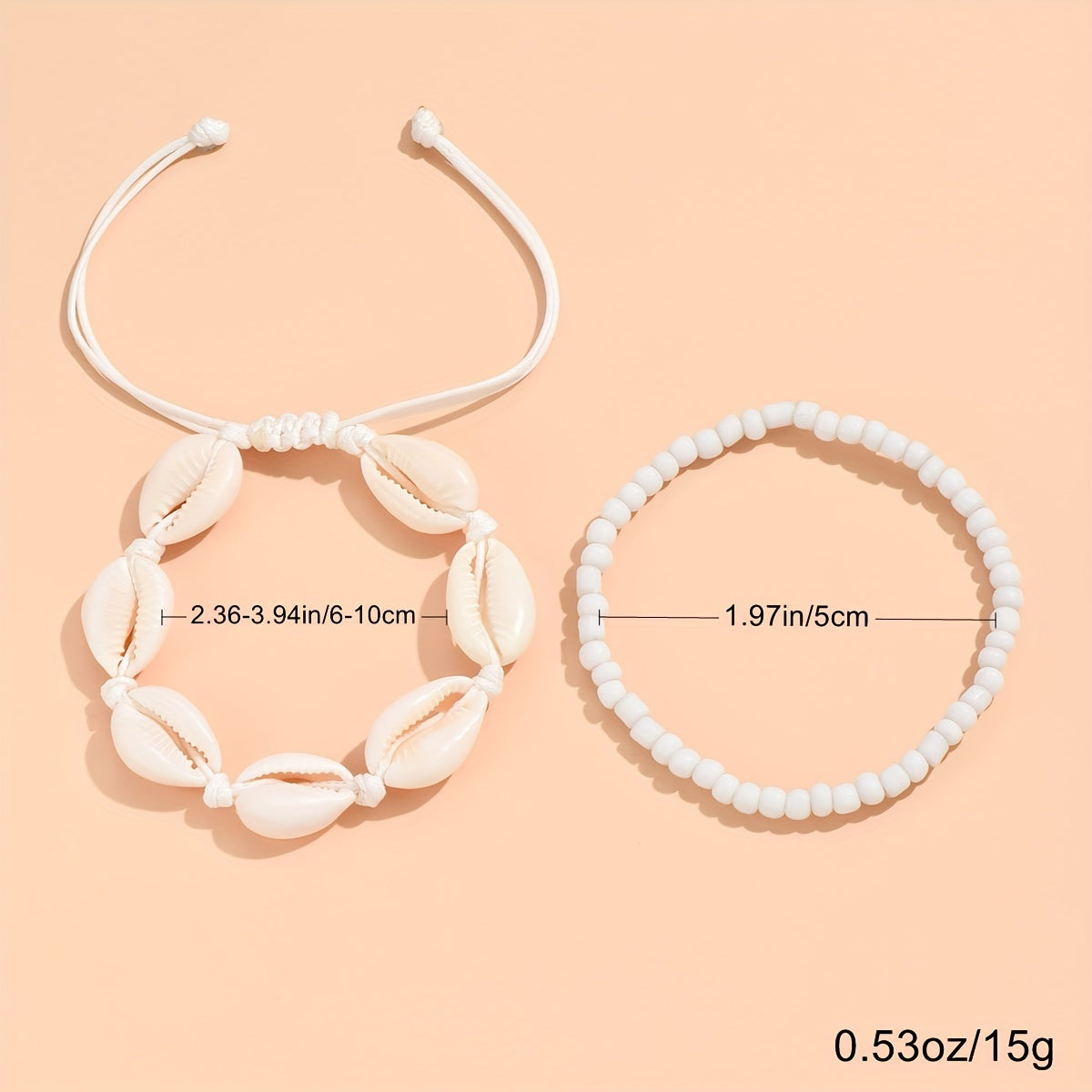 Add a touch of boho chic to your outfit with this 2-piece beaded bracelet set featuring shell shape beads. Perfect for everyday wear or special occasions.