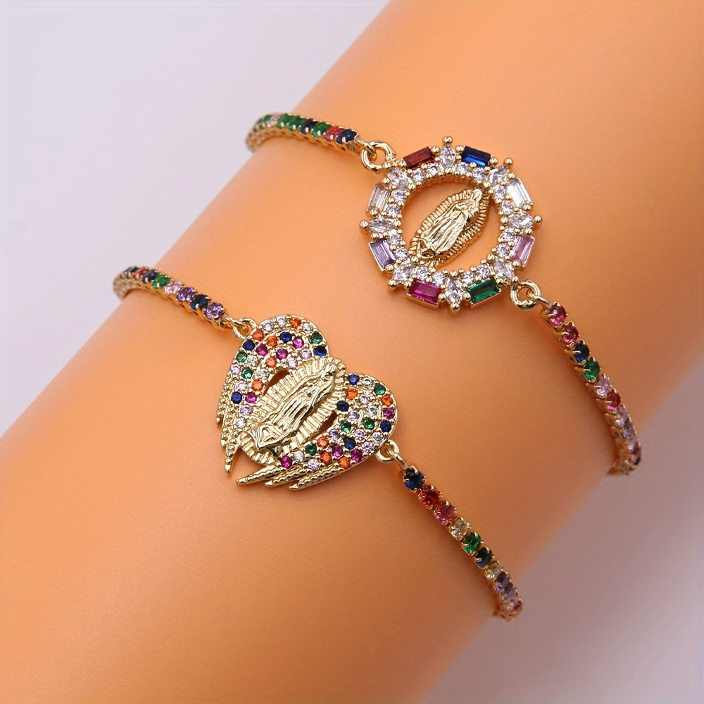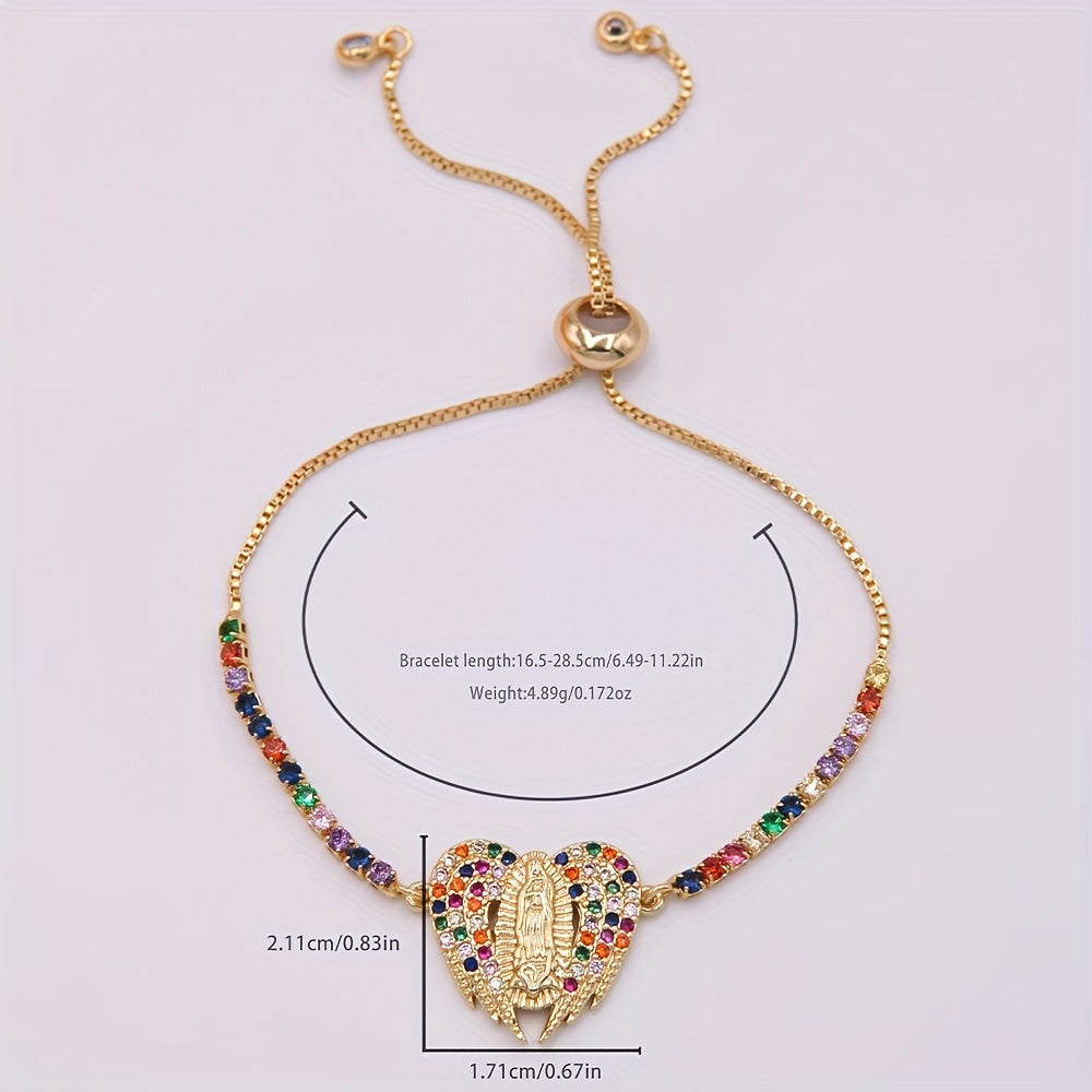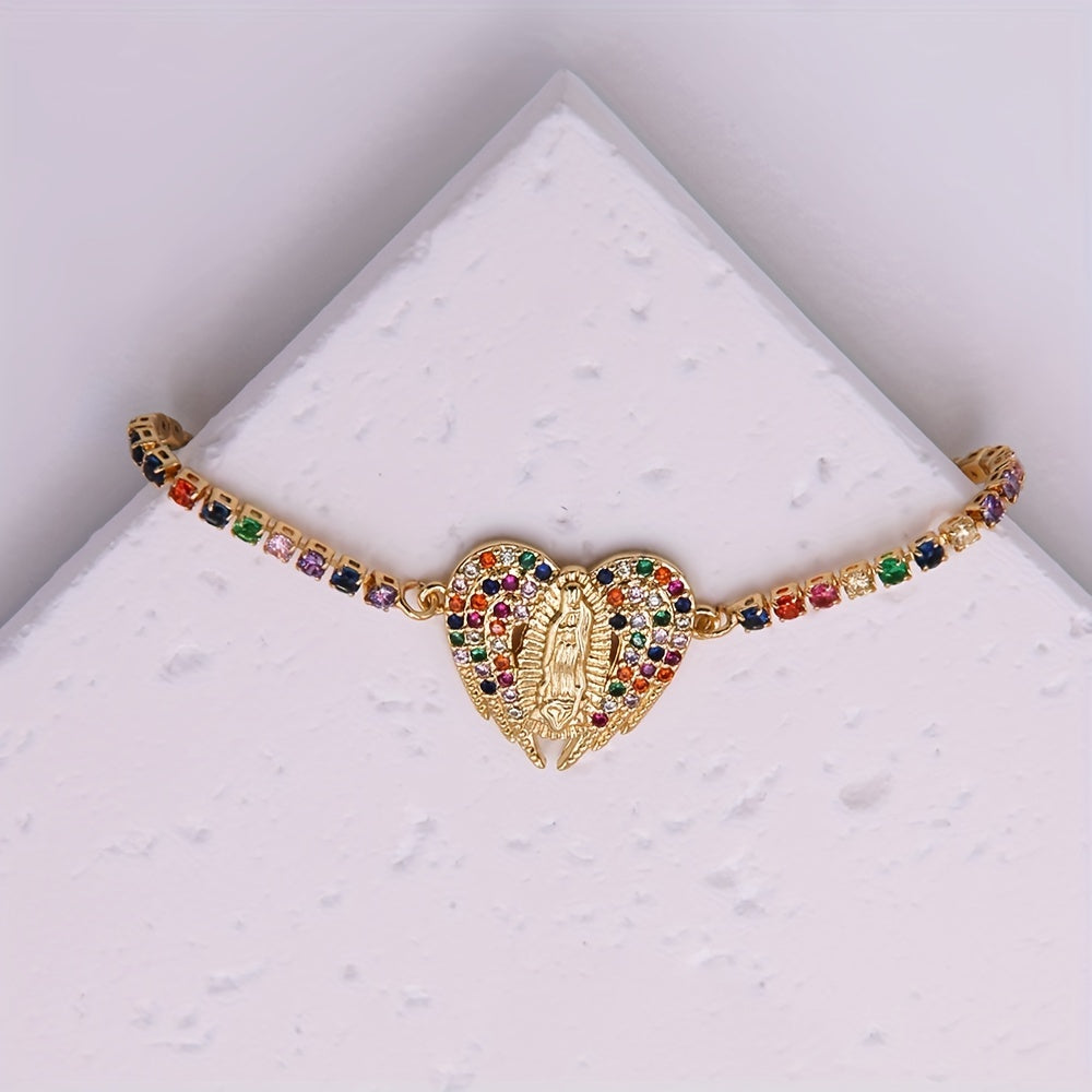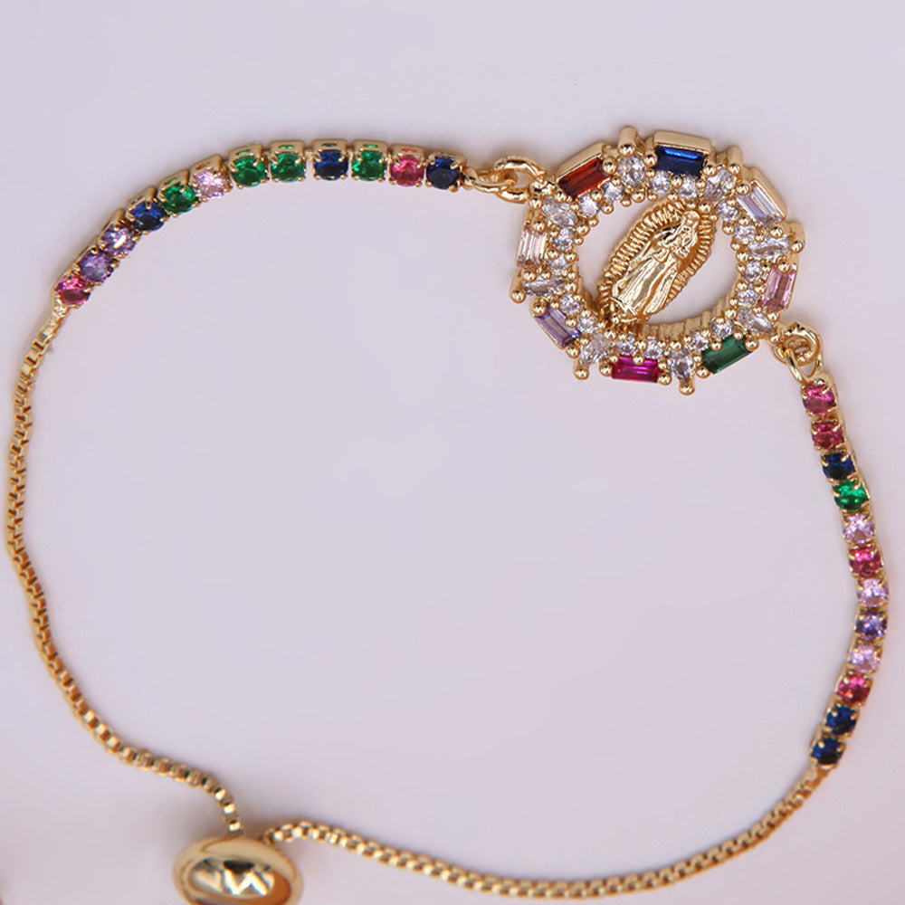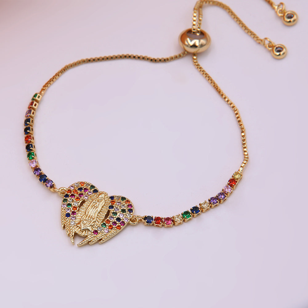 This bracelet is adorned with vibrant zircon stones and features angel wings and the image of Virgin Mary. Perfect for daily prayer and for religious believers.