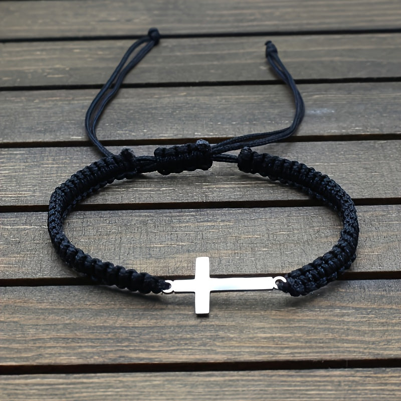 This stylish braided rope bracelet features a cross pattern design made of stainless steel. Perfect for daily wear and a great accessory for ladies' clothing.
