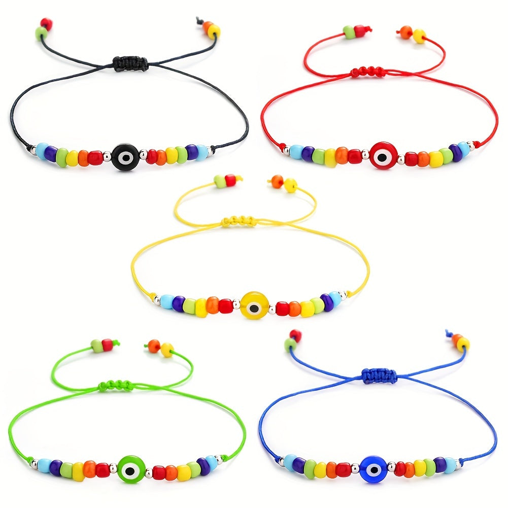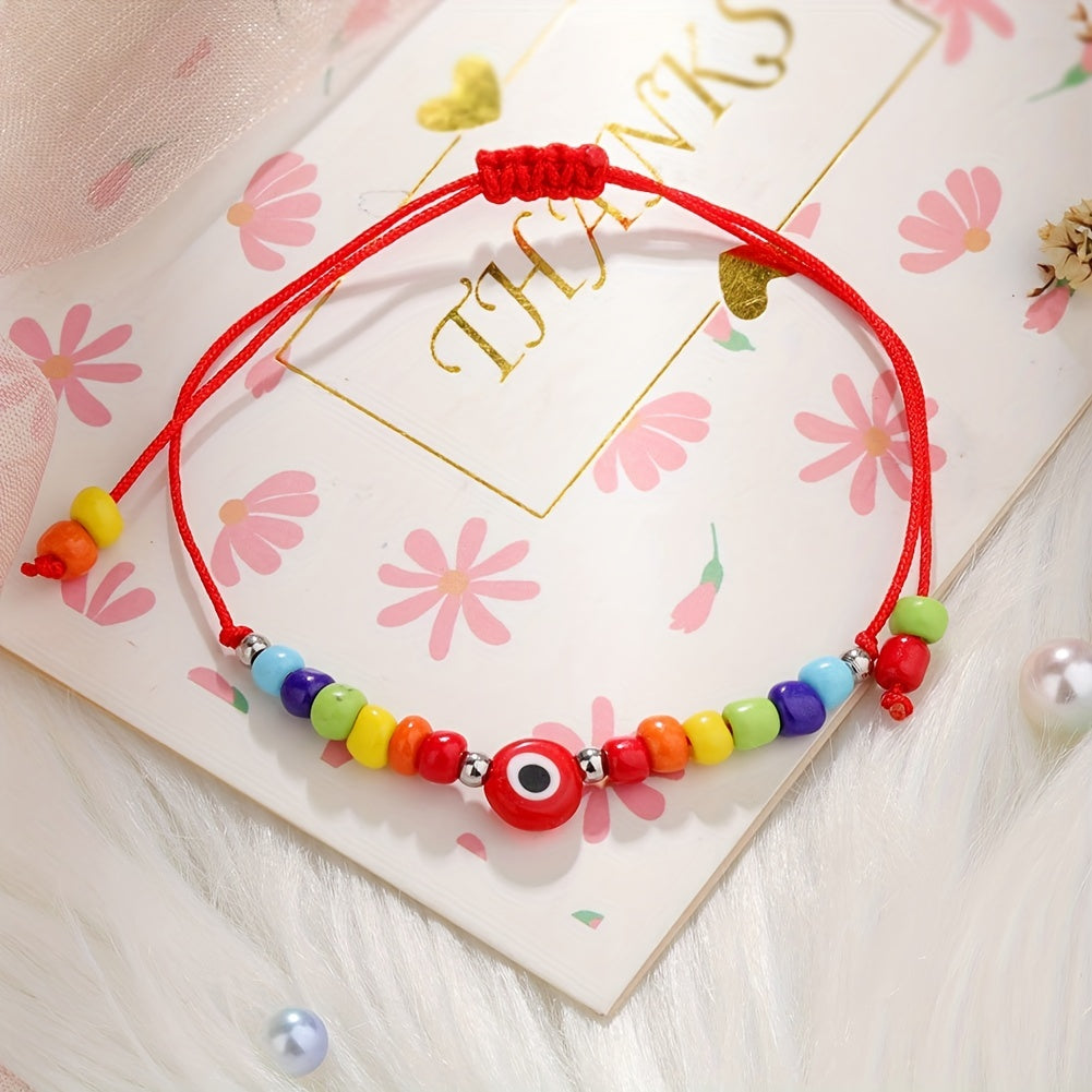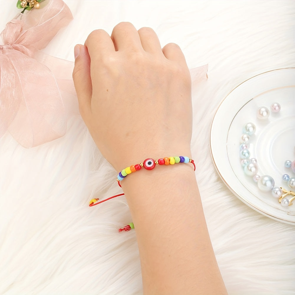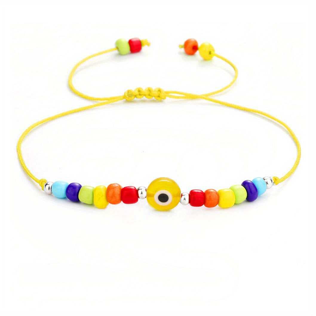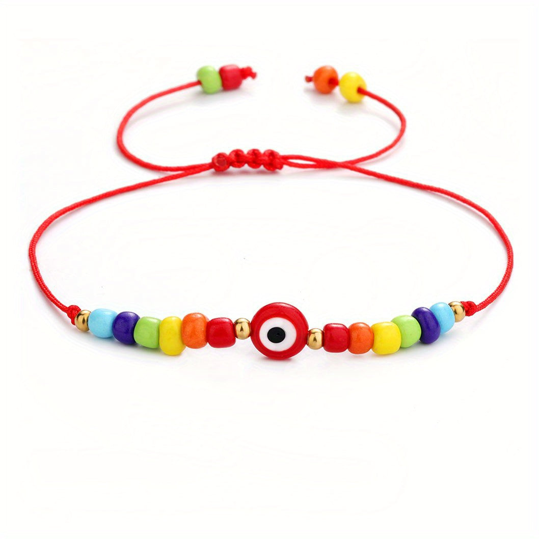 This braided bracelet features a Devil's Eye pattern and is believed to bring good luck. Adjustable design makes it perfect for summer beach wear or as a friendship accessory.