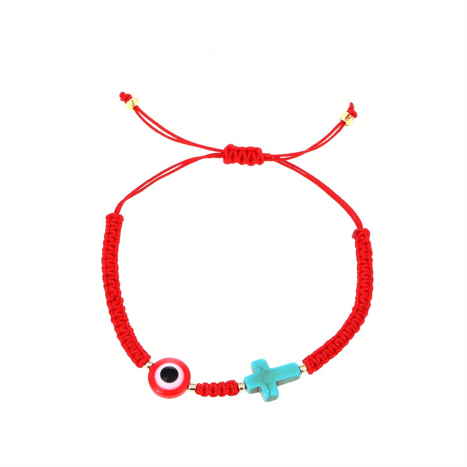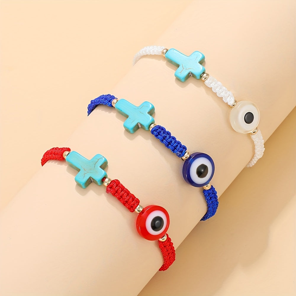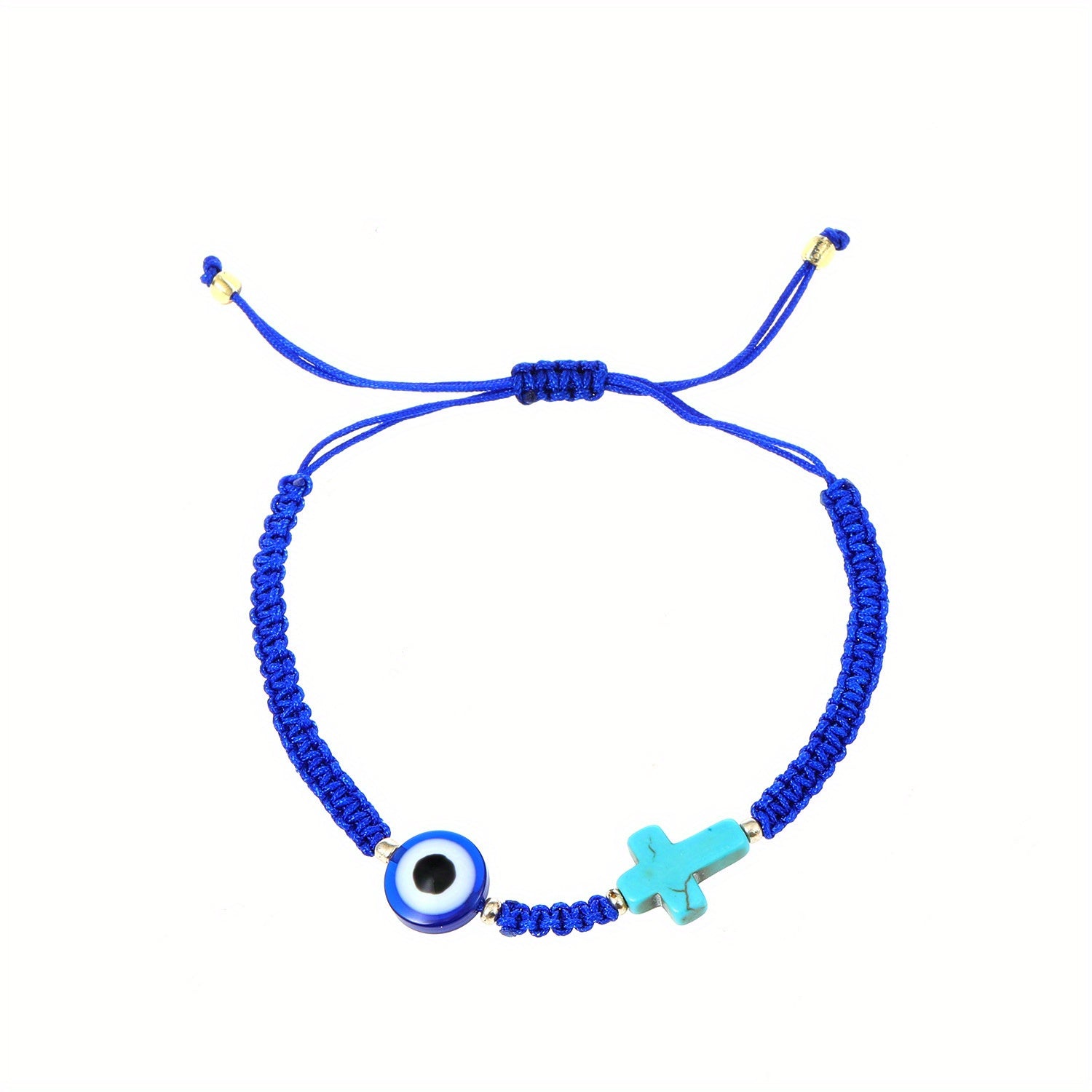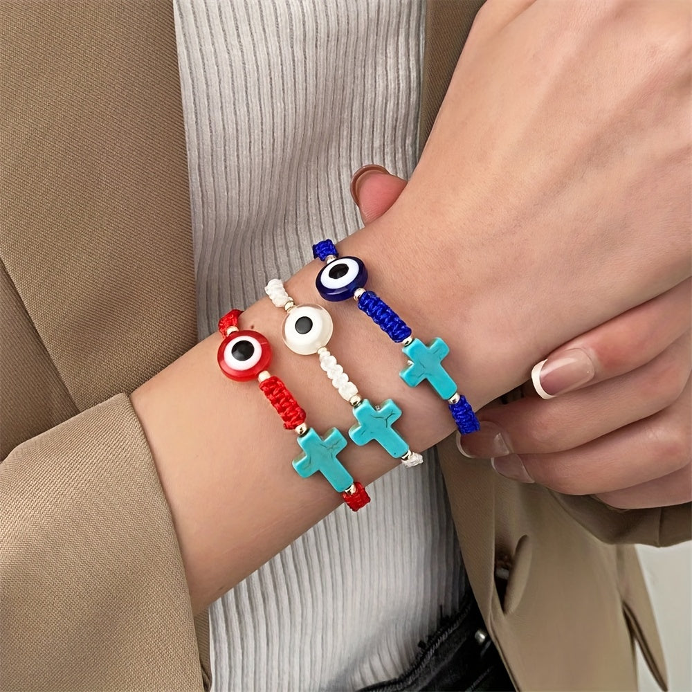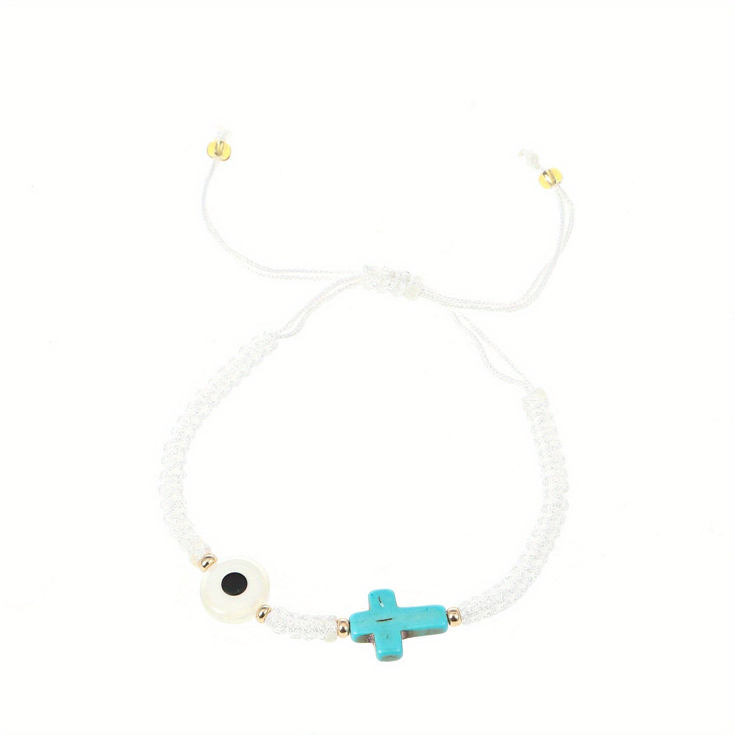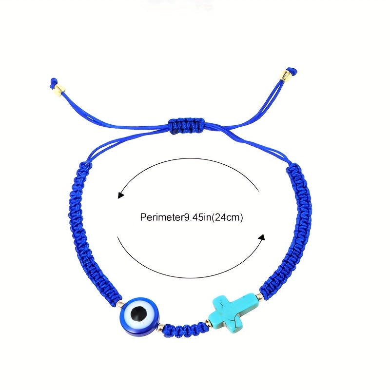 Beautifully crafted Devil's Eye turquoise cross bracelet with braided design for a stylish summer look. Adjustable to fit various wrist sizes.