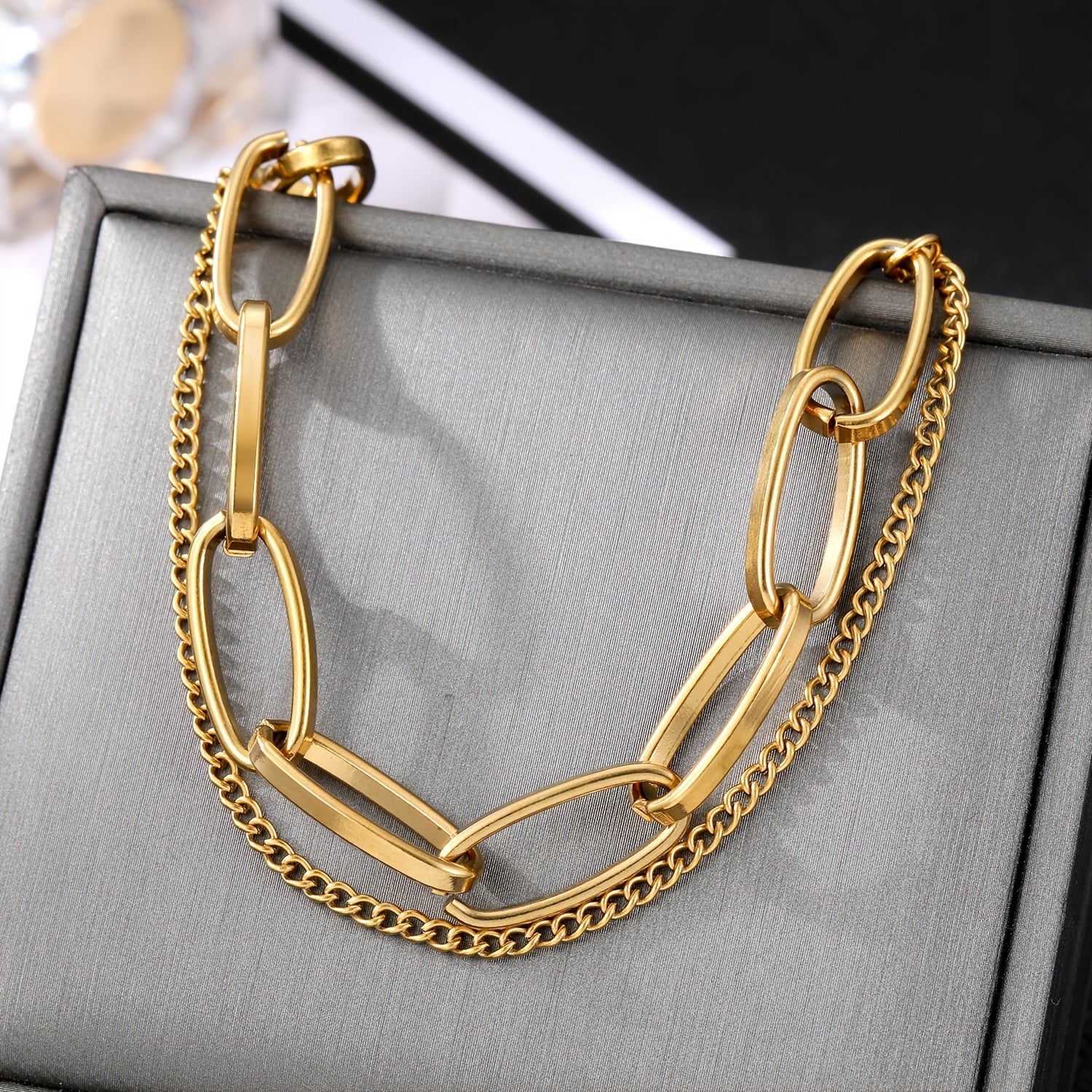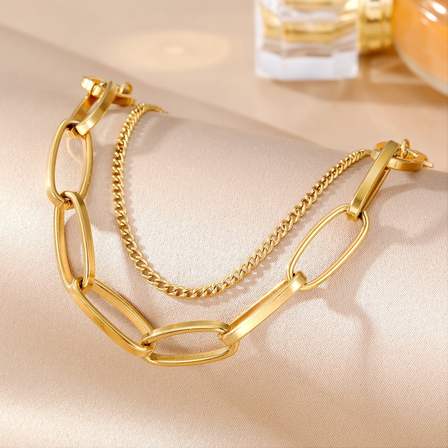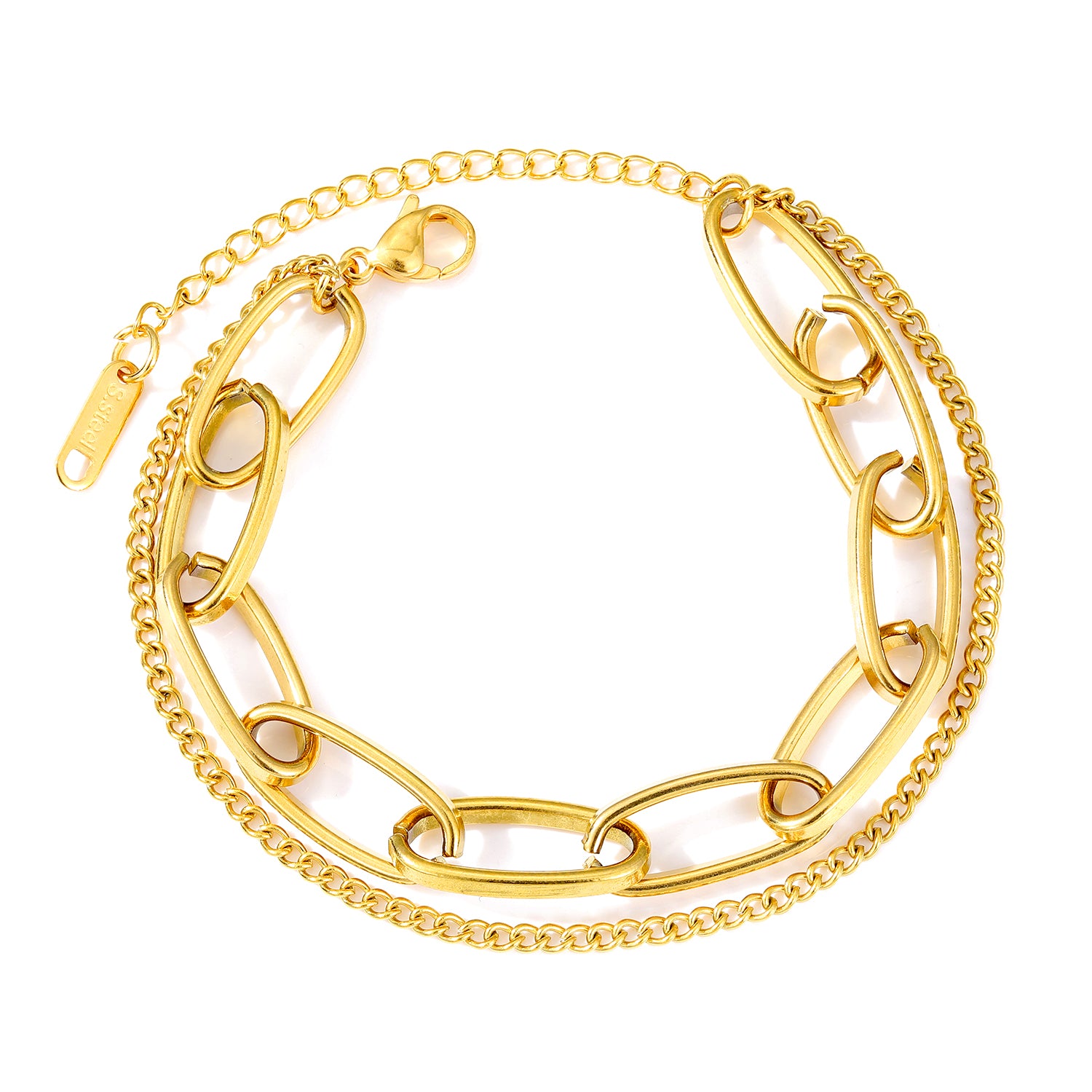 Elevate your style with this double layer chain bracelet crafted from stainless steel. The chunky and thin hollow chains create a unique and trendy look.