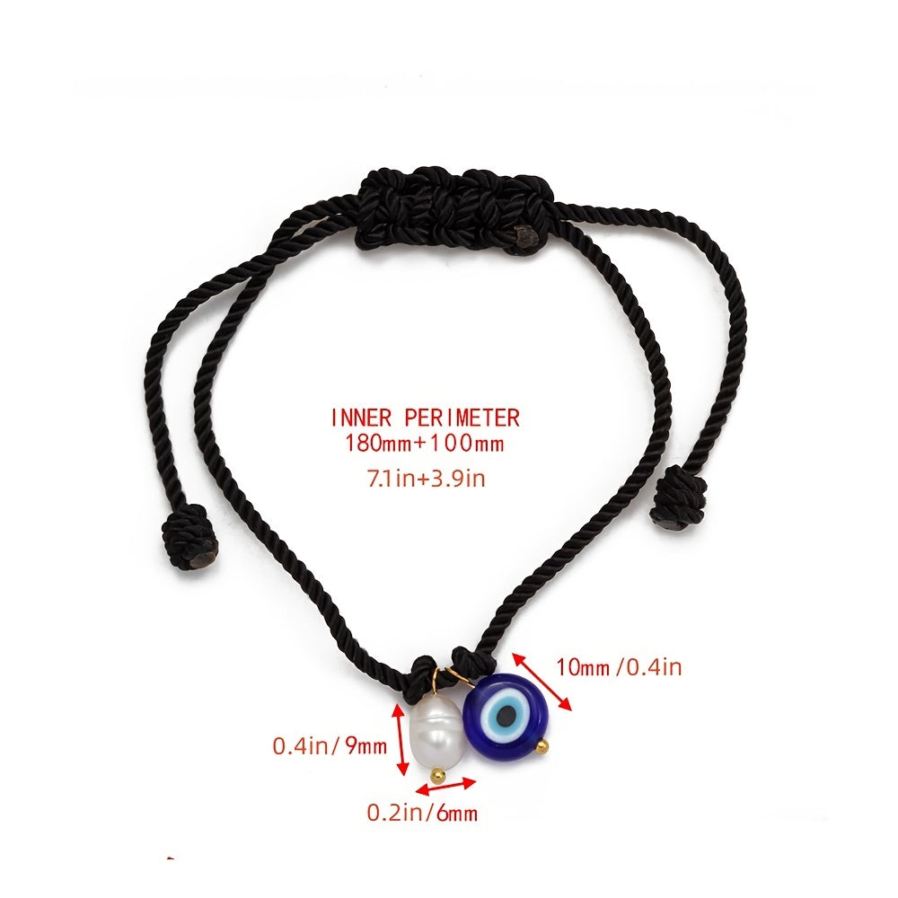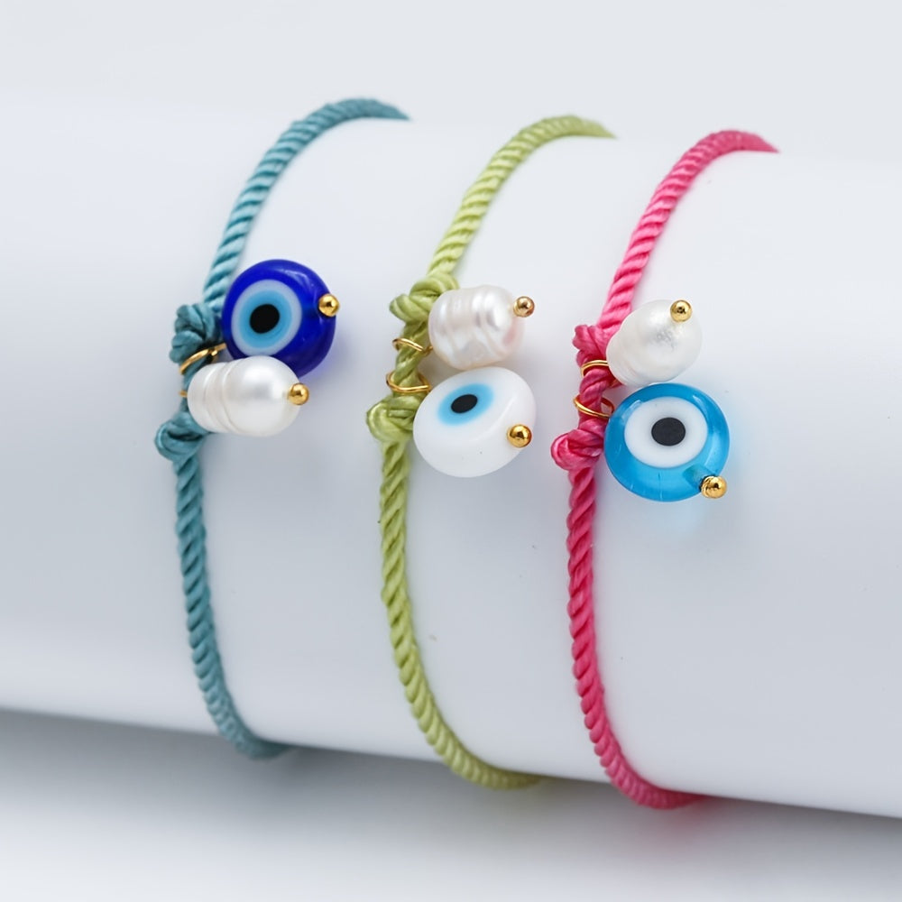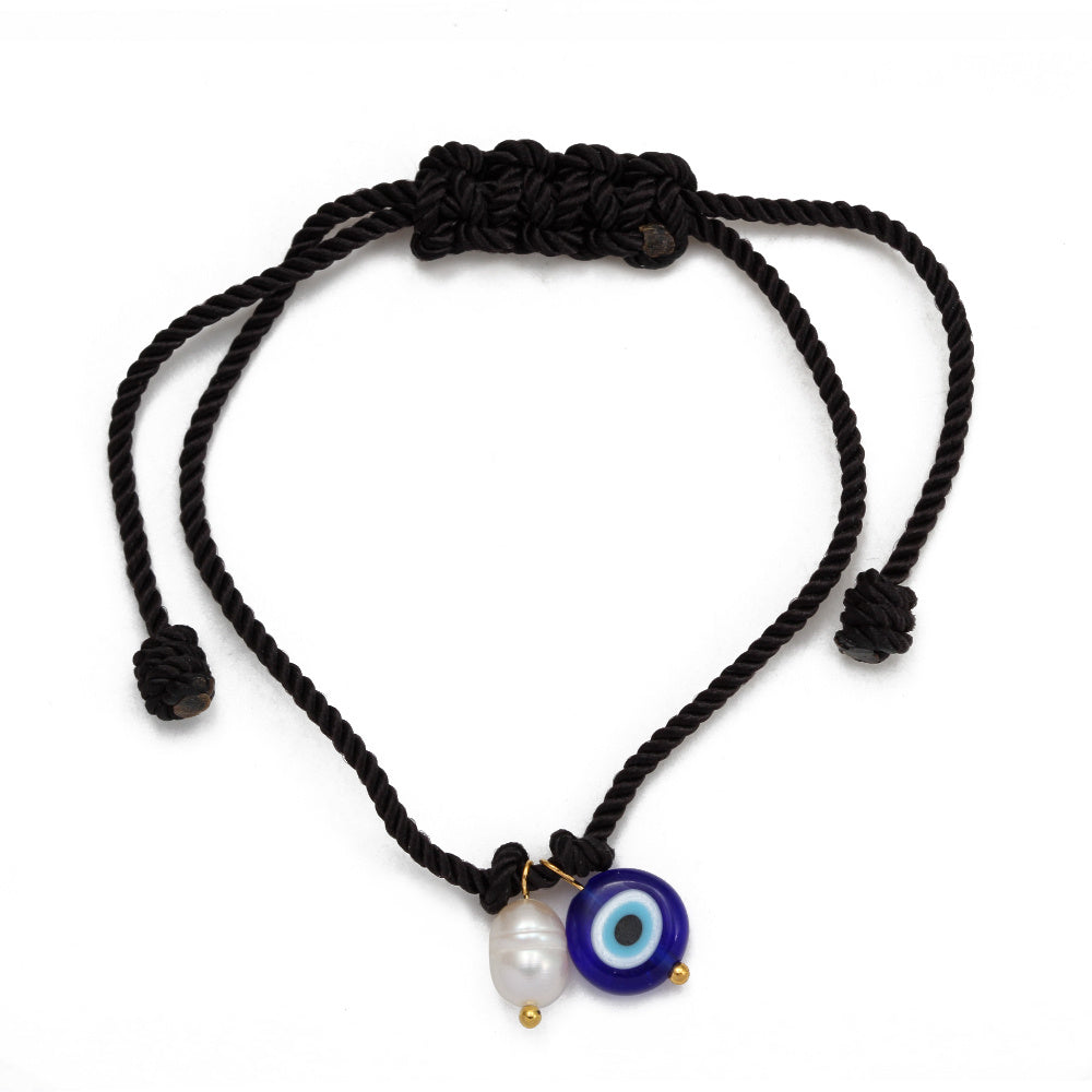 This beautiful bracelet features freshwater pearl and evil eye bead on an adjustable braided rope. It is a lucky eye jewelry that can be worn by women, girls, and men.