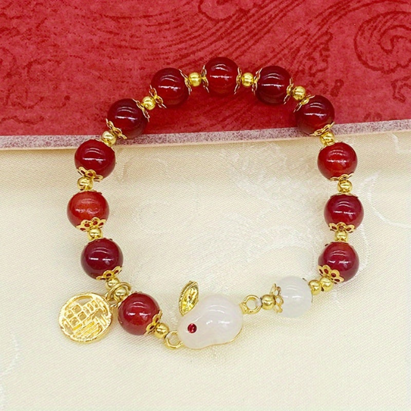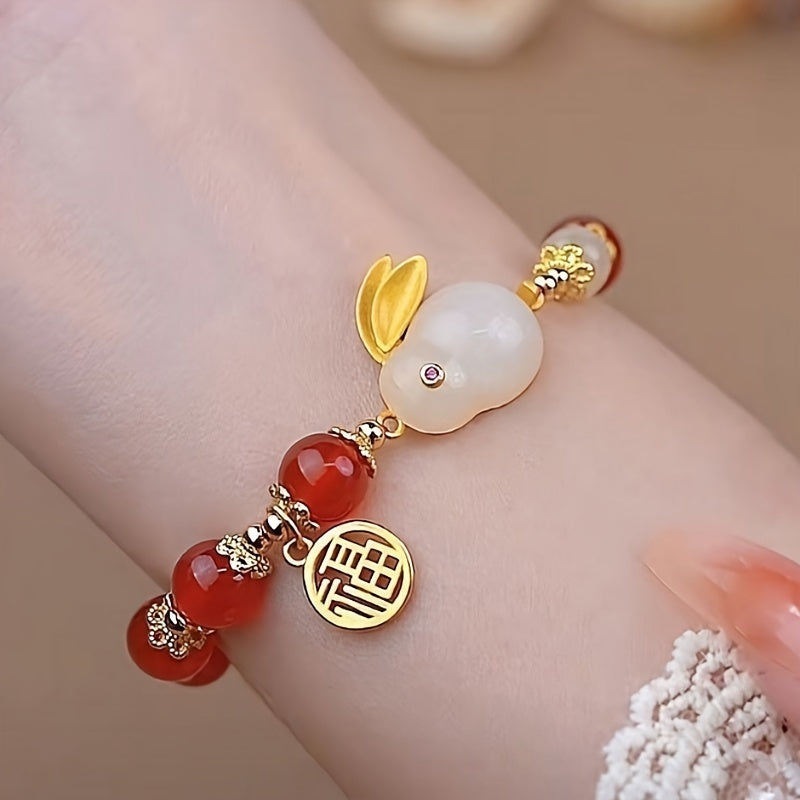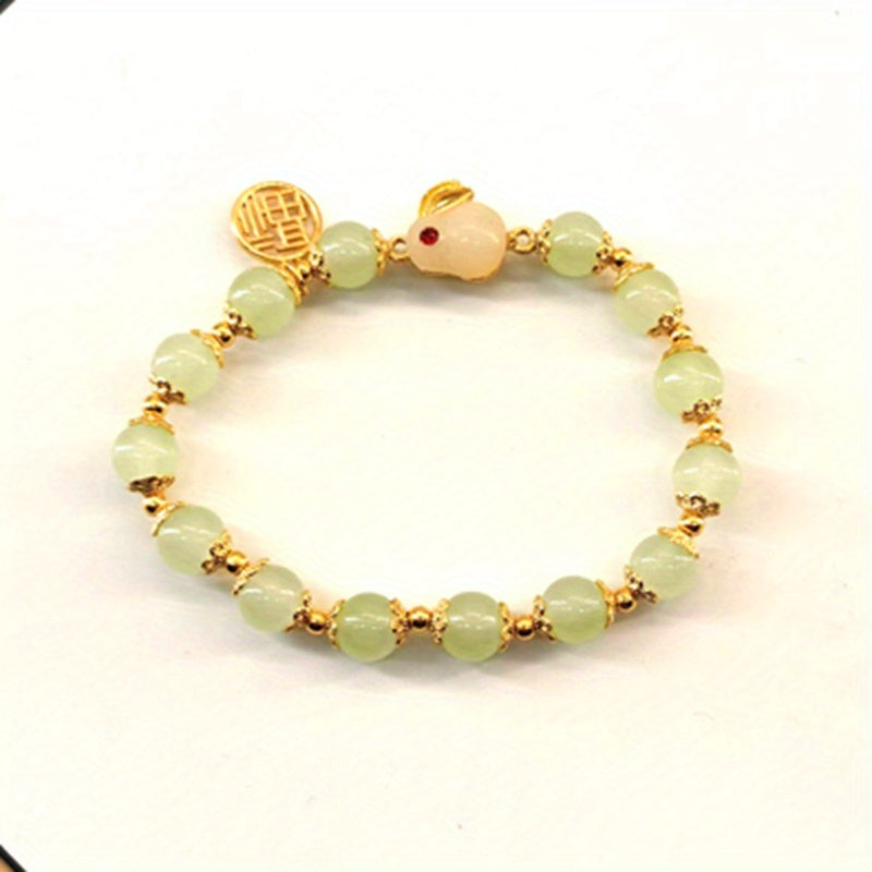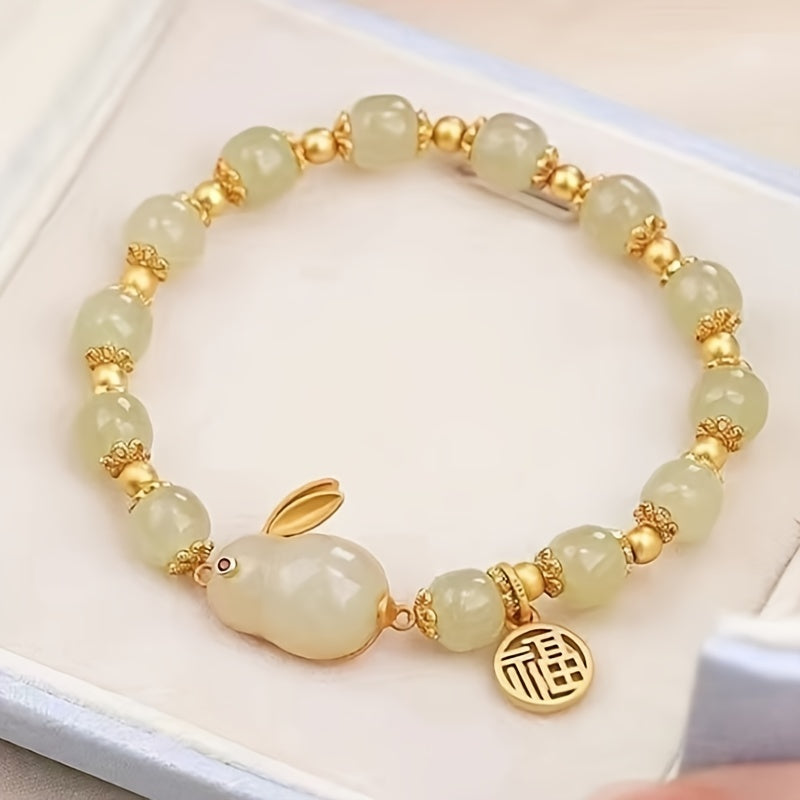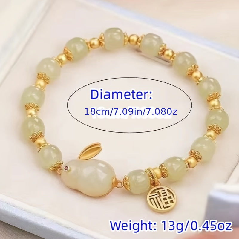 This bracelet features a Fu character pendant and jade beads with lucky rabbit shape beads, symbolizing good luck and blessings. It is a perfect hand jewelry piece with a meaningful design, making it an ideal birthday gift with blessings for Easter.