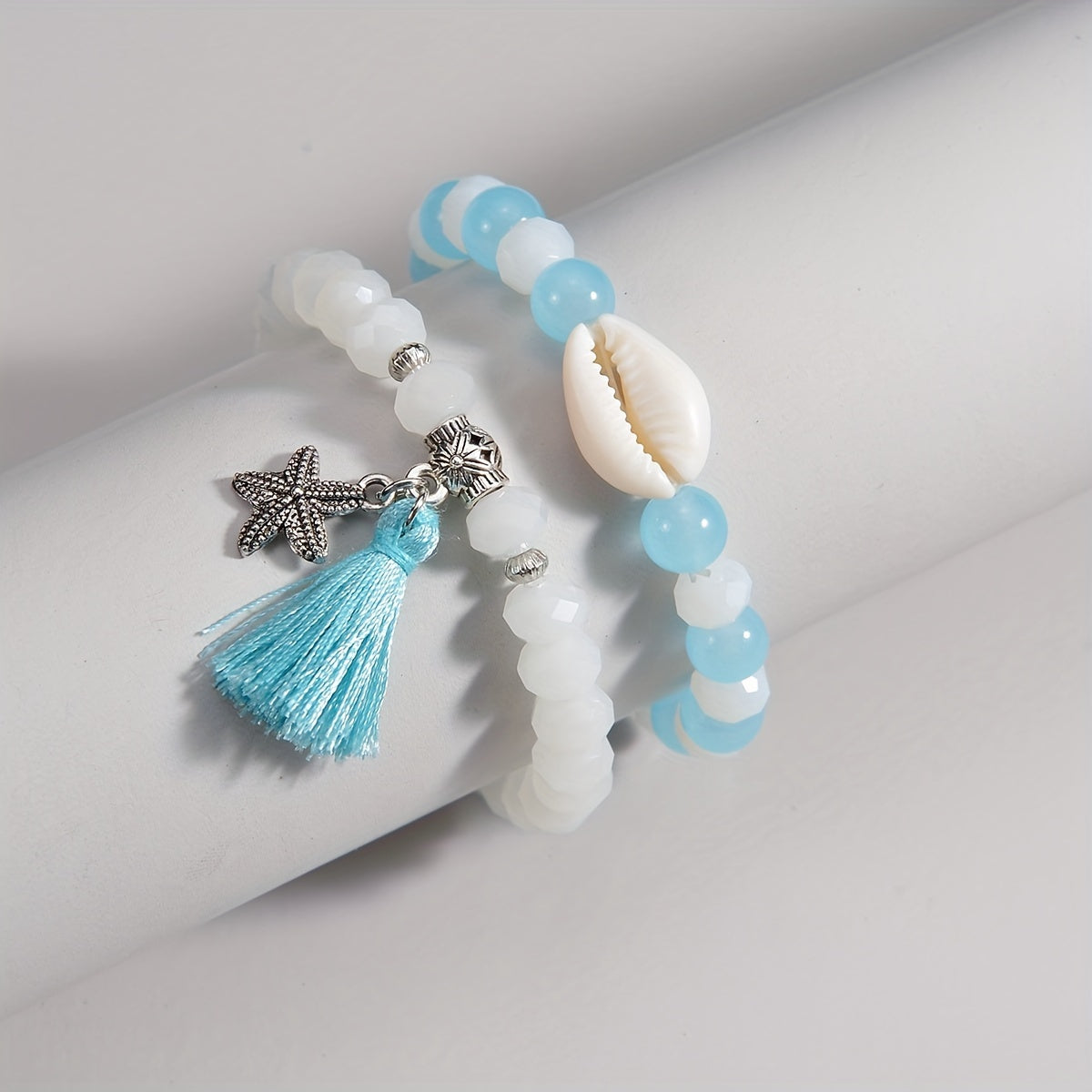 This set of 2 bracelets features glass beads, tassel, and alloy starfish pendant, perfect for summer beach decor or vacation ornament.